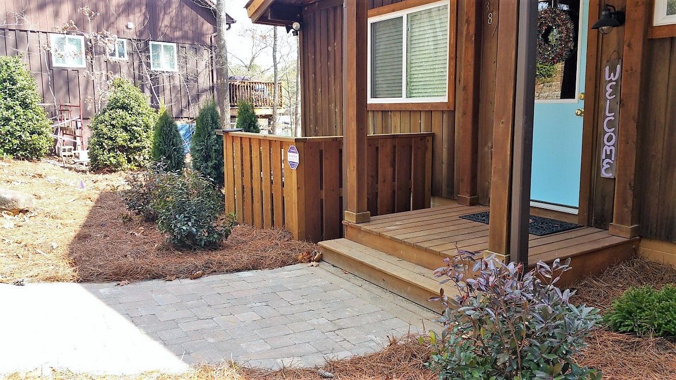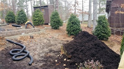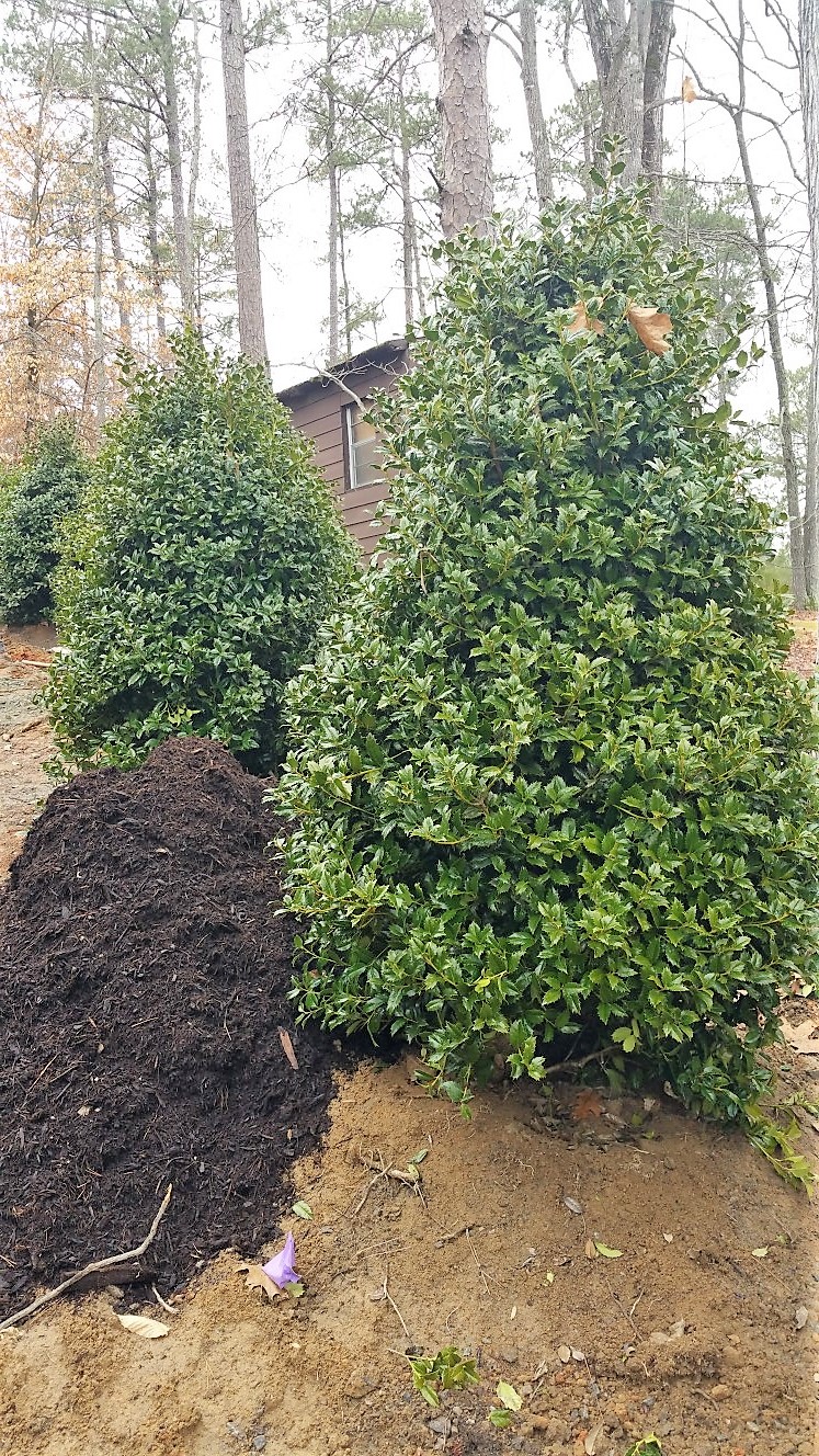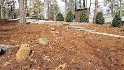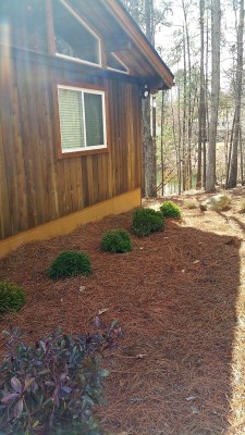 Then we added copious pine straw mulch and plantings along the driveway and foundation walls.