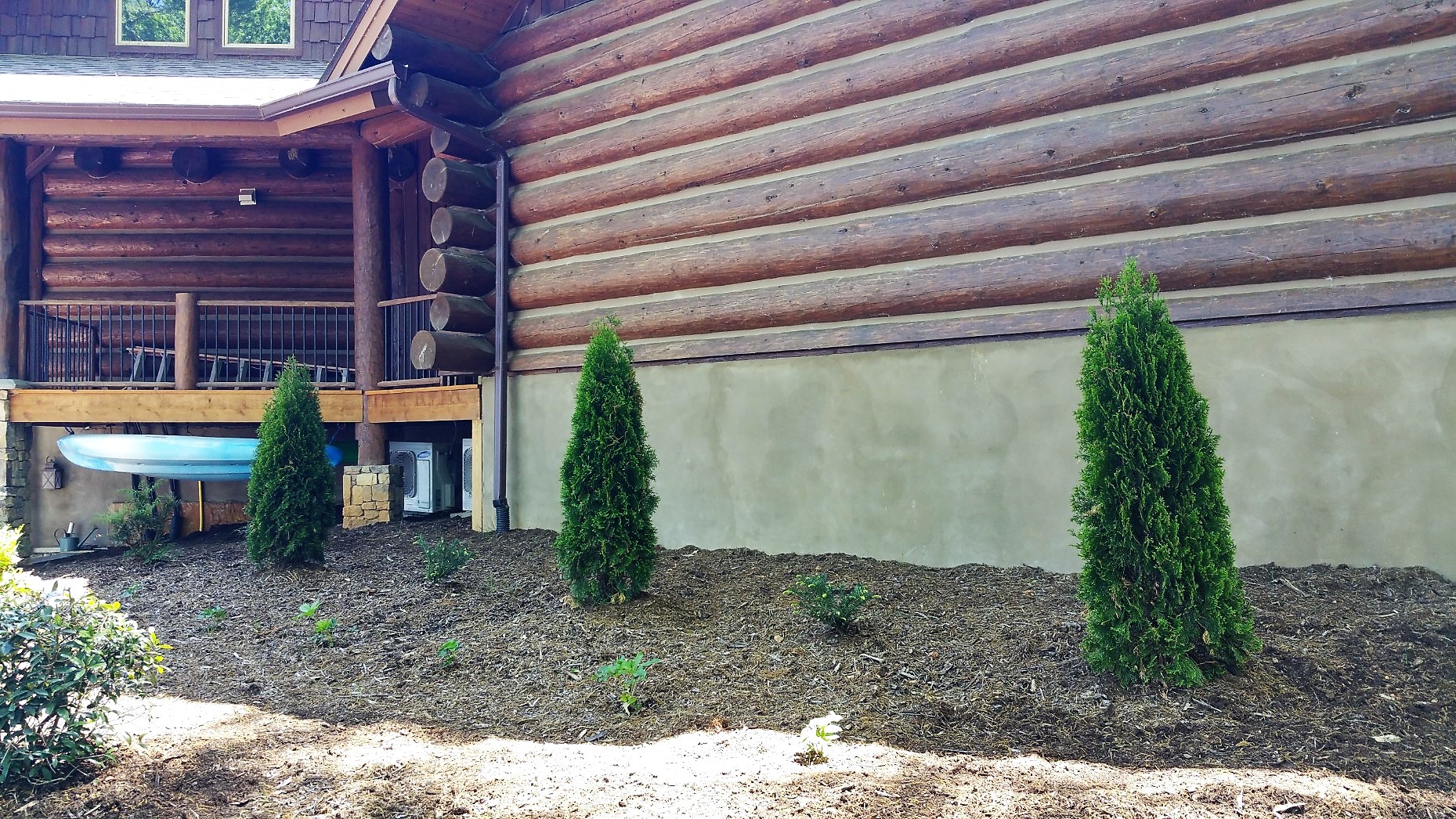 Our crews then installed a copious blend of plants and shrubs in triple shreaded hardwood mulch around the foundation , including Emerald Green Arborvitaes, Dwarf Cryptomeria, Lenten Roses, Oakleaf Hydrangea, and many others.