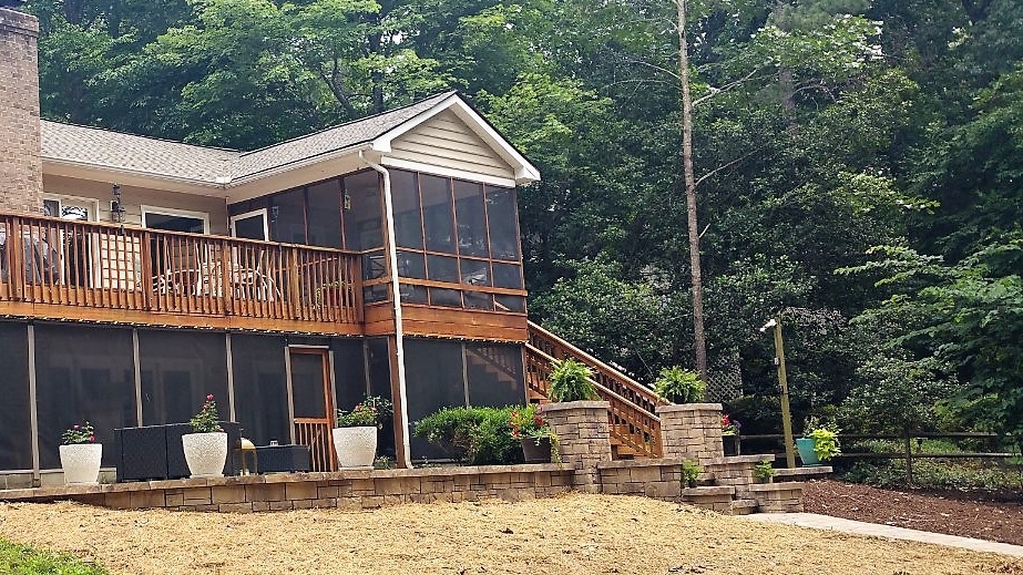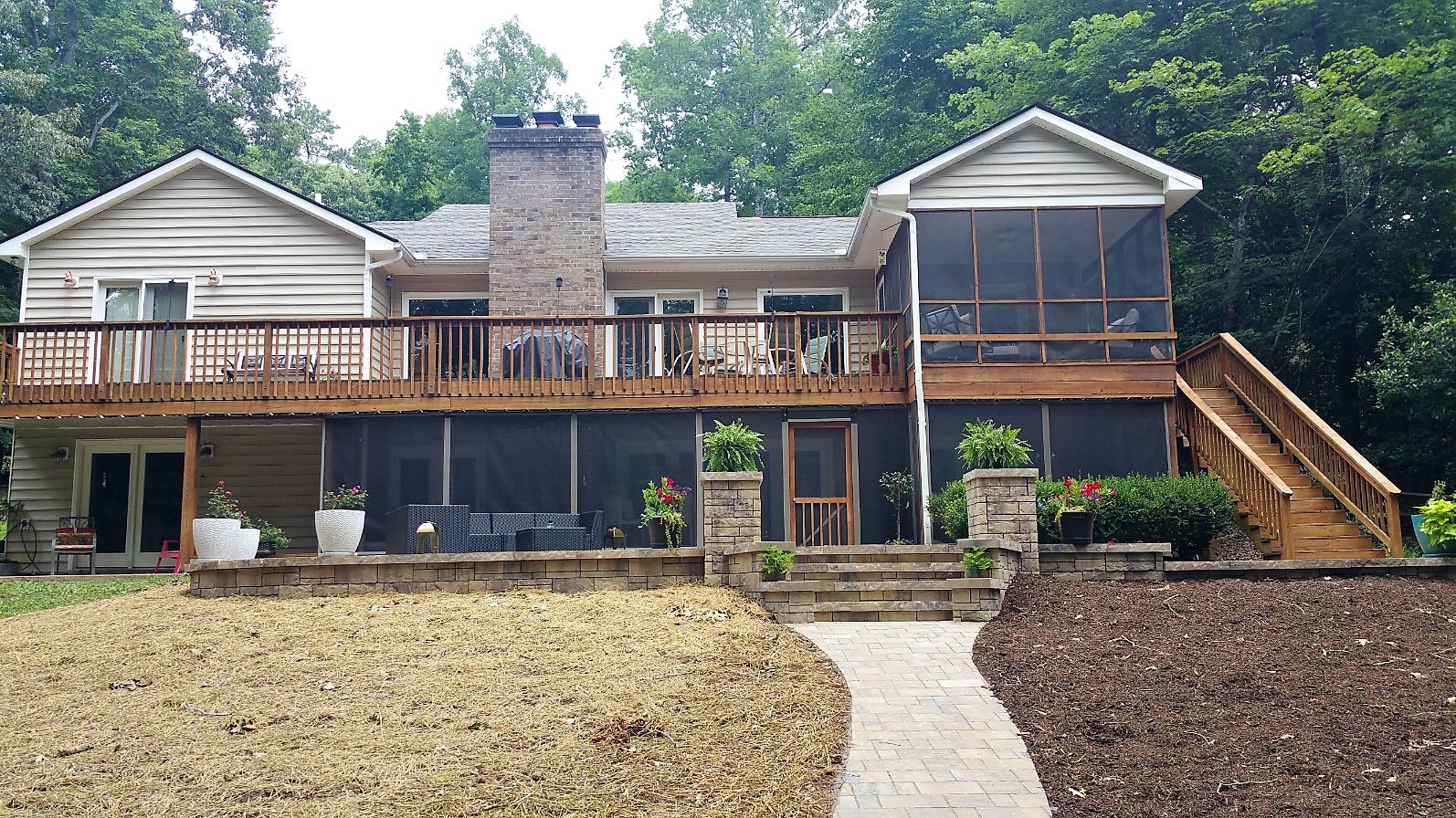 You saw this project when it began with this circular patio. The rest of the project included an 18′ x 50′ patio along the back screen porch, connecting to the lakeside boat house by a 110′ walkway.