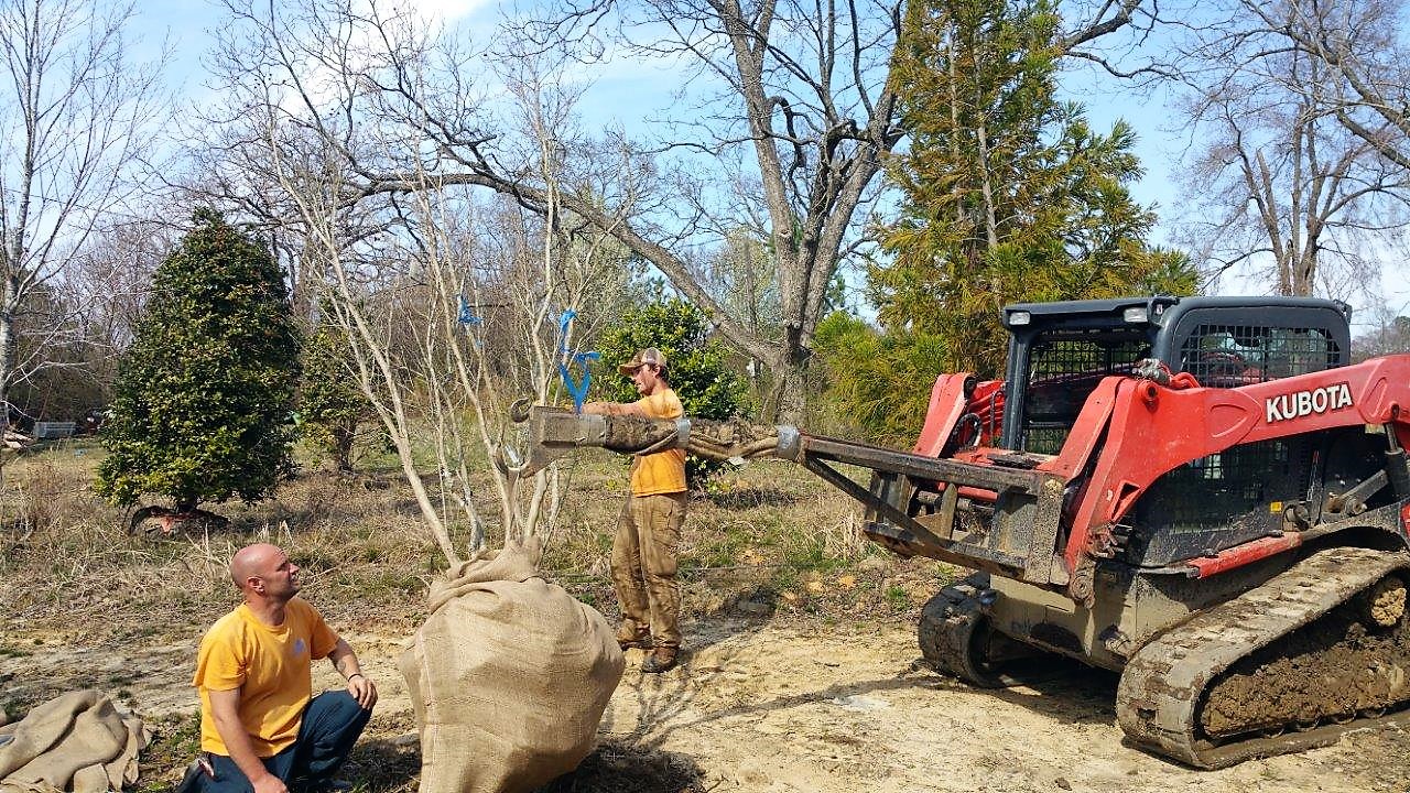 Dynamite crape myrtle, that is. This crape will burst great red blooms come summertime, but for now it is dormant and being prepared by our crew for transport to its new home.