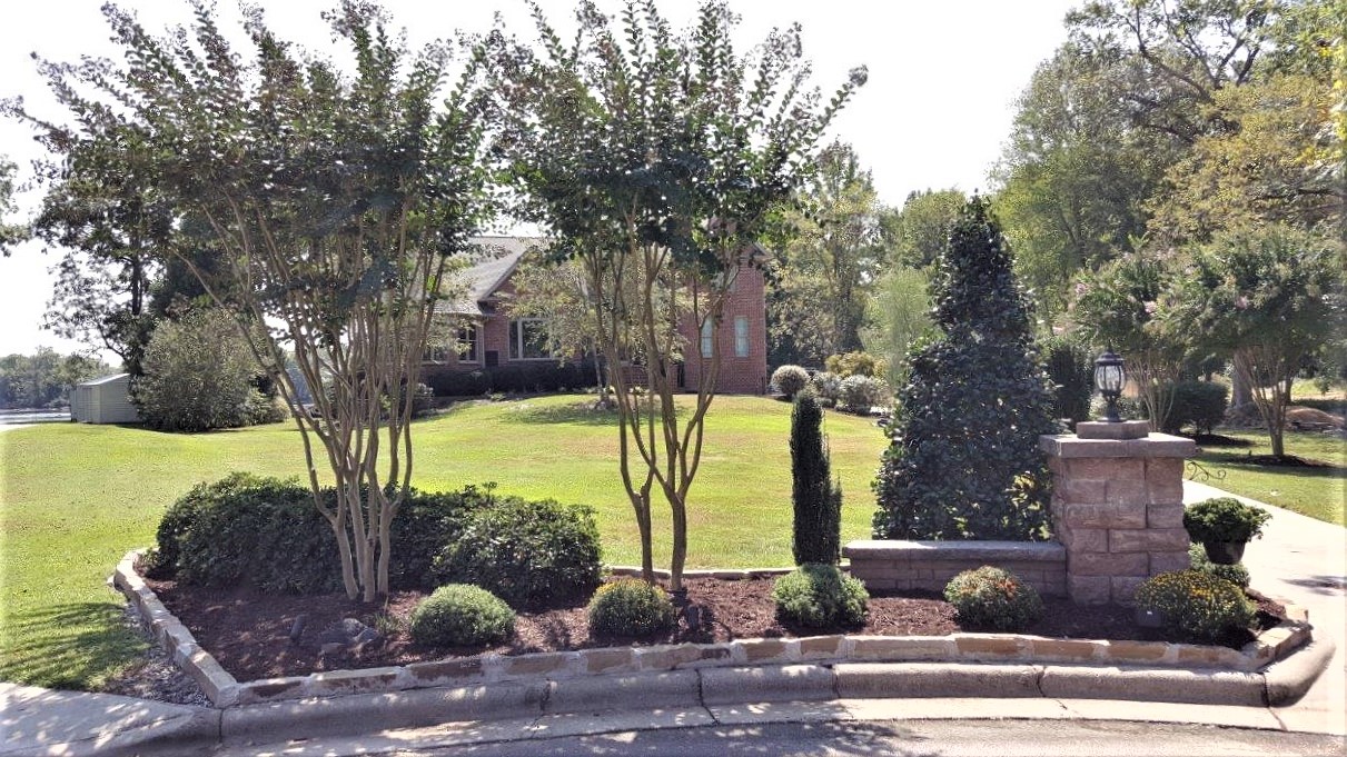 A bit of stonework and mulch combined with newly installed and hanging mums can do wondrous things to a driveway entrance.