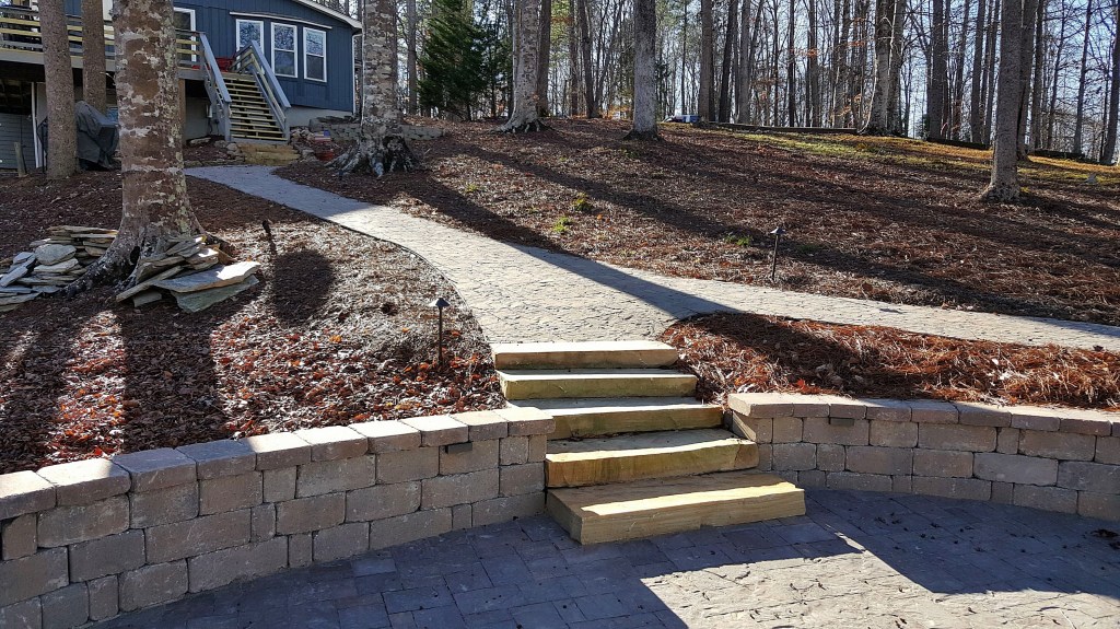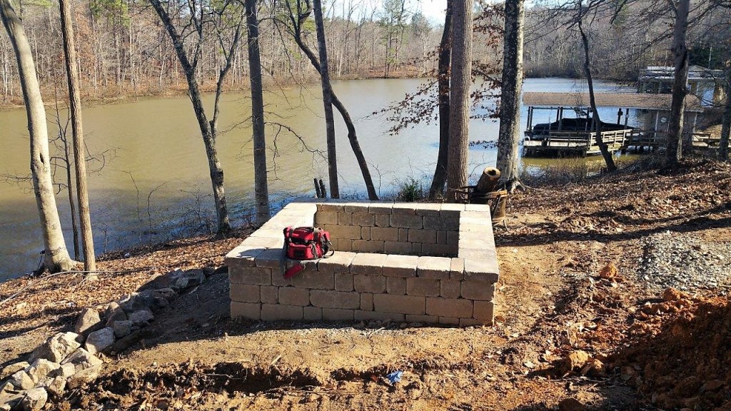 Our crews were into some supplemental work for this customer. Last year we built a football length stone paver walkway, with a lake lookout station centered around a firepit about halfway down. Here’s the firepit area when we finished this project last year.
