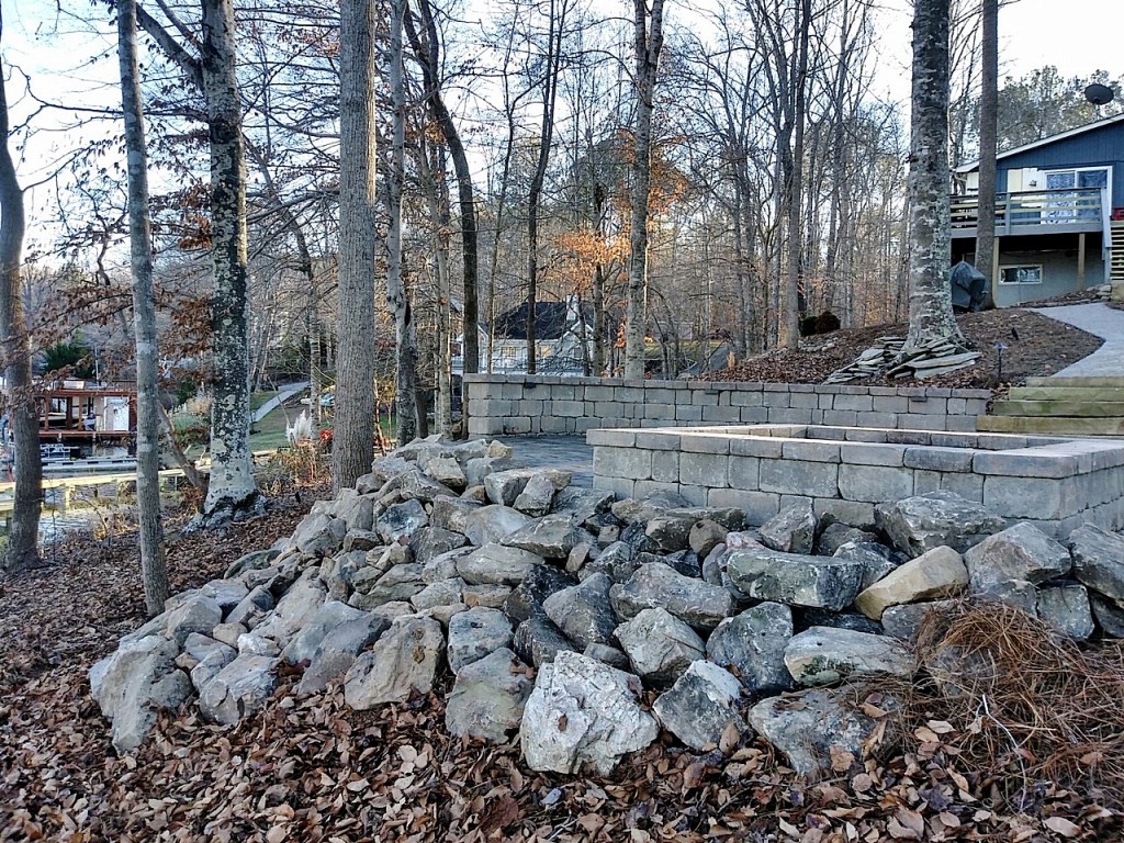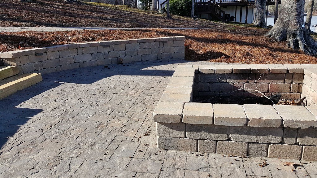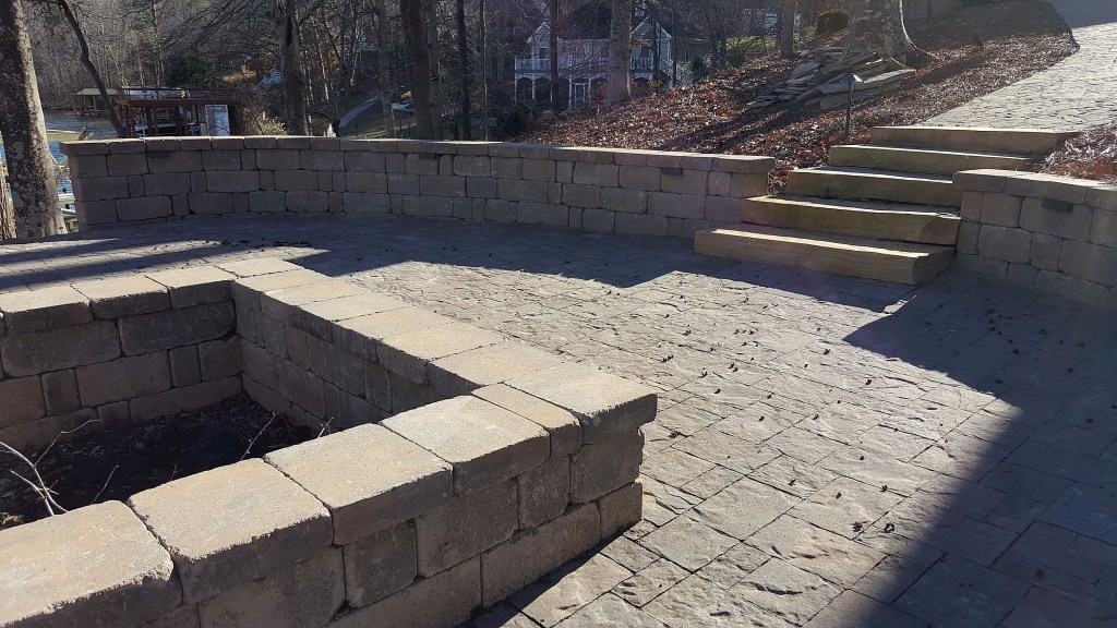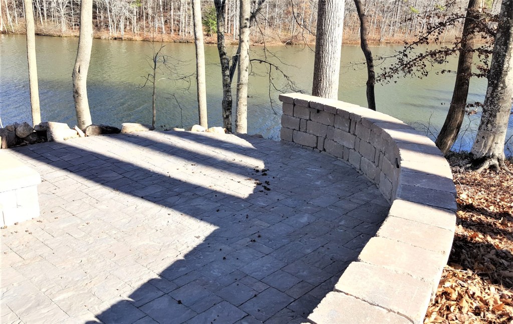 Here’s what we just completed: two 18′ long Colonial Castle Manor Grana walls that double as retaining structures against the slope and as sitting walls around the firepit. We also installed a 400 square foot River Street Lafitt paver patio, matching the existing walkway pavers. Additionally, we brought in two pallets of medium light colored boulders to stabilize the lakeside slope and level out one side of the patio.