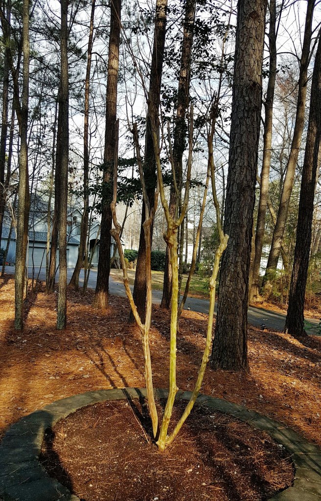 These stately twin crape myrtles will flush out nicely after this pruning.