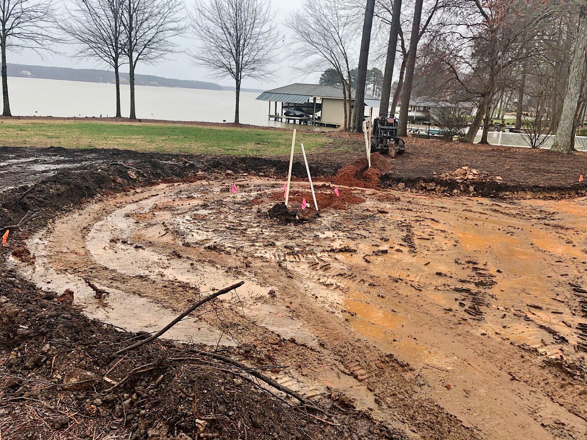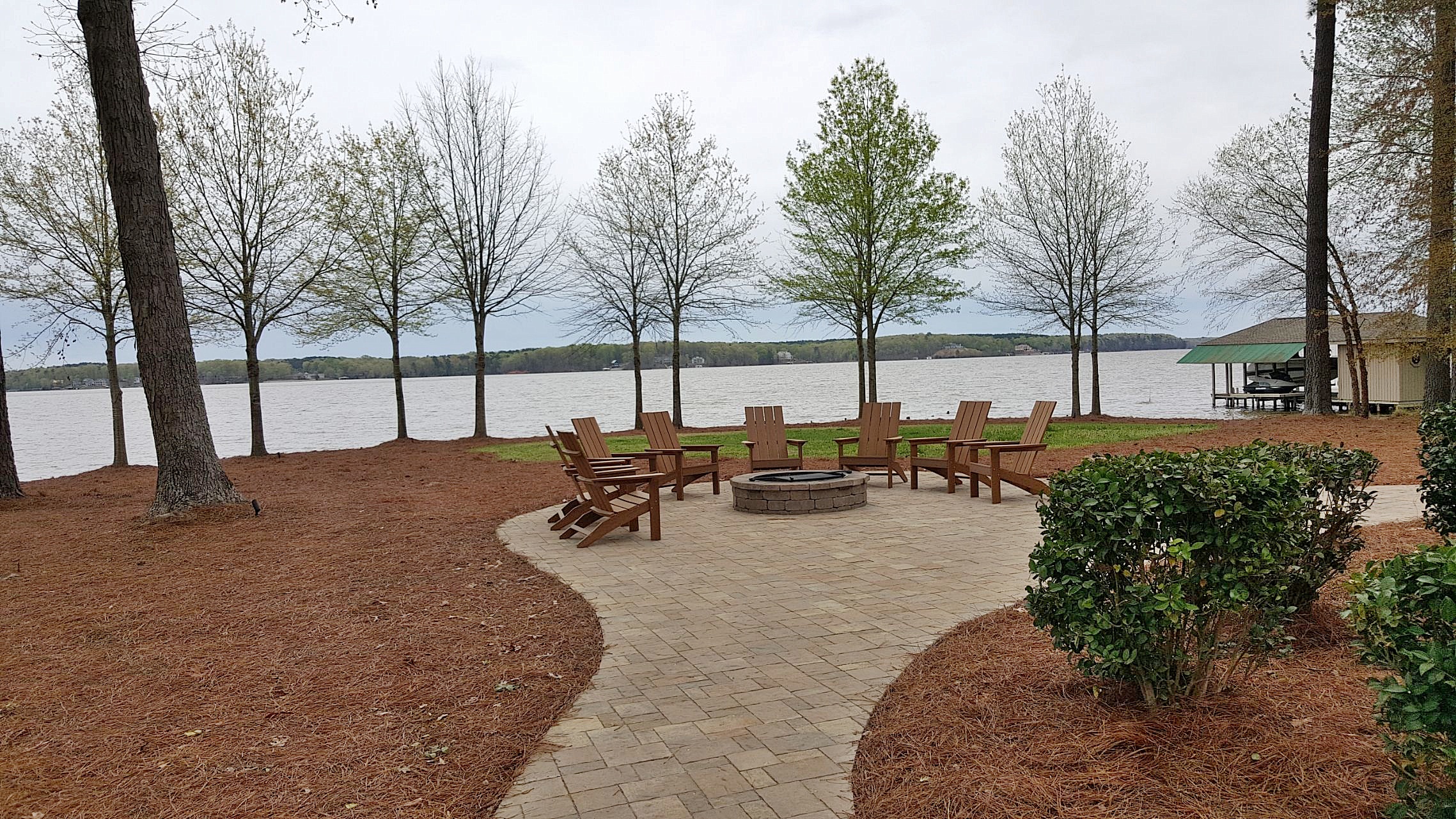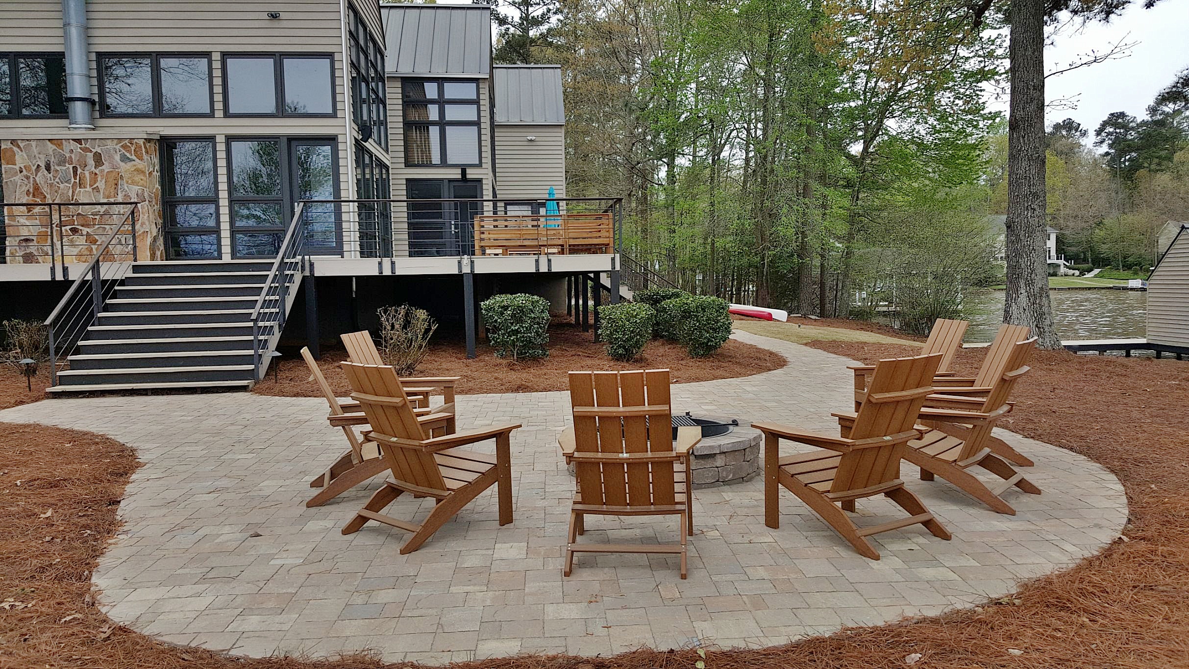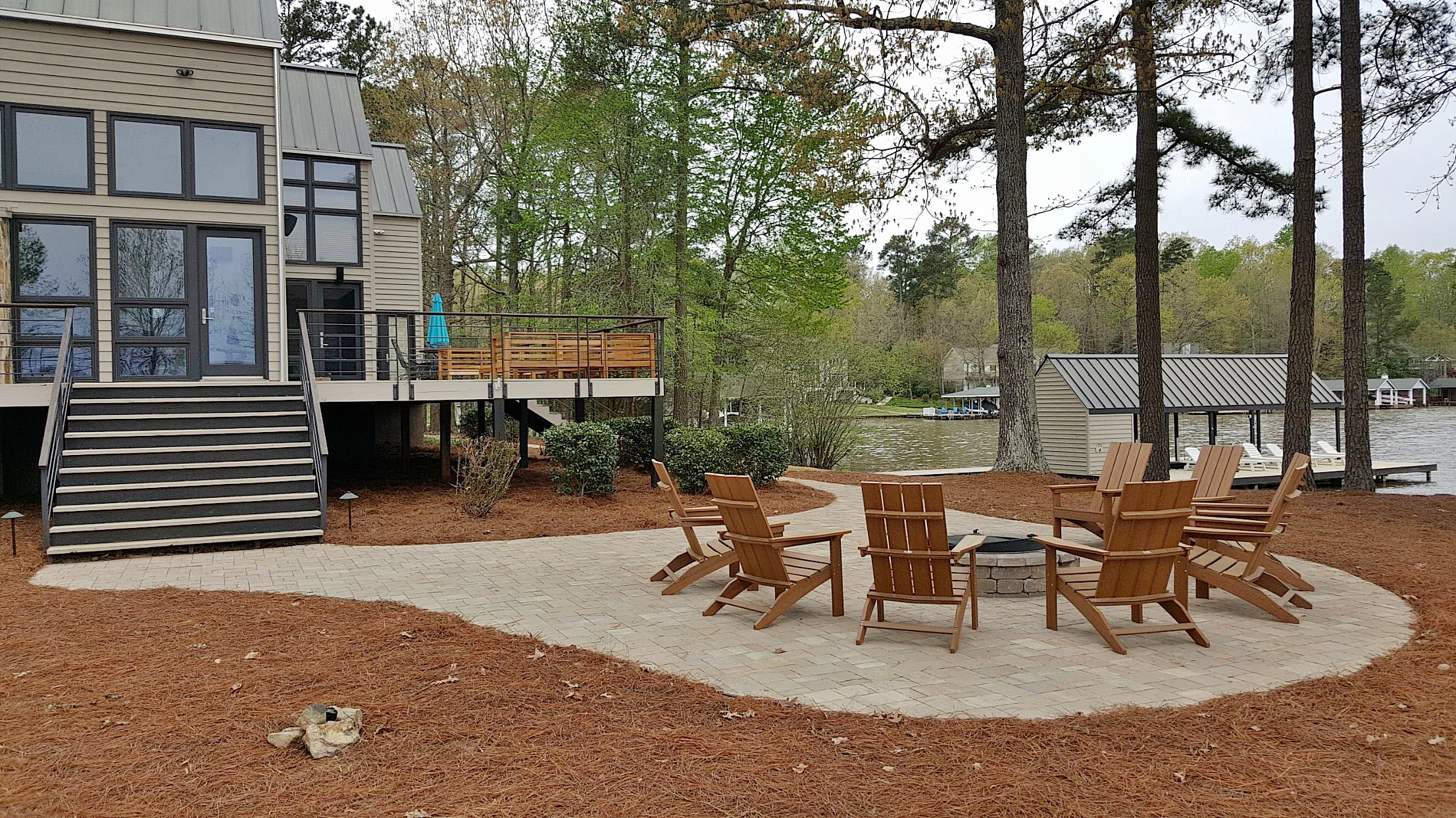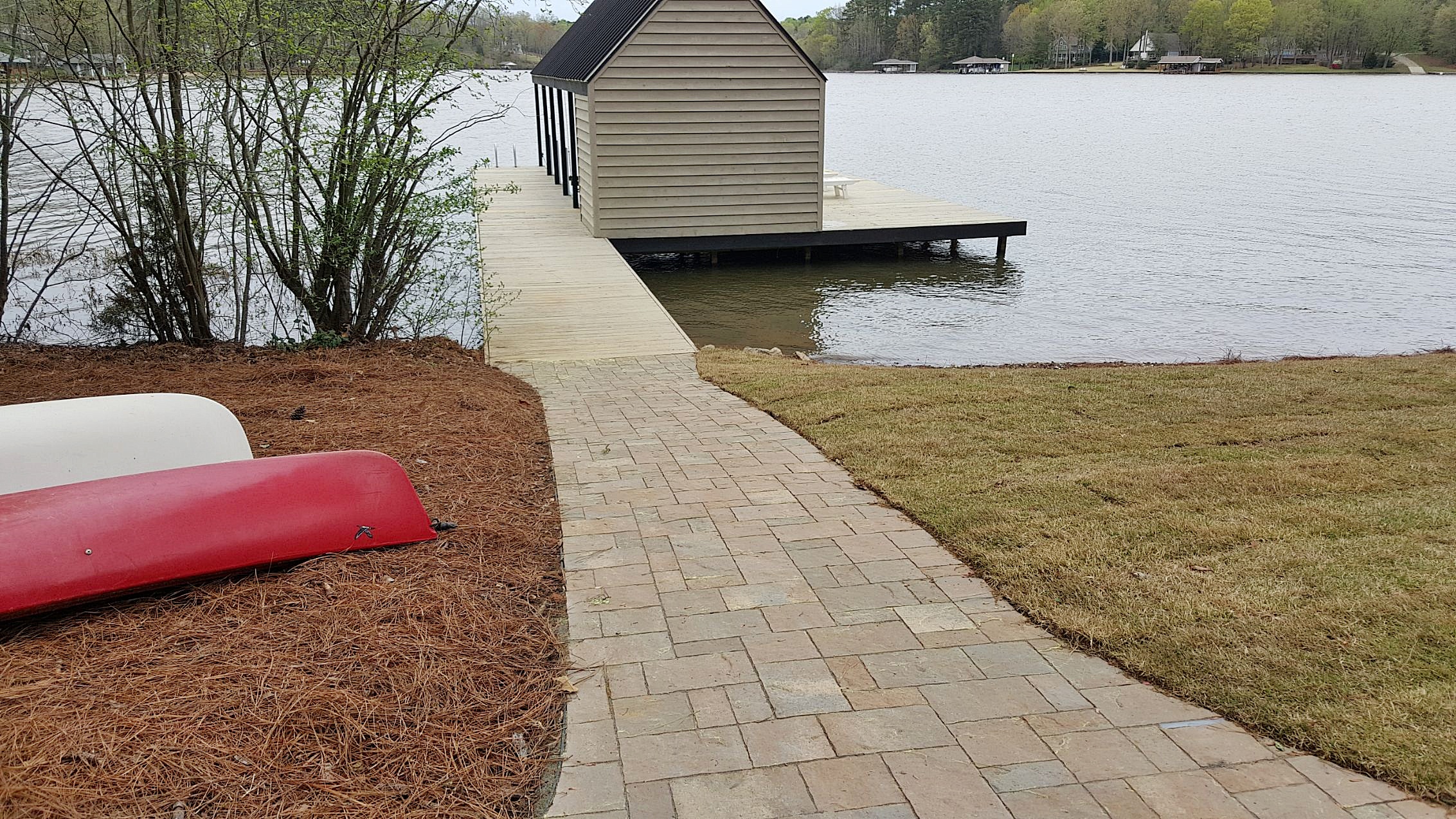 The enhancements included a 160′ long Savannah Lafitt stone walkway connecting the driveway to a lake side patio, with a lateral branch to the boat dock.