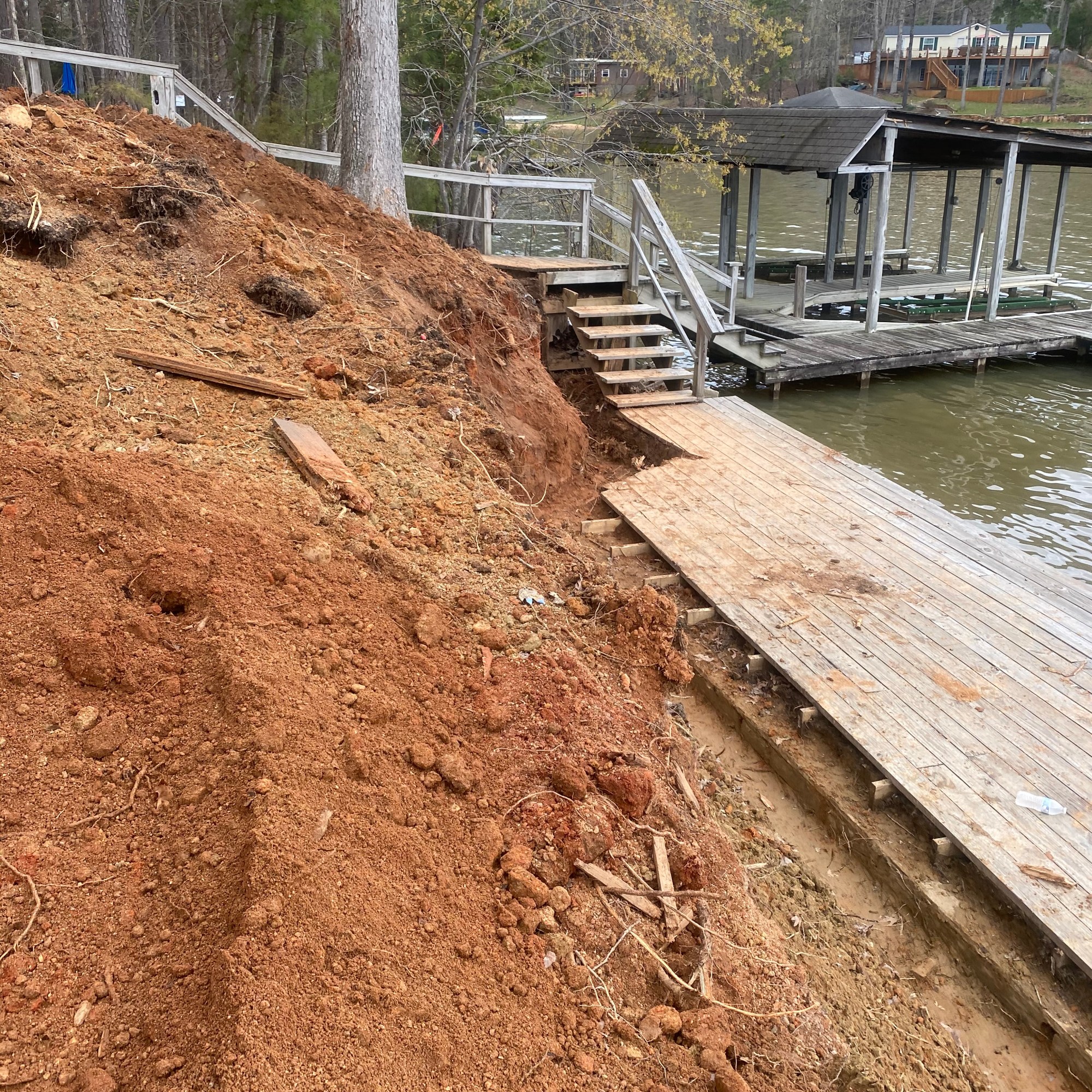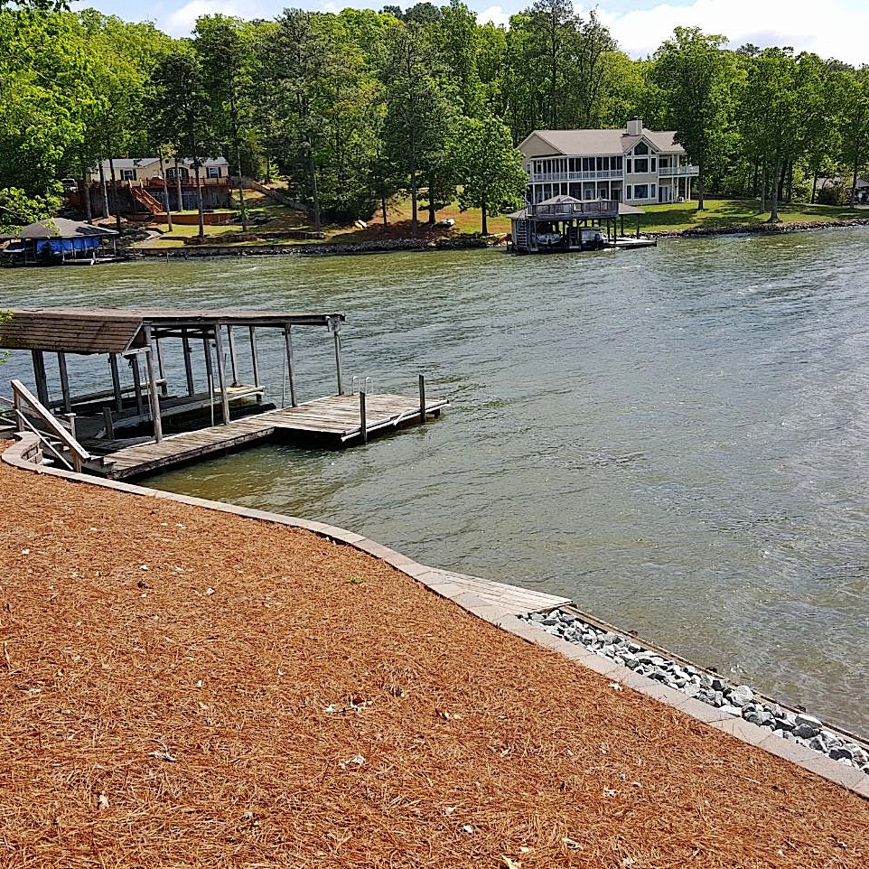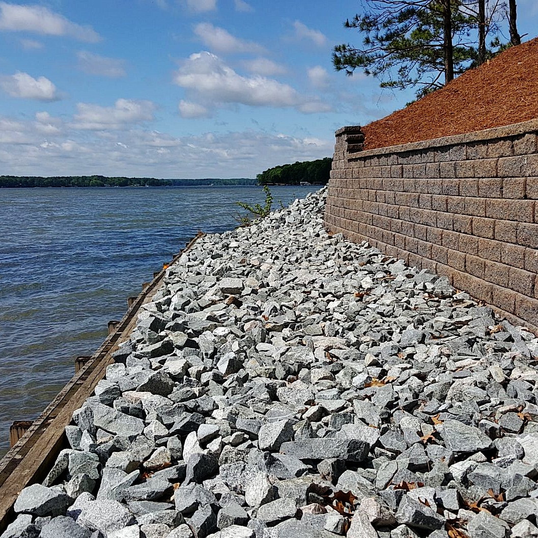 As promised, here are the finished photos of the lake-slope retaining wall project, posted here.