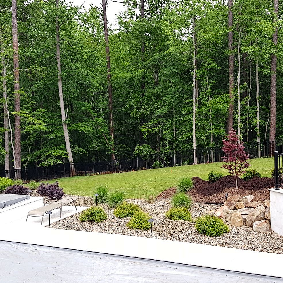 Our work then included more than a dozen different plant varieties, bermuda sod, and night lighting. We came back this year to install fresh garden mulch and a beautiful stone mulch known as Delaware Chalet River Stone. Click on any photo for a closer look.