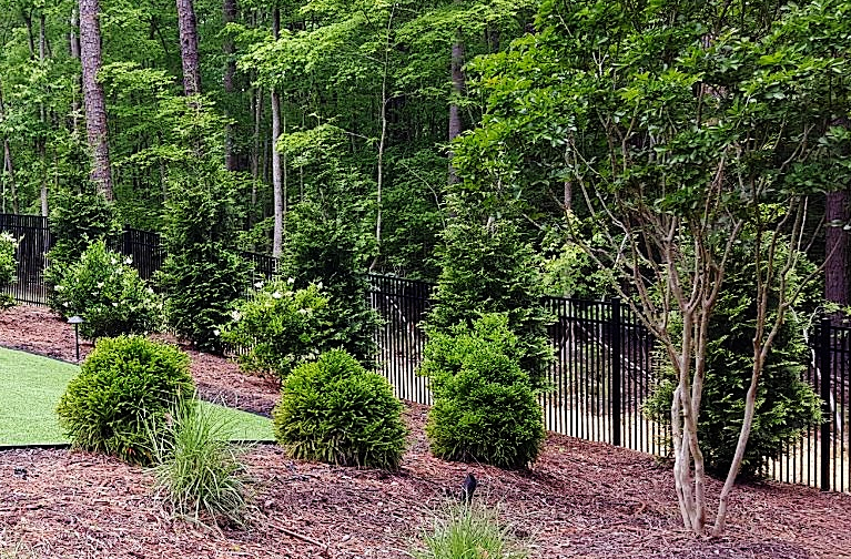 We couldn’t let you get away without bringing to your attention the Green Giant Arborvitaes along this fence line, and the specimen Crape Myrtle.