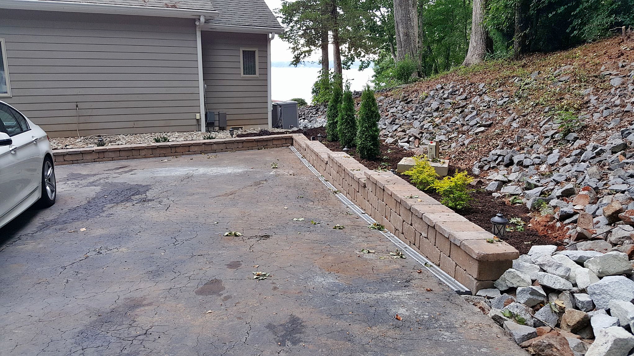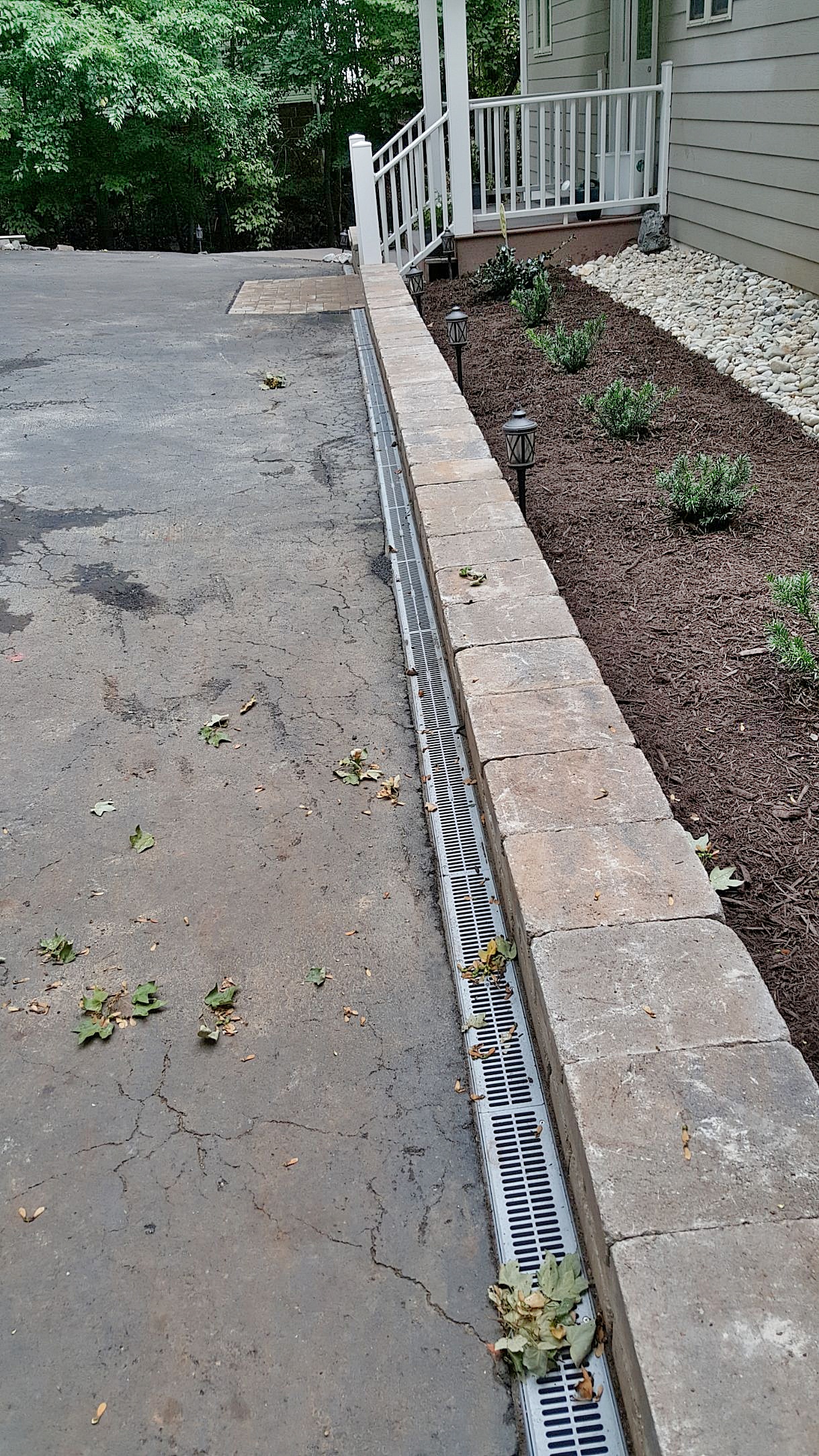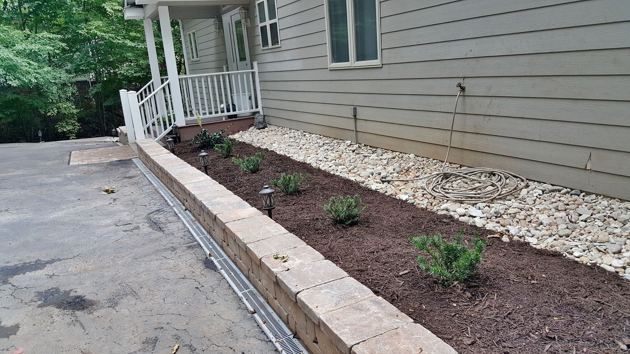 We came to this customer’s property to do some irrigation repairs, and stayed to introduce some large scale drainage upgrades. Along the way, our guys re-graded the front foundation, installed a 90′ retaining wall and 100 feet of ground gutters, replaced and upgraded a lot of plant material, mulched and mulched again. Oh, and rip-rap, tons of rip-rap to corral the water in the important run-off ditches around the house.