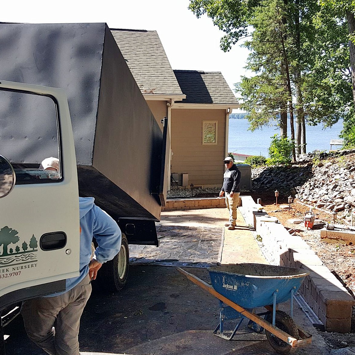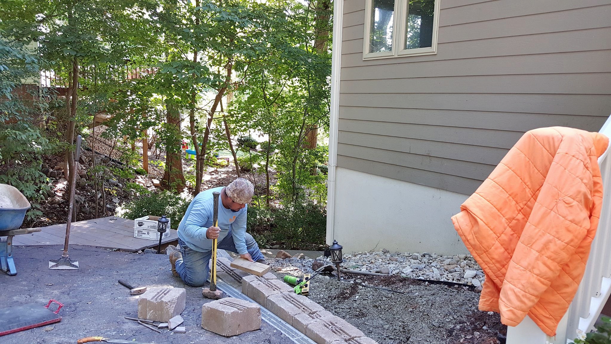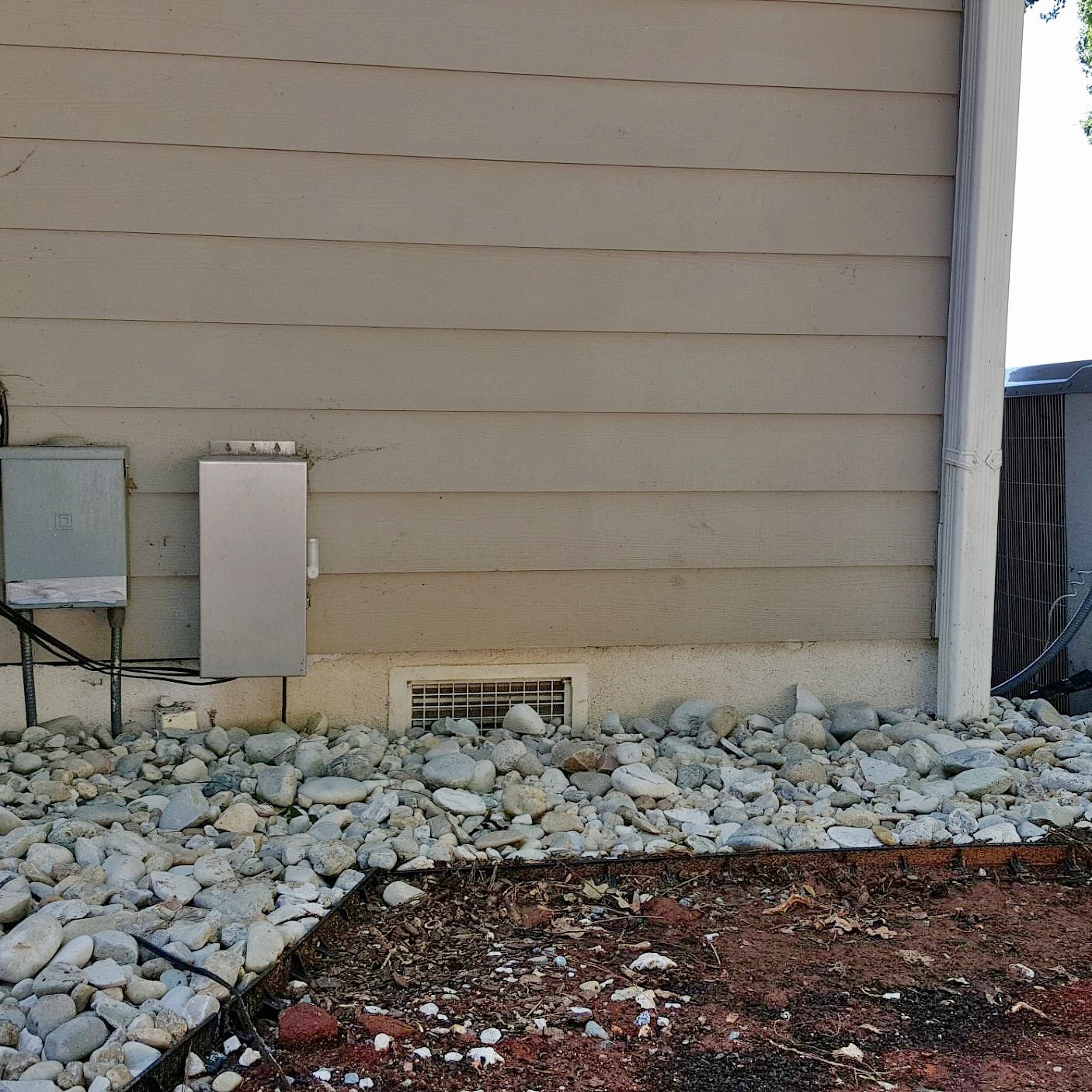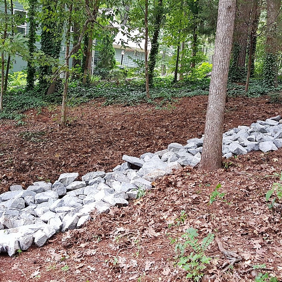 We came to this customer’s property to do some irrigation repairs, and stayed to introduce some large scale drainage upgrades. Along the way, our guys re-graded the front foundation, installed a 90′ retaining wall and 100 feet of ground gutters, replaced and upgraded a lot of plant material, mulched and mulched again. Oh, and rip-rap, tons of rip-rap to corral the water in the important run-off ditches around the house.