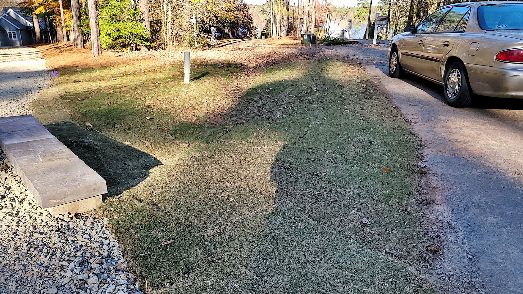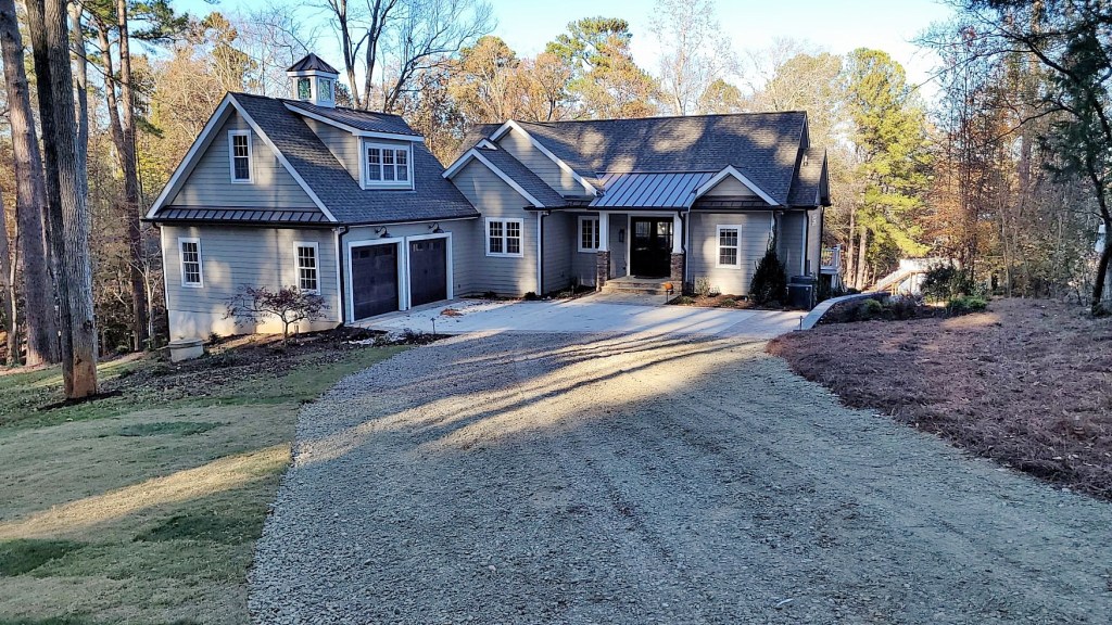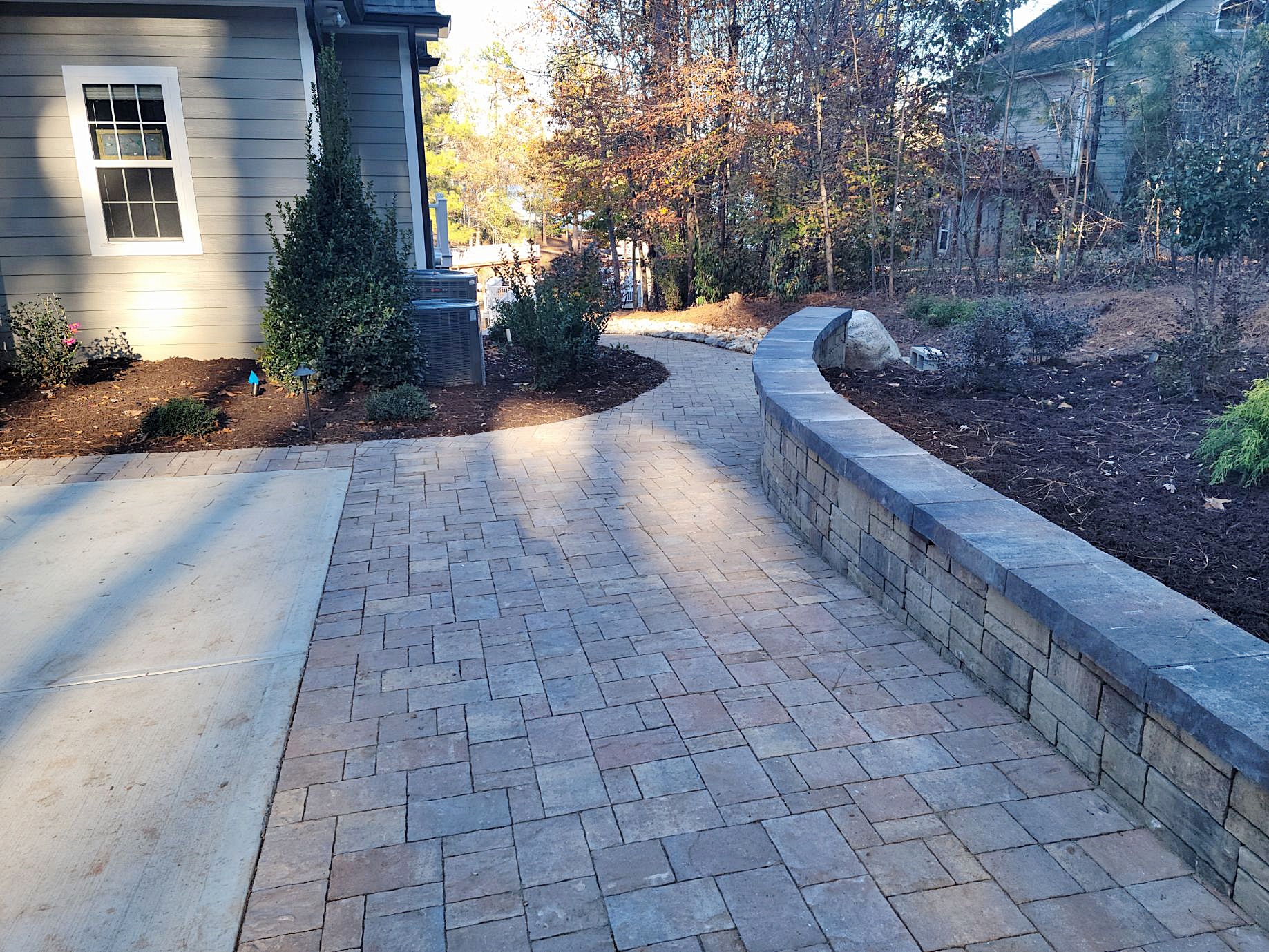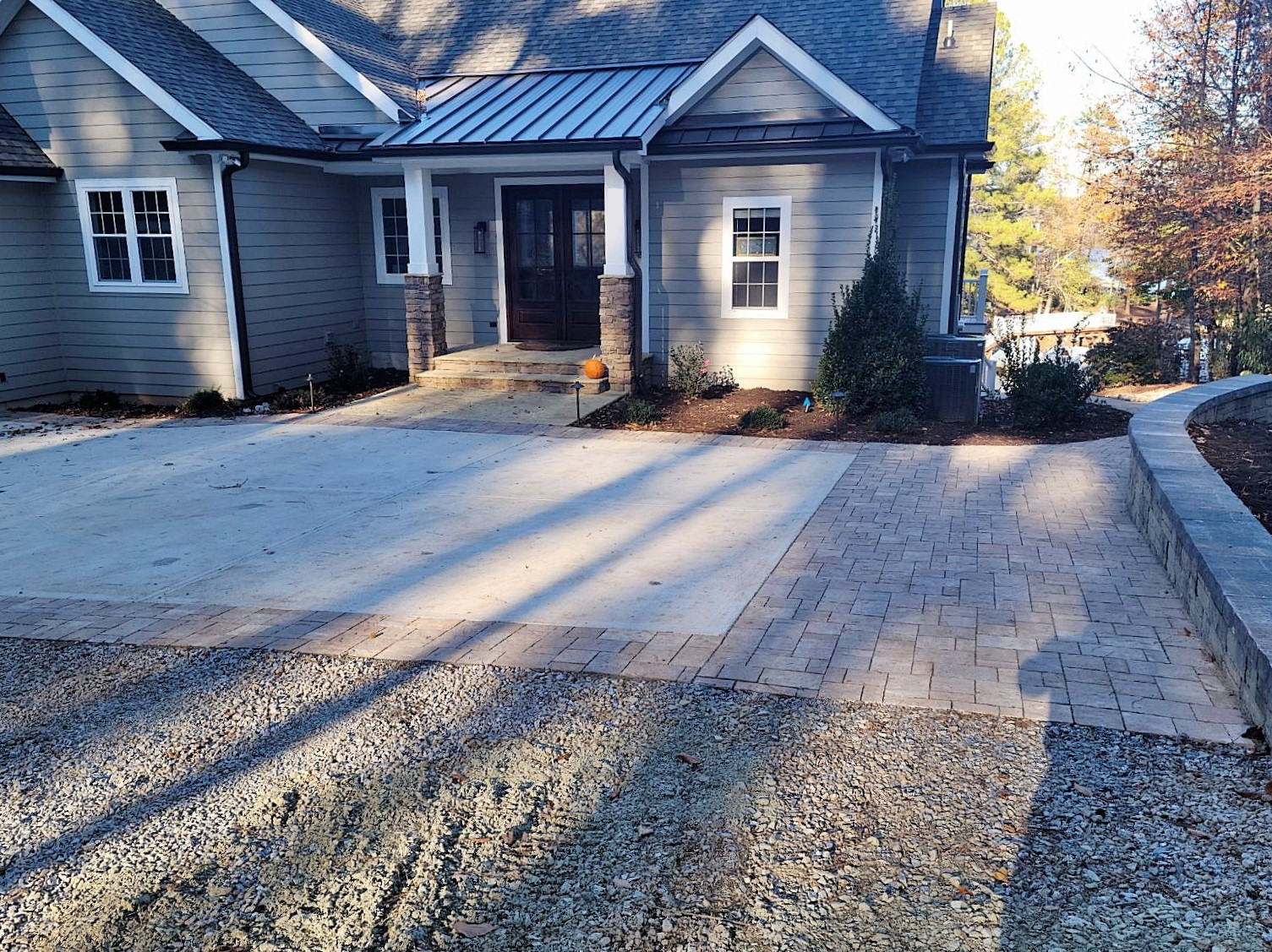 We adorned the driveway pad with a Savannah Lafitt border, and installed a Colonial Castle Manor grana retaining wall along the right side of the parking area to hold the slope and prevent erosion and sediment from washing onto the parking pad.