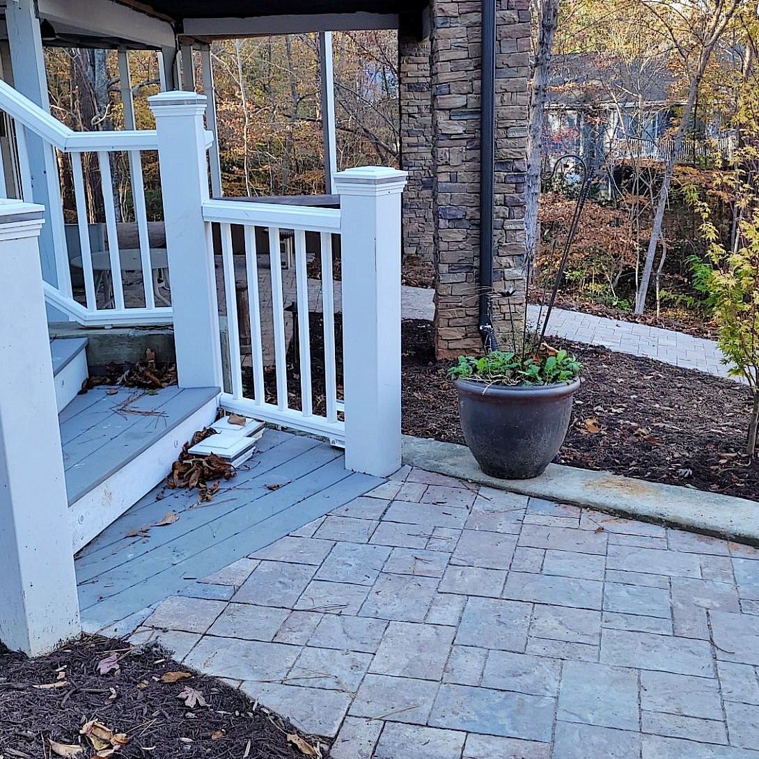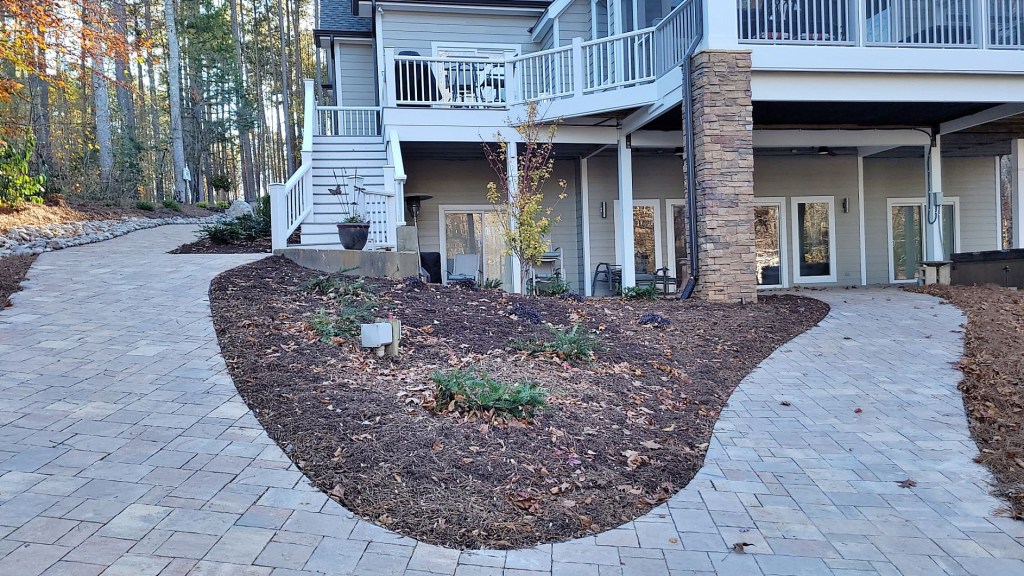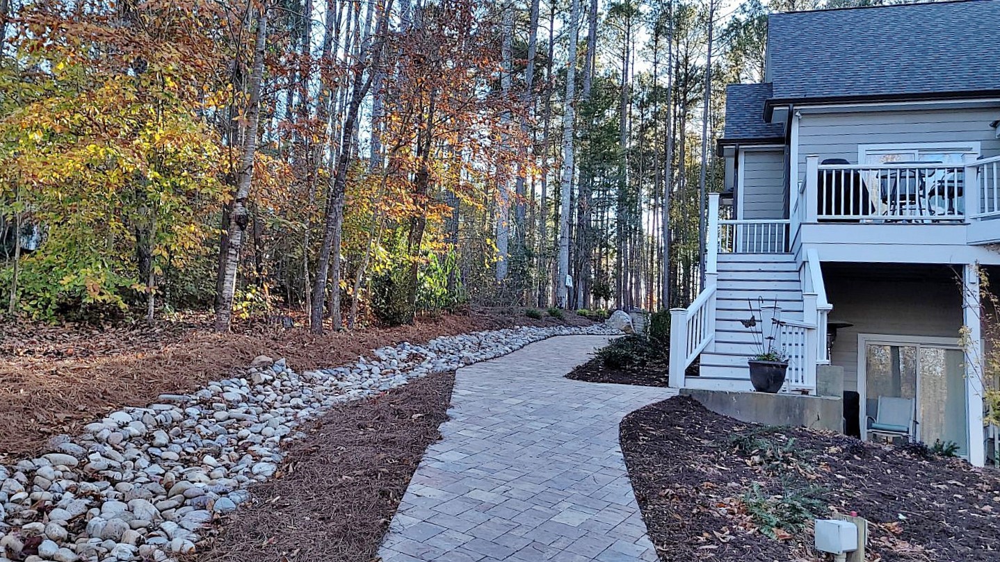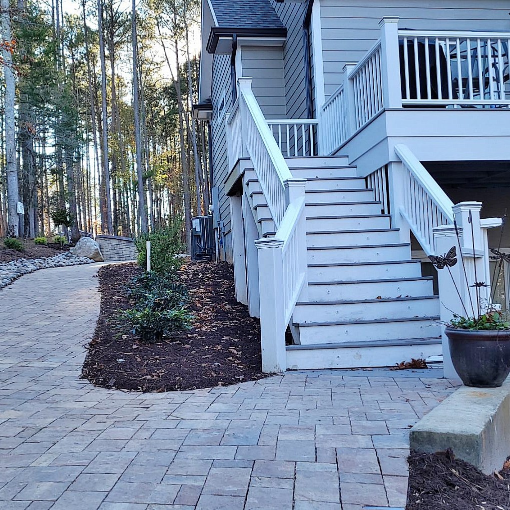 On the lakeside, we extended the walkway to connect with the steps, and to a Savannah Lafitt patio we installed under the upper deck.