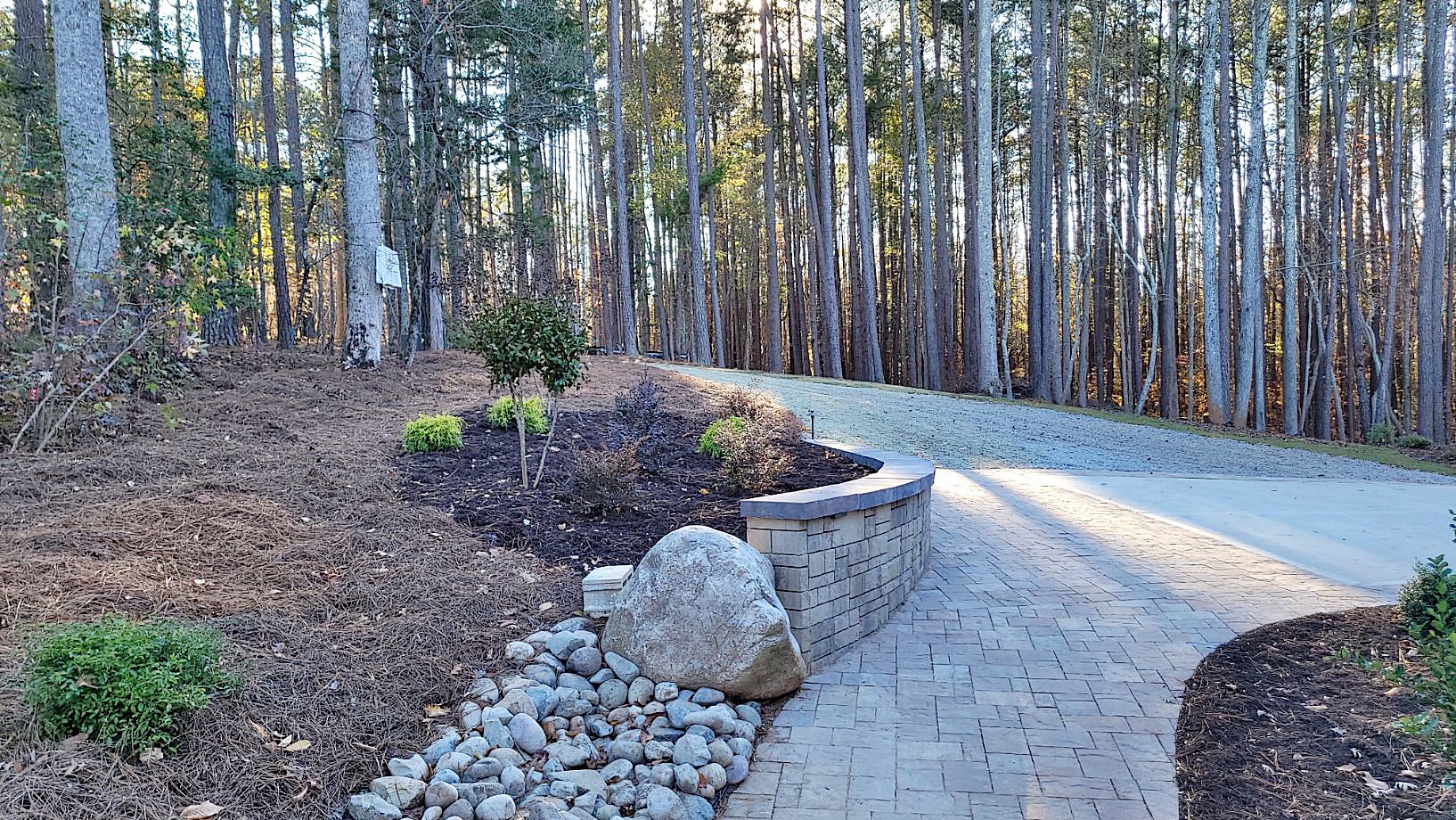Project notes: Materials used: Savannah Lafitt border; Colonial Castle Manor Grana retaining wall; Glacier River Jack washed river stone; Savannah Lafitt paver patio; Savannah Lafitt paver walk; Bermuda Sod; Dark Walnut Shredded Mulch; Pine Needle Buffers; Rainbird Irrigation System; LED Low Voltage Night Lighting.