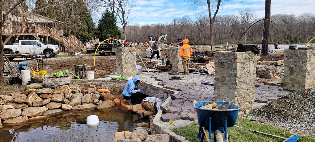 We began this project focusing on Canal Work, then graded and installed sod, plants, and a new patio along the Waterfront. Now our crews are back to upgrade and improve the efficiency of the stone bridge.