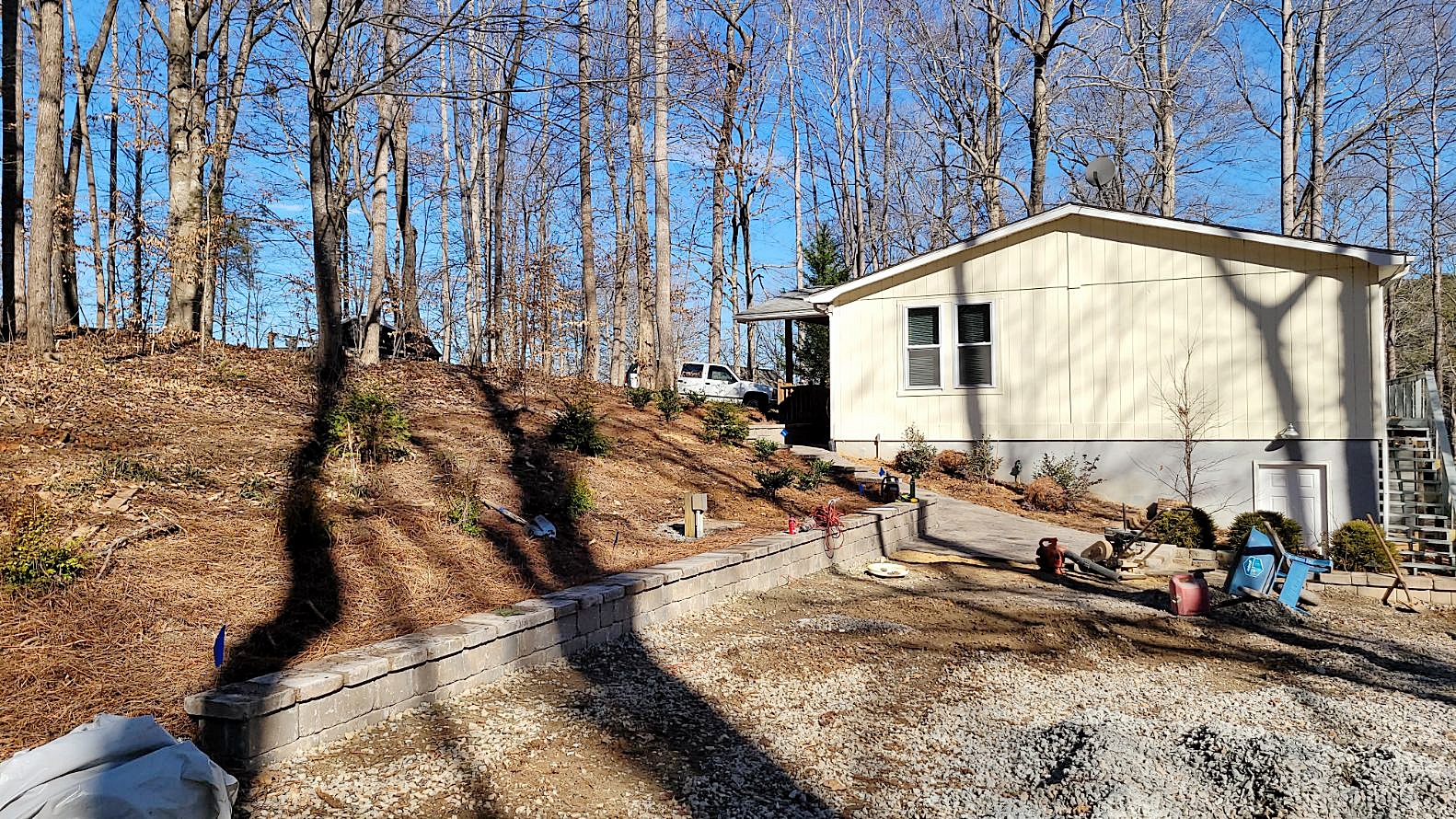 Our intrepid crews have returned to extend this long walk around the front of the house and replace the double row of timber retaining walls with a sturdy stone wall. Here is how it all looked before we got to work.