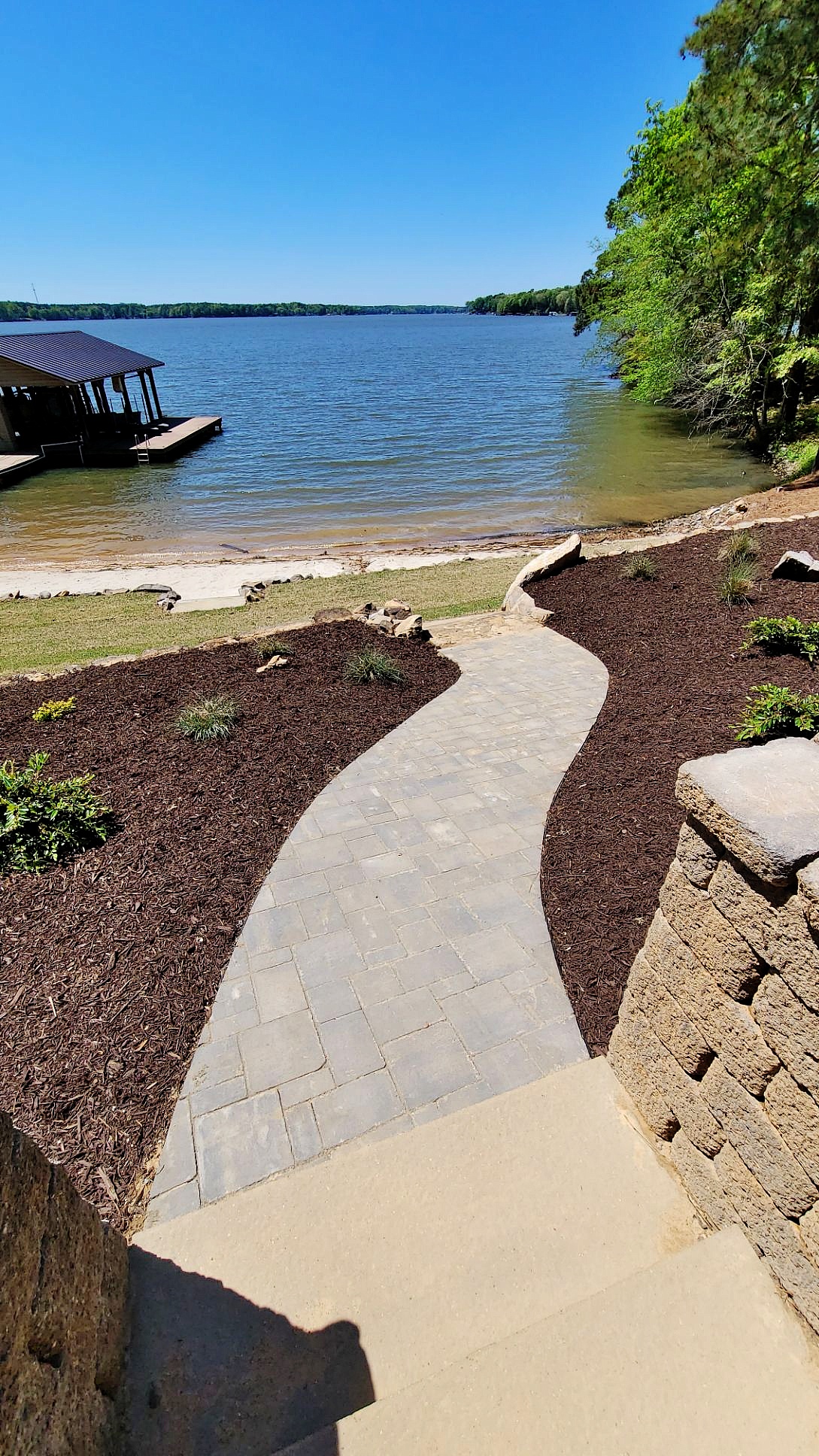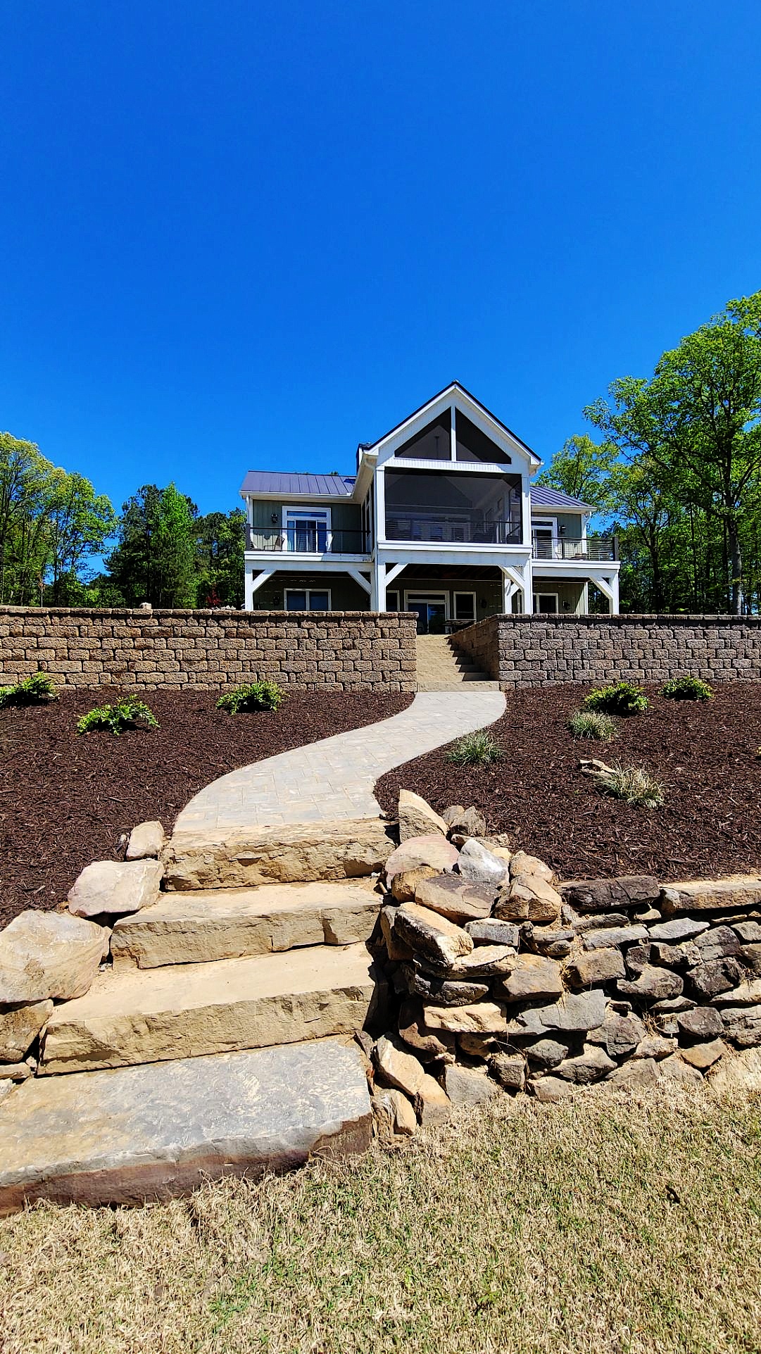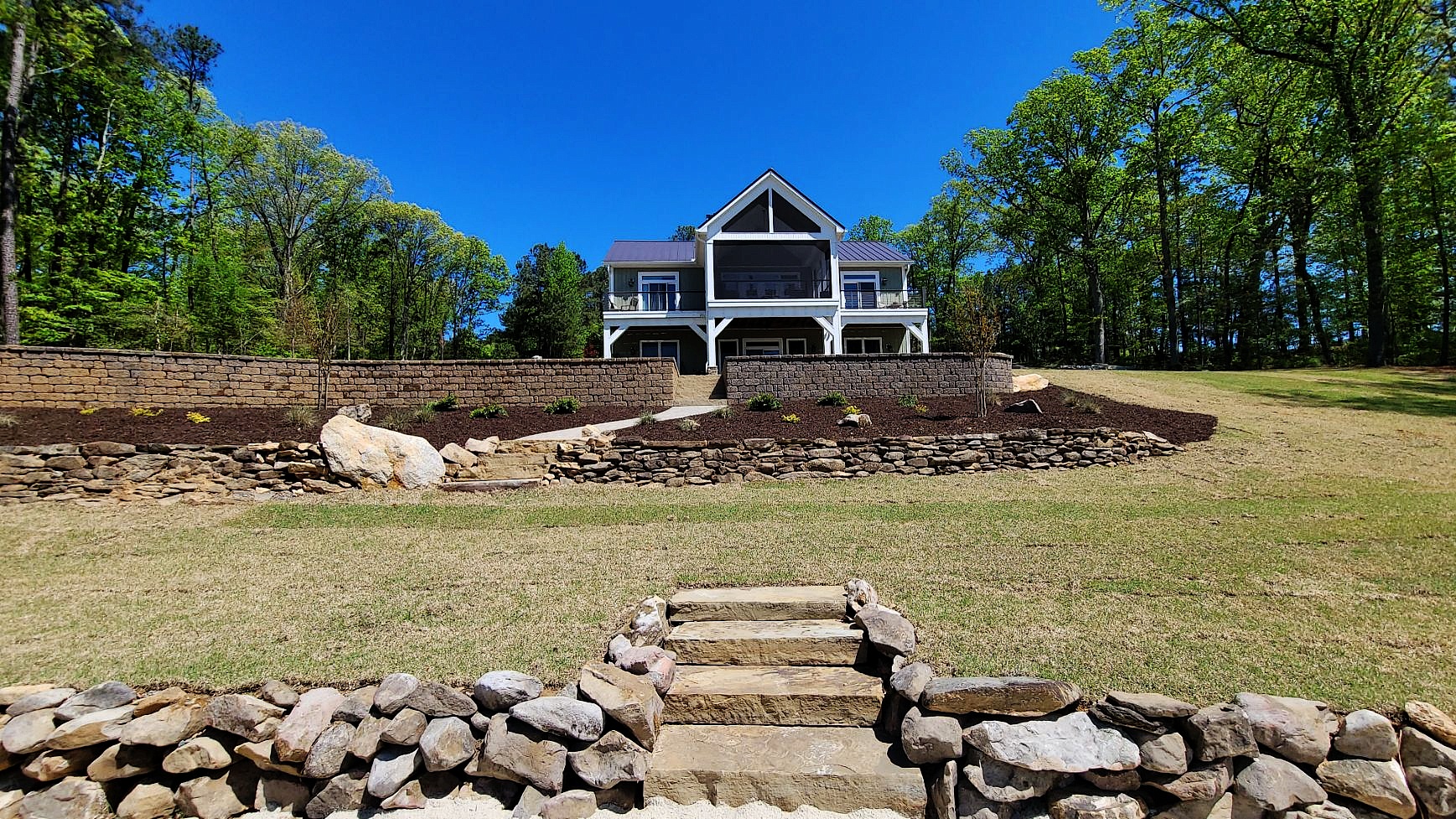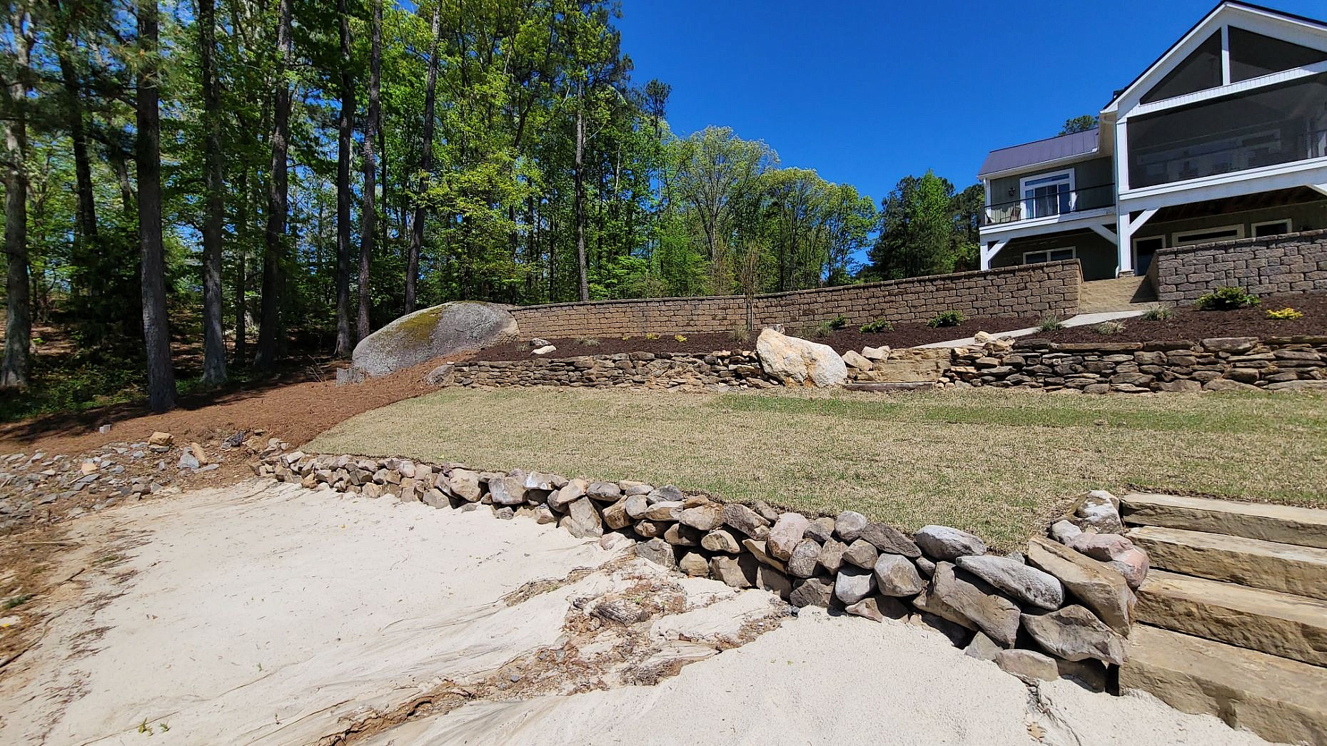 As you may have noticed by now, this property has an expansive slope from the street down to the Lake. Water erosion down this slope was mitigated at the lakeside by a double set of retaining walls, originally two stacked stone structures. To enhance the drainage control, we replaced the top wall with a 90′ Colonial Castle Manor Rustic stone wall, augmented with French Drains on the uphill side. Eight elegant stone slab steps provide access through the wall to a 20′ long Dublin Fossil Beige paver walkway, which in turn connects with the grassy entrance to the lower beach area.