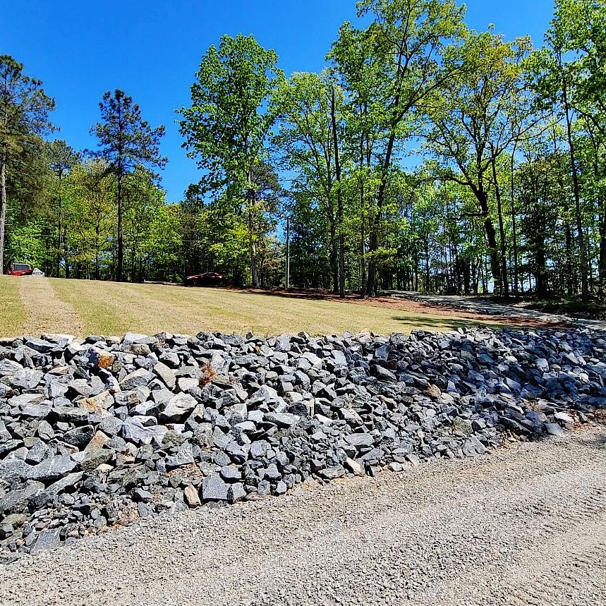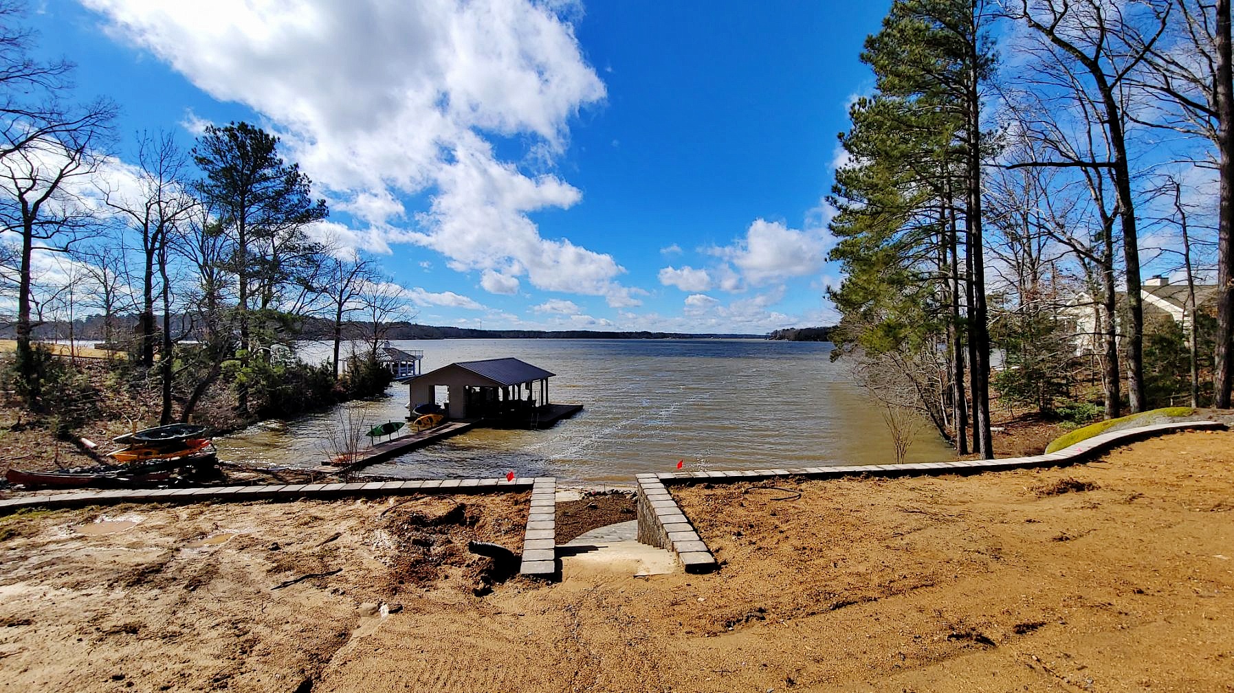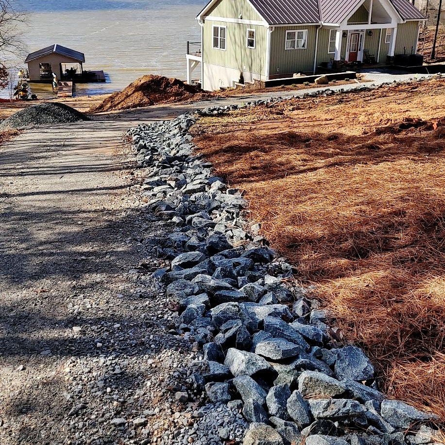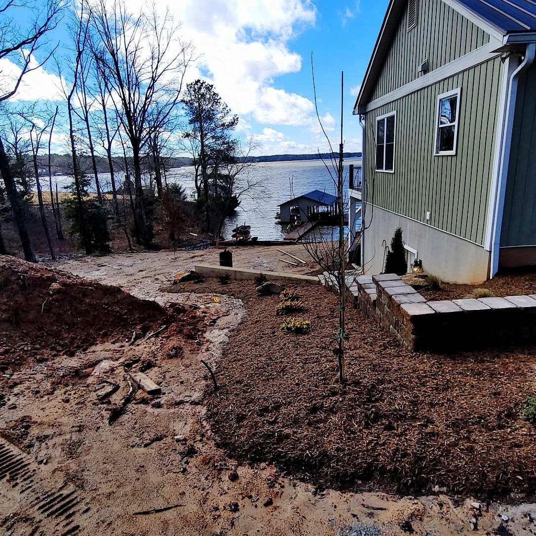 As you may have noticed by now, this property has an expansive slope from the street down to the Lake. Water erosion down this slope was mitigated at the lakeside by a double set of retaining walls, originally two stacked stone structures. To enhance the drainage control, we replaced the top wall with a 90′ Colonial Castle Manor Rustic stone wall, augmented with French Drains on the uphill side. Eight elegant stone slab steps provide access through the wall to a 20′ long Dublin Fossil Beige paver walkway, which in turn connects with the grassy entrance to the lower beach area.
