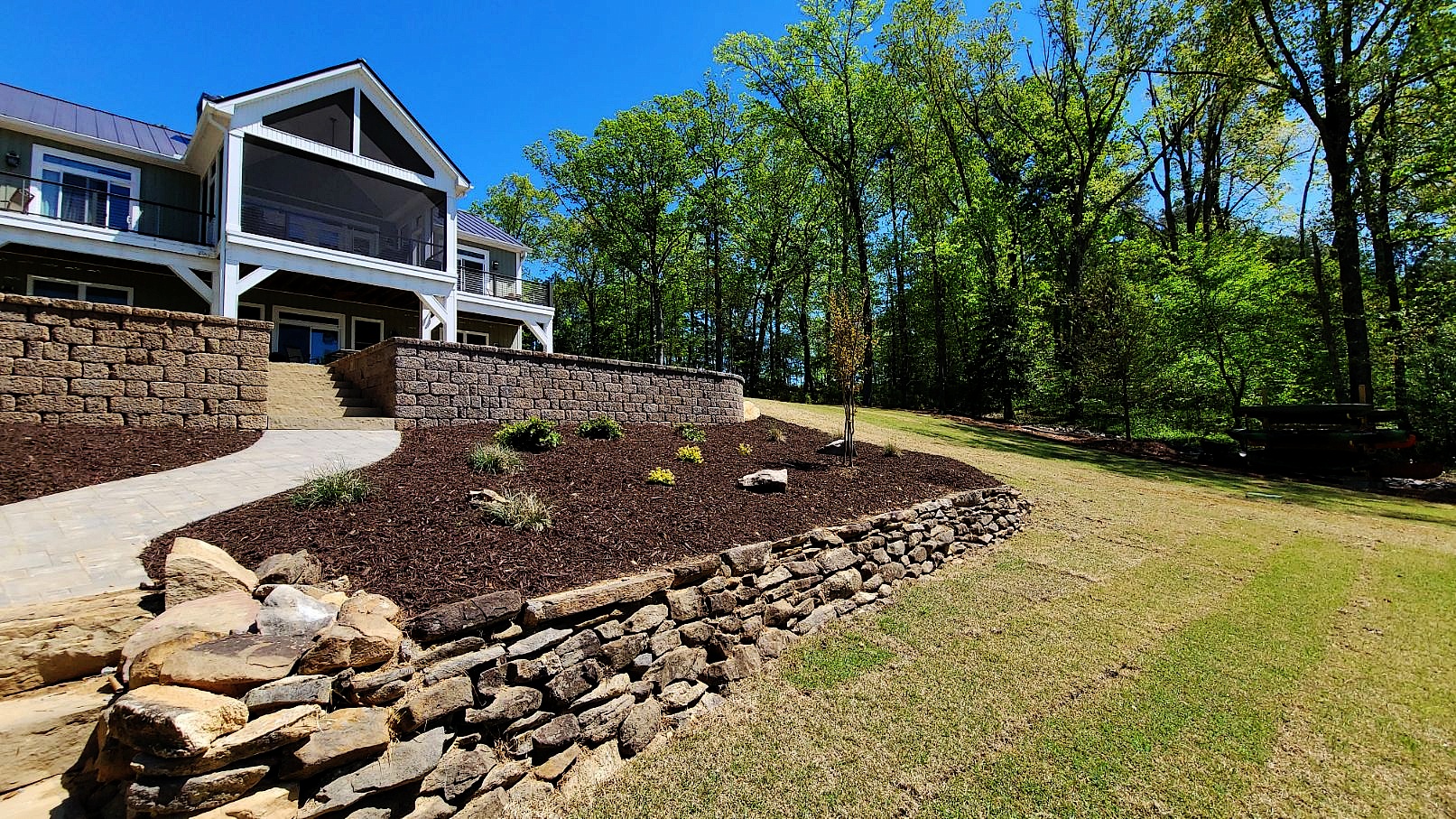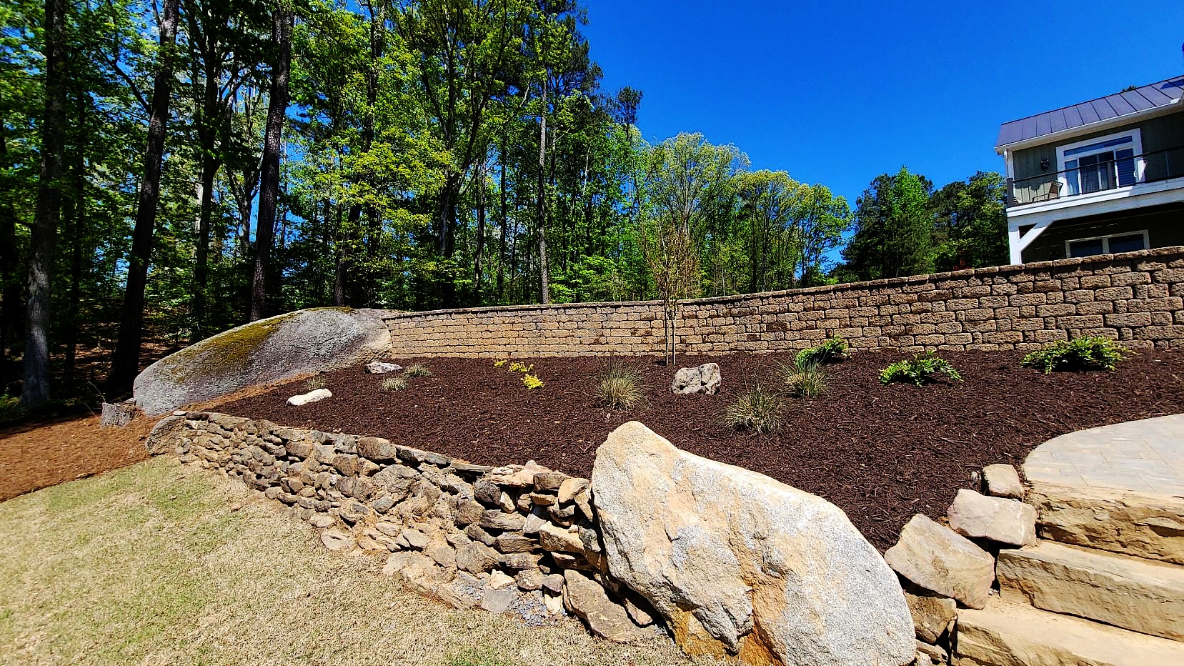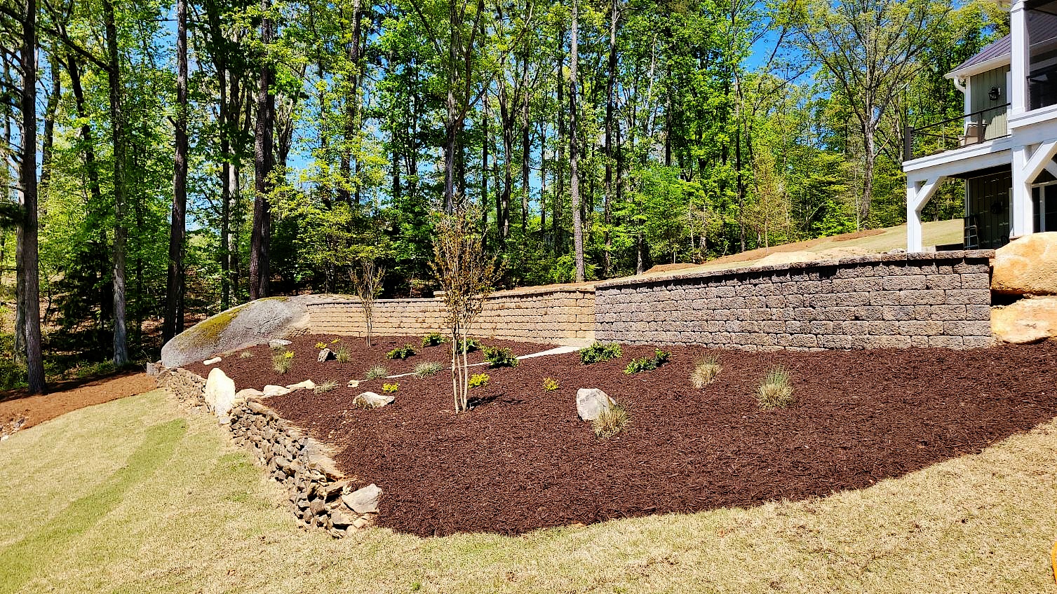 Within these lower retaining walls, our guys created a new planting bed, and installed the following material: 2 Tonto Crape Myrtles, 6 Gold Mound Spirea, 6 Pink Muhley Grass, 6 Vintage Jade Distyllium, and 6 Miscanthus. The mulch is Dark Walnut Designer Mulch.