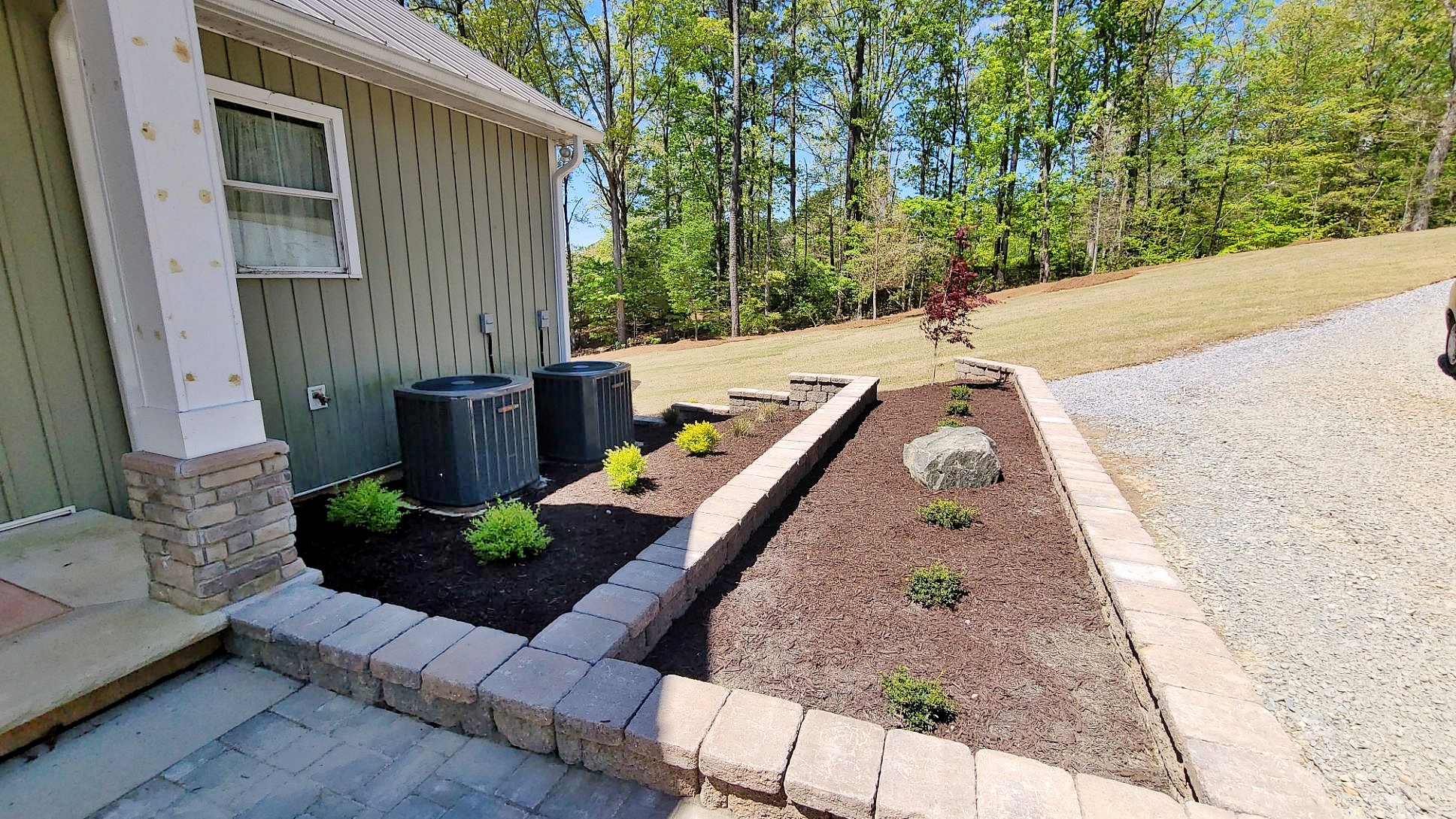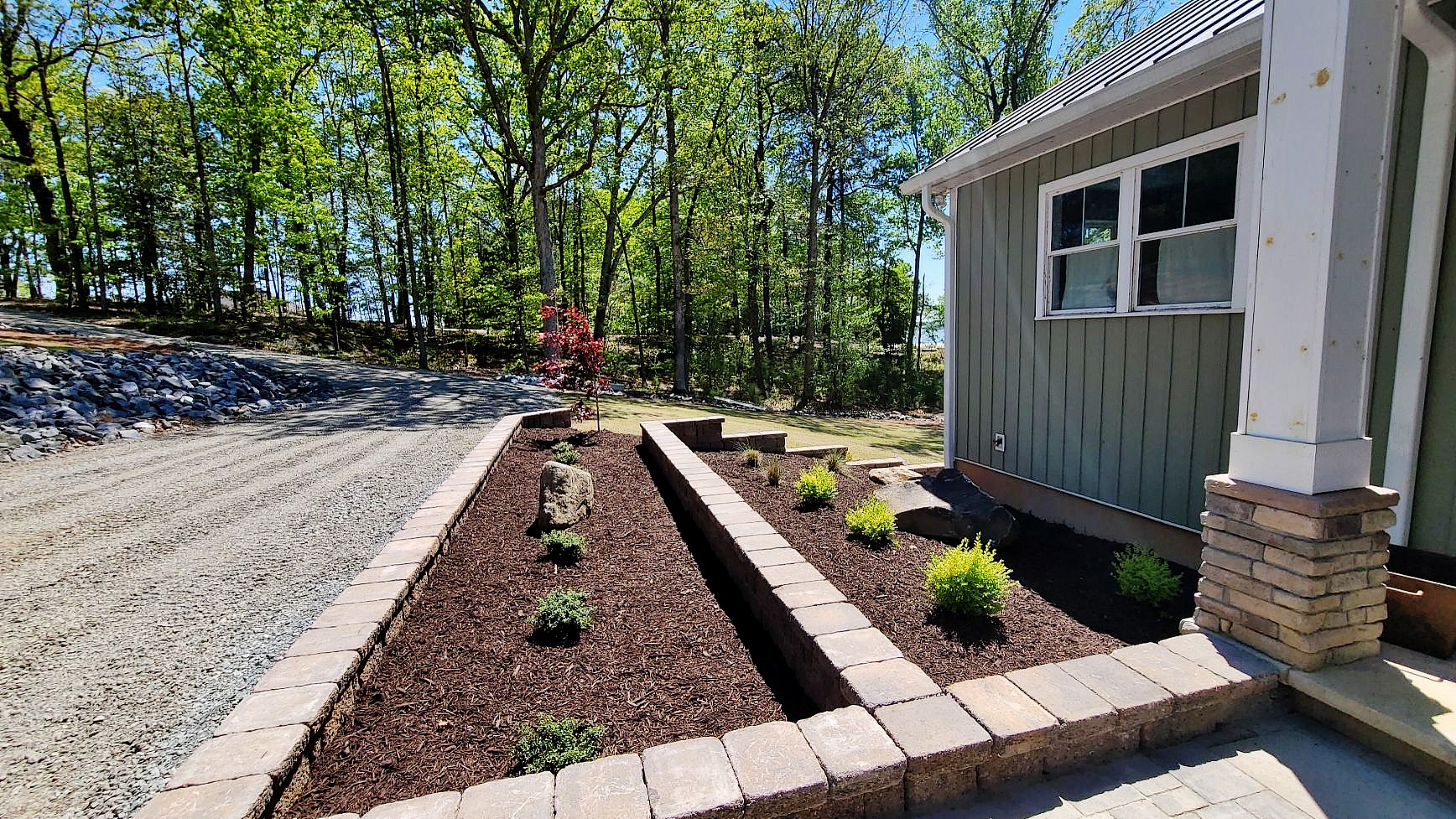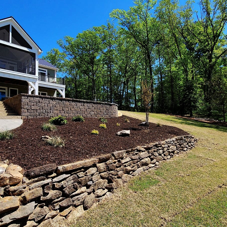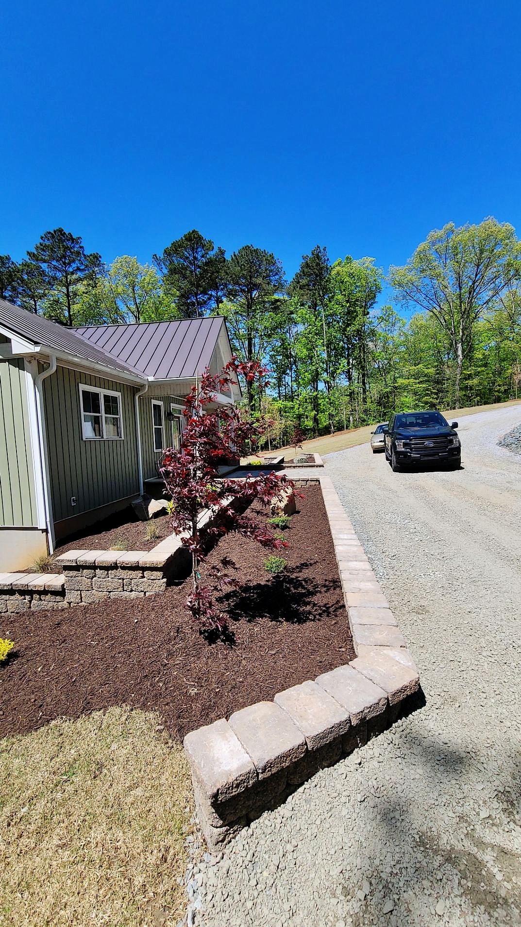 Within these lower retaining walls, our guys created a new planting bed, and installed the following material: 2 Tonto Crape Myrtles, 6 Gold Mound Spirea, 6 Pink Muhley Grass, 6 Vintage Jade Distyllium, and 6 Miscanthus. The mulch is Dark Walnut Designer Mulch.