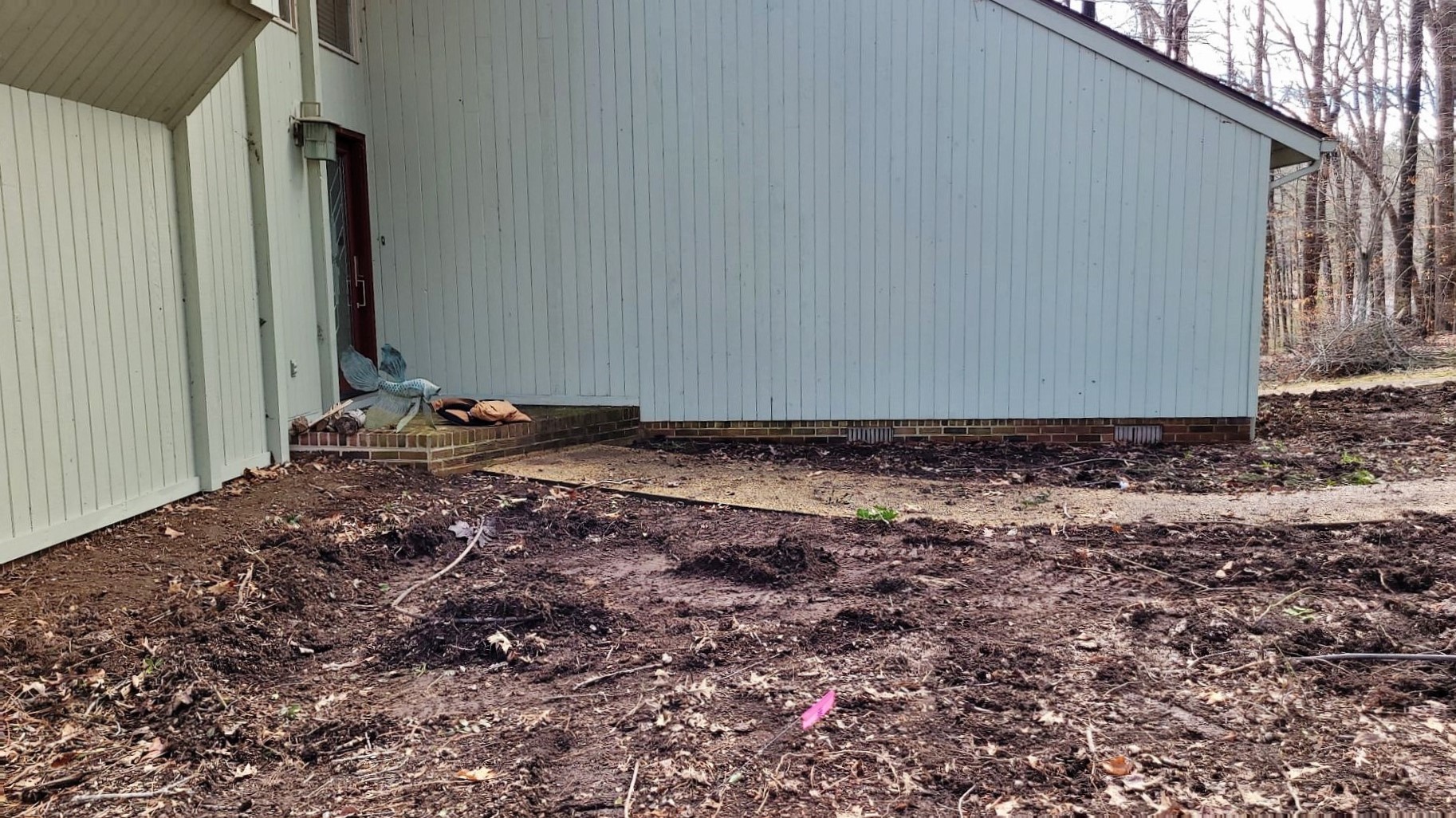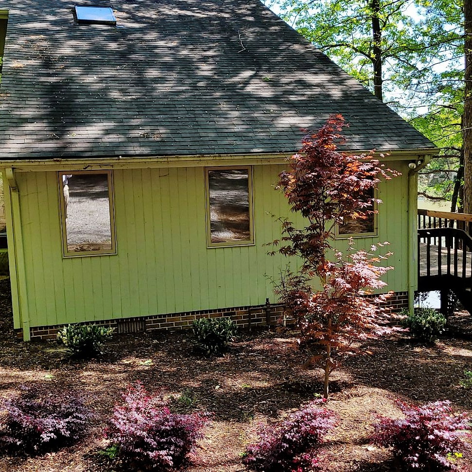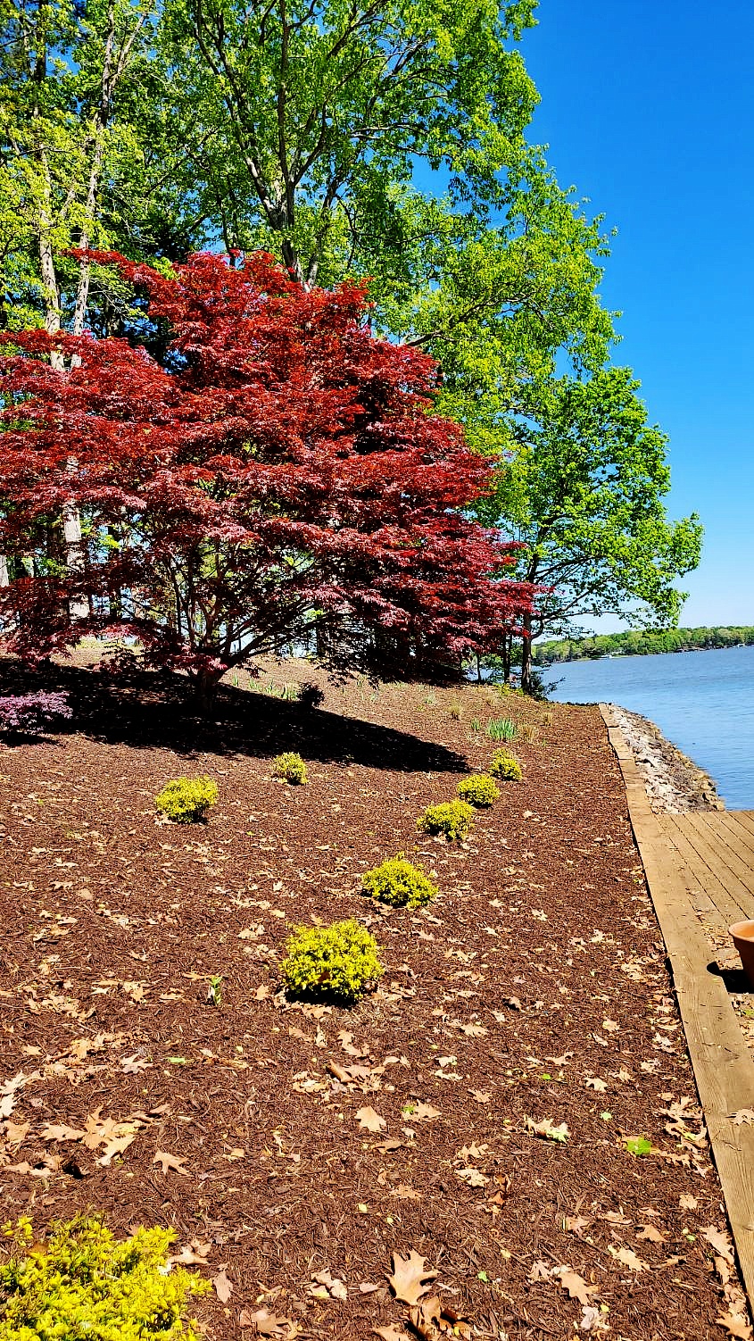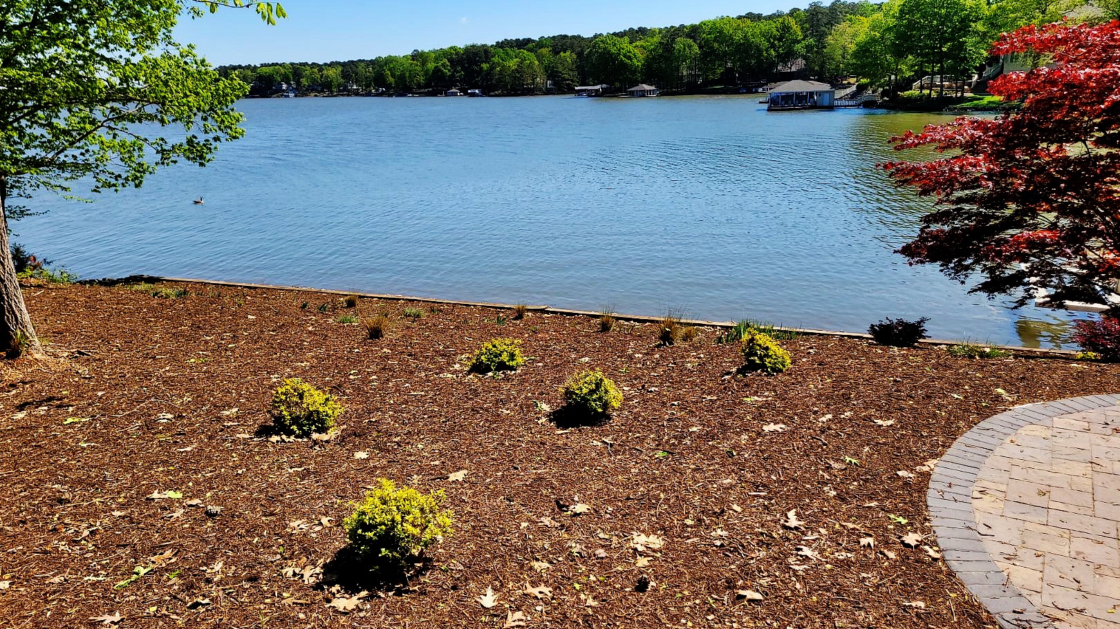Here are the finished pictures. Our crews brought in cubic yards of topsoil and installed more than a 100 different plants and trees, including: Miscanthus, Kaleidoscope Abelia, Pink Muhley Grass, Purple Pixie Lorepetalum, Sunshine Ligustrum, Dwarf Gardenia, Camellia Sasanqua, Saucer Magnolia, Chindo Viburnum, Red Japanese Maple, Otto Luyken Laurel, and more. The mulch you see is predominantly the ever popular Dark Walnut Shredded mulch.