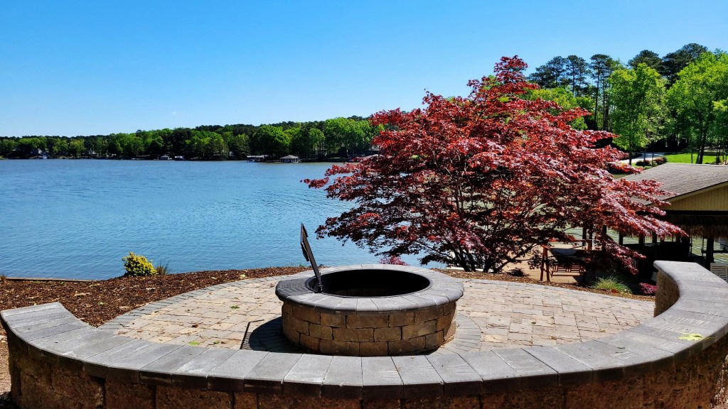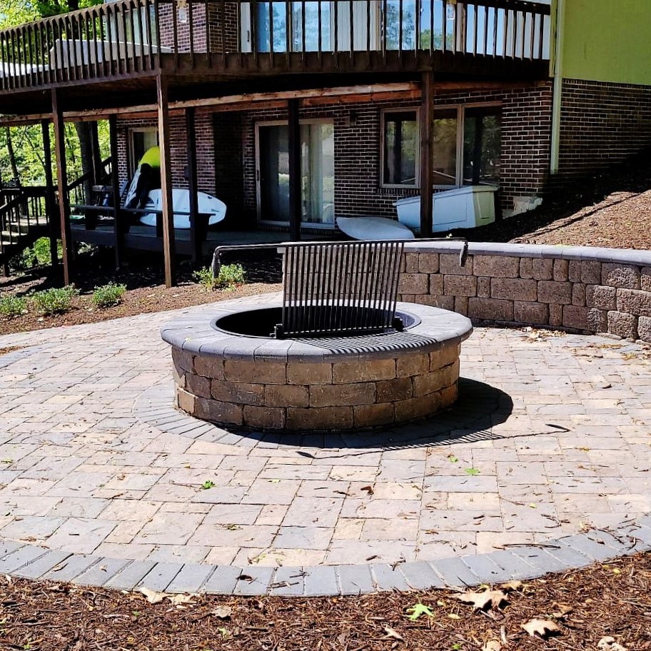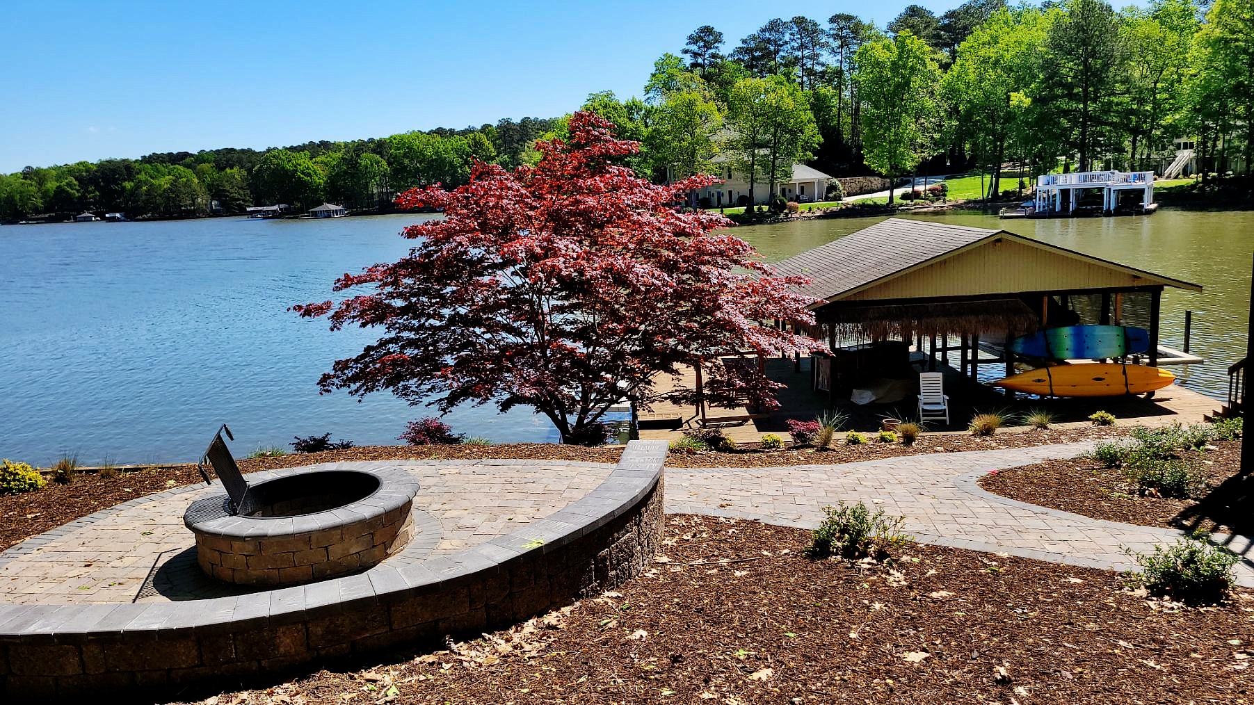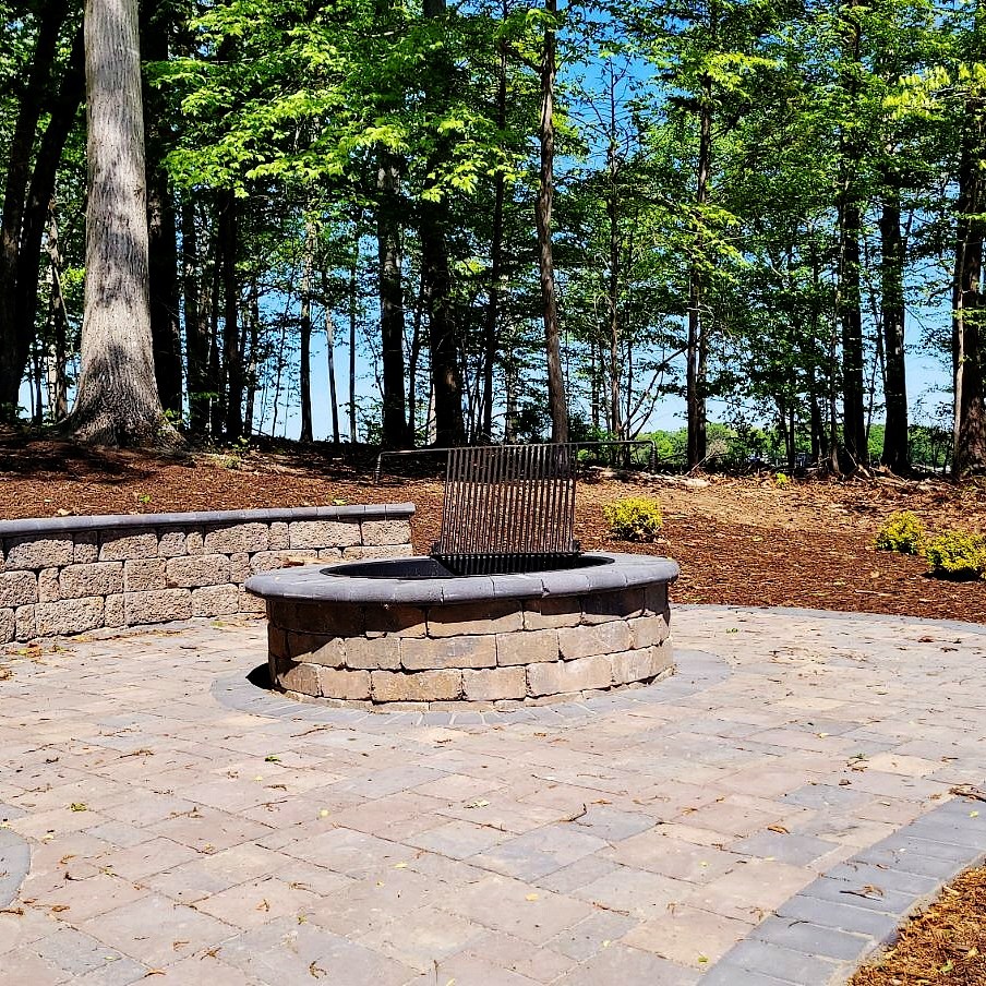 The walkway is made of River Street Lafitt pavers, as is the stone patio; the fire pit is Colonial Weston Stone; and the half moon sitting wall is a Colonial Castle Manor Rustic patio accessory – for those informal gatherings around the fire, offering a view of the Lake and the large Japanese Maple anchoring the landscape plantings.