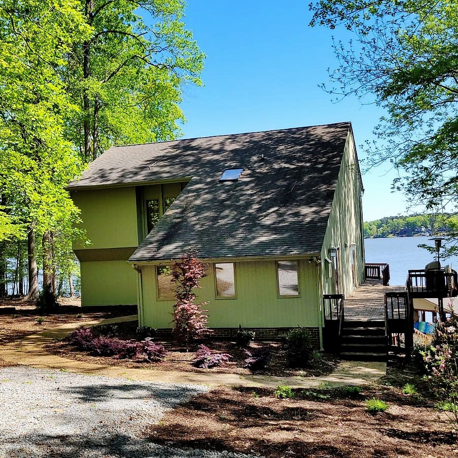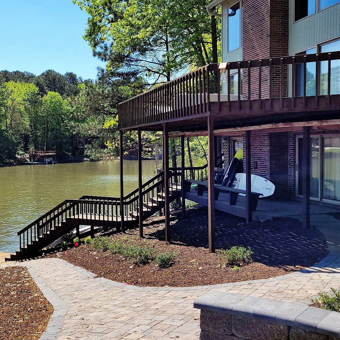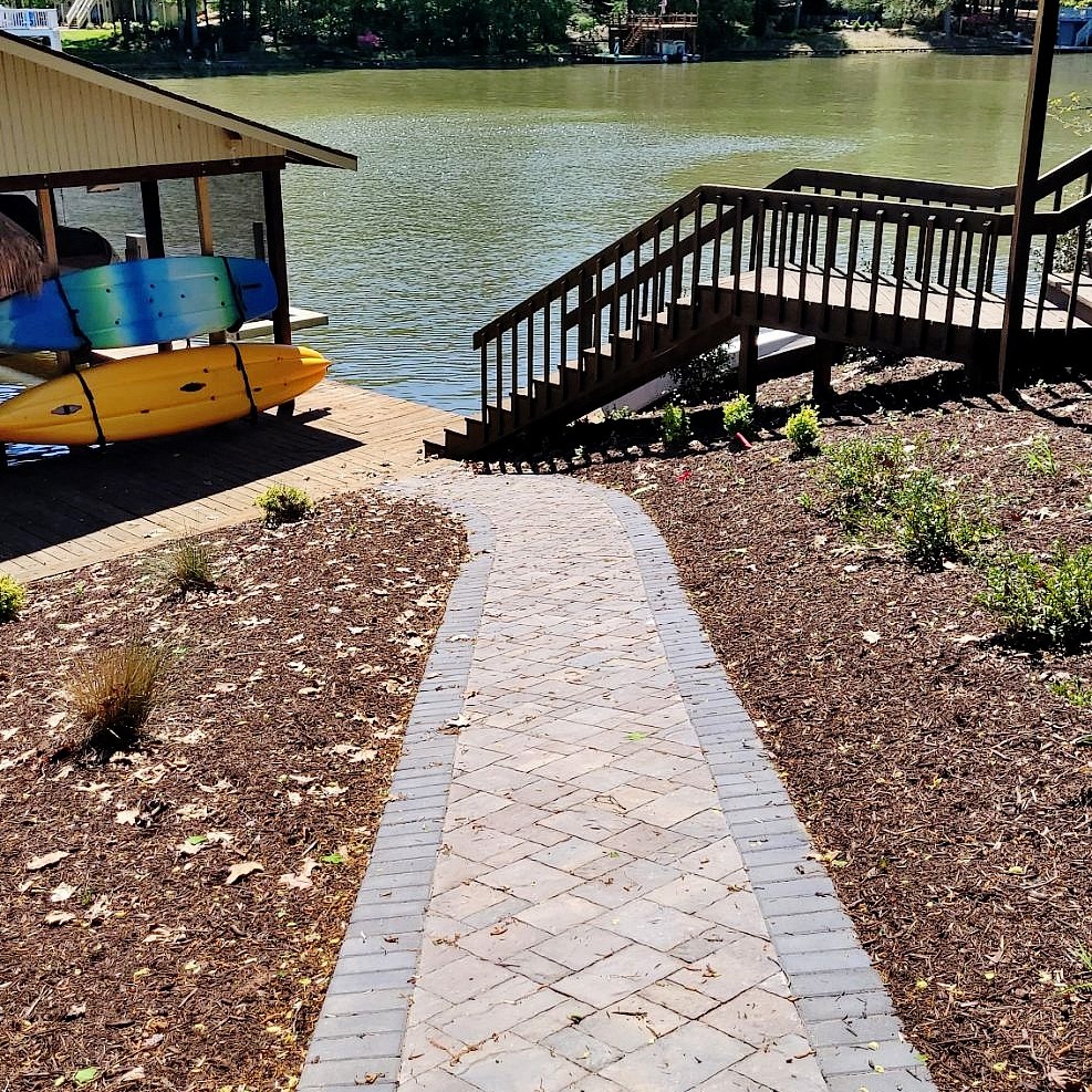 The walkway is made of River Street Lafitt pavers, as is the stone patio; the fire pit is Colonial Weston Stone; and the half moon sitting wall is a Colonial Castle Manor Rustic patio accessory – for those informal gatherings around the fire, offering a view of the Lake and the large Japanese Maple anchoring the landscape plantings.