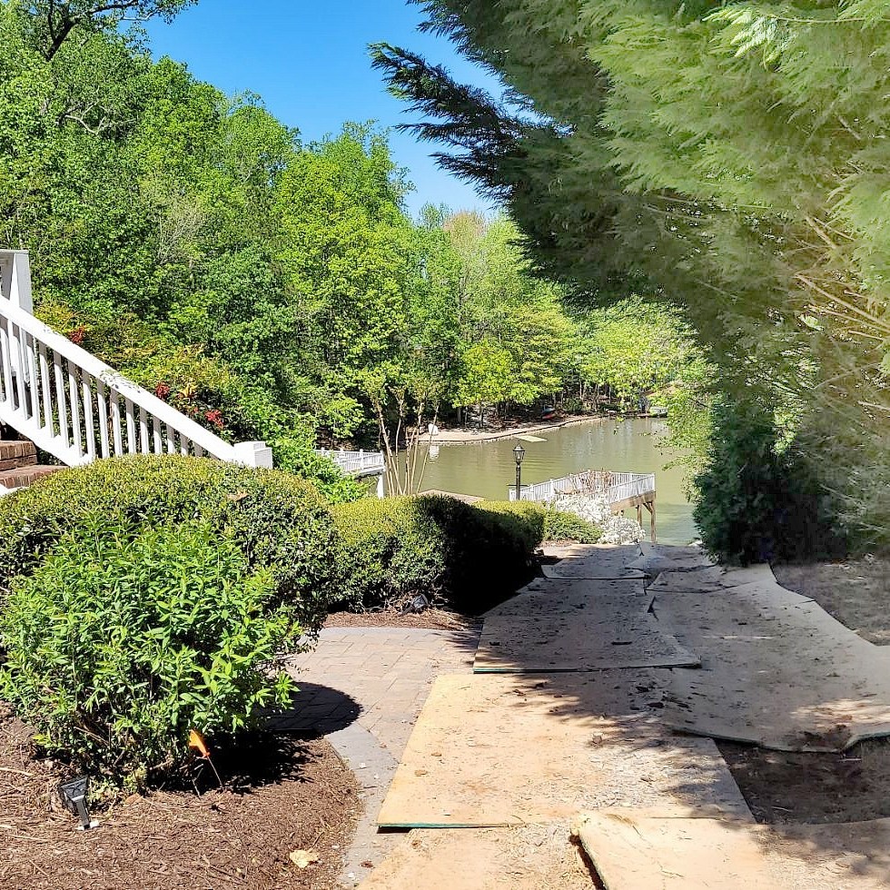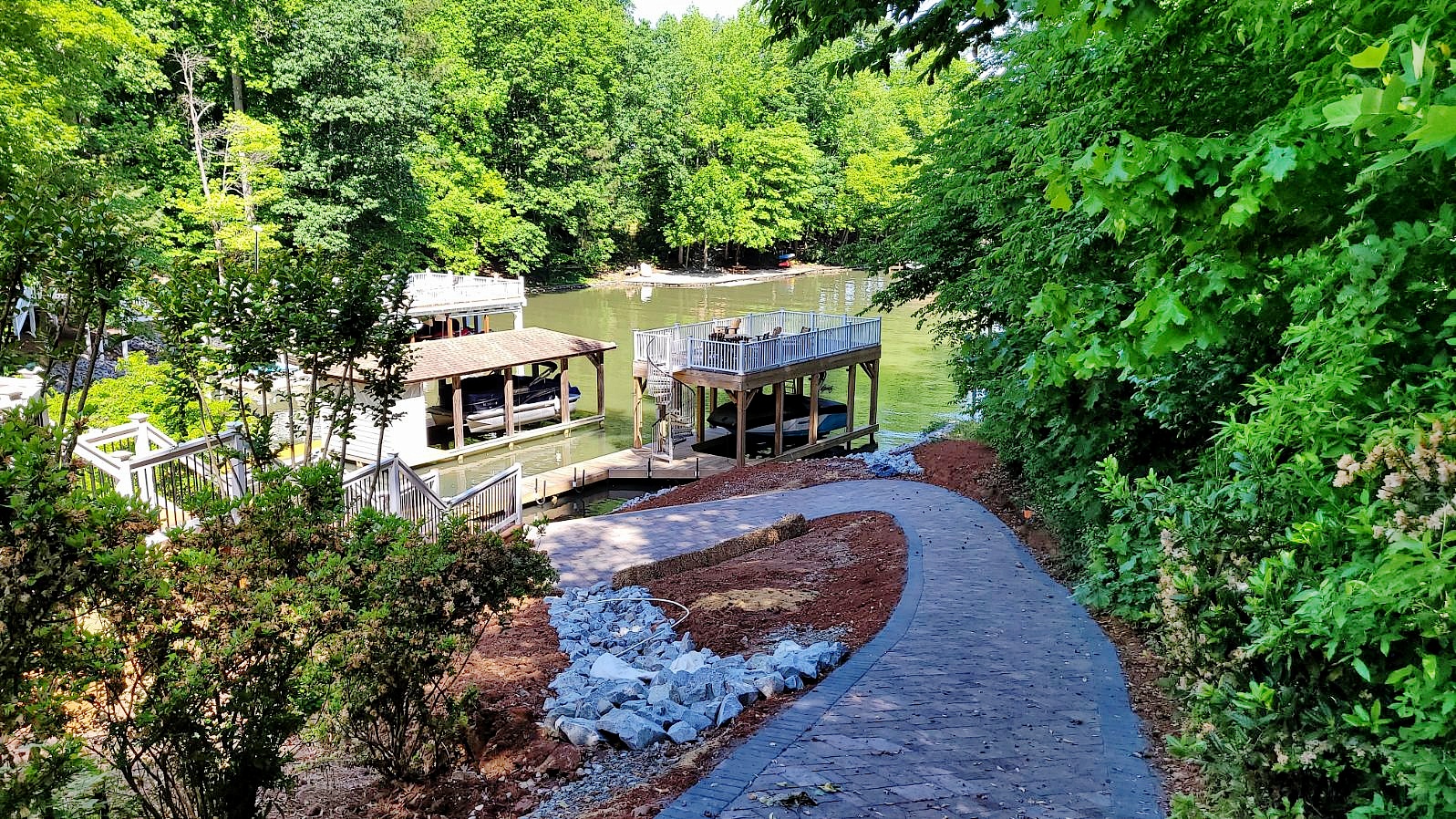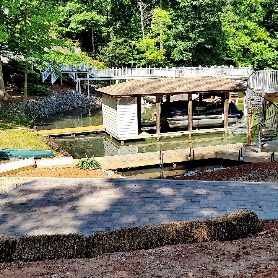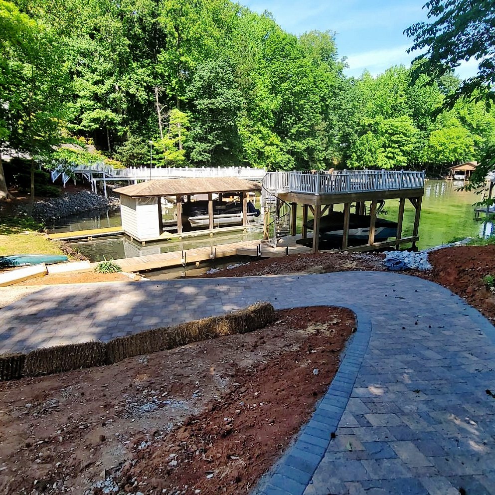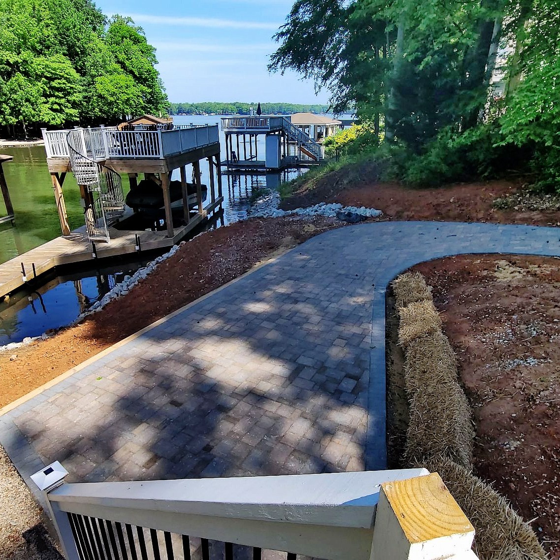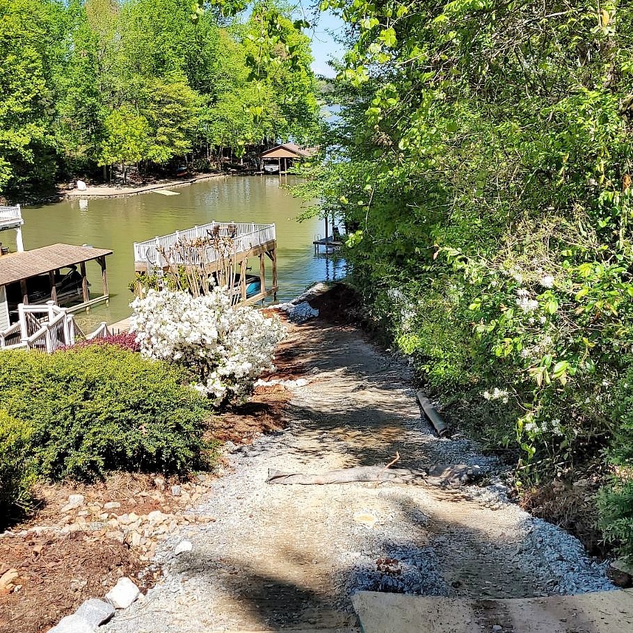 When you have a steep slope to the Lake, you can improve accessibility with steps or a walkway. Many on the Lake are going one step further: installing a walkway specifically for golf cart access. Here is a recent customer of ours that had us build just such a golf cart path down this slope to a retaining wall above the dock area.
