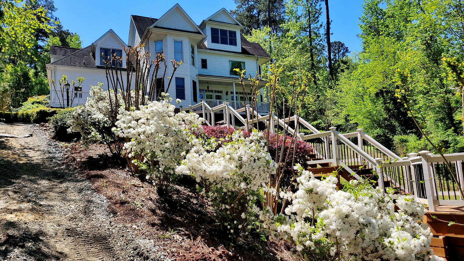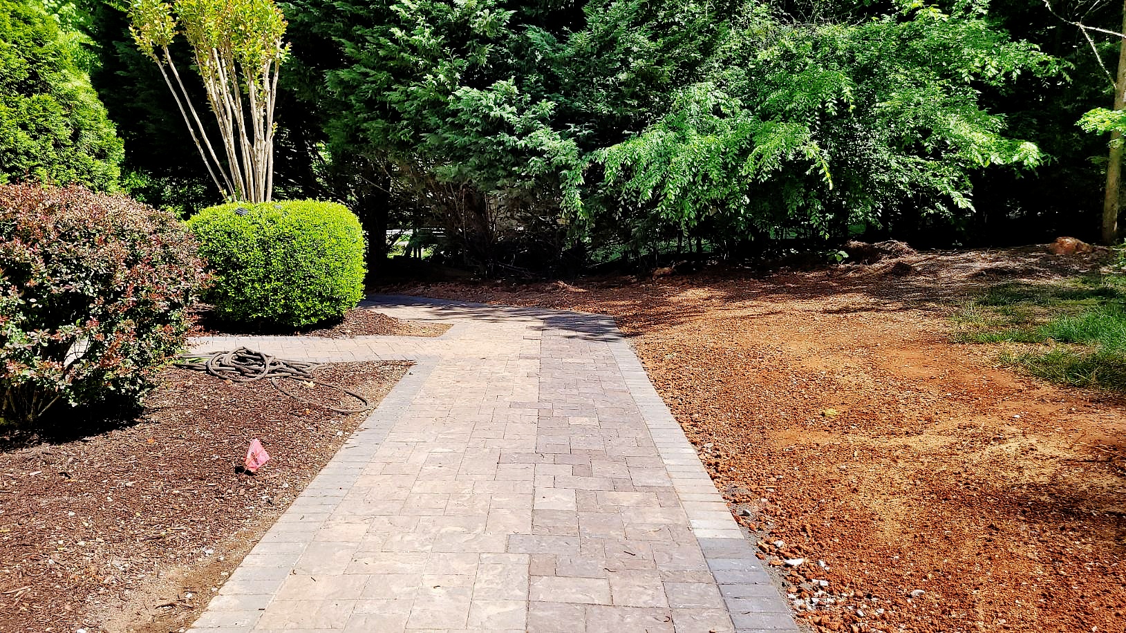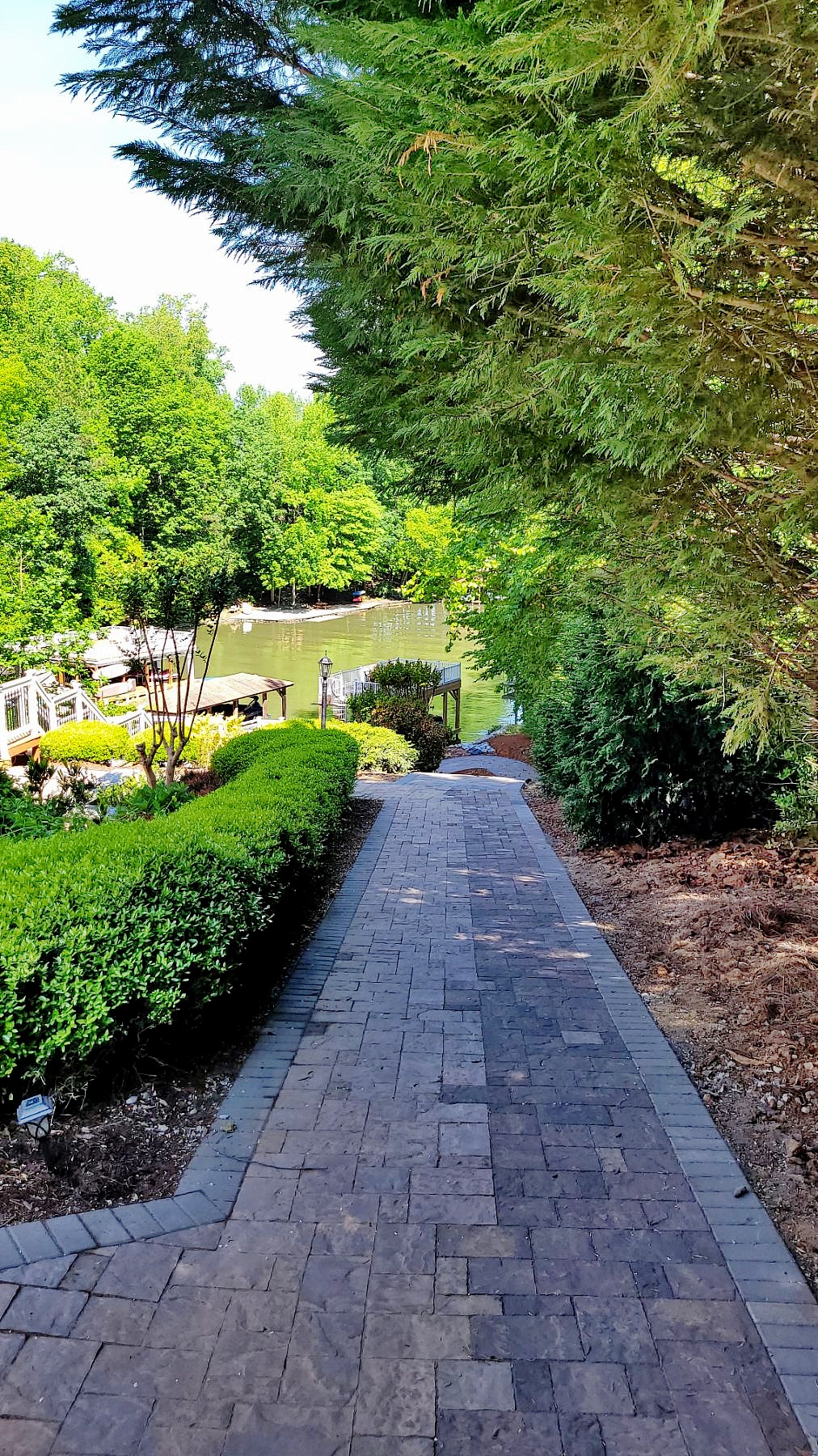 What goes down must come up again, and so we installed a 200 sf triangular shaped River Street Lafitt 3 piece paver golf cart turn around with Slate Grey border to connect the right side sidewalk to the flat area just above the lake front retaining wall.