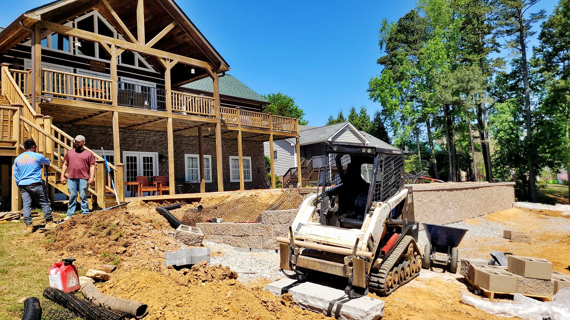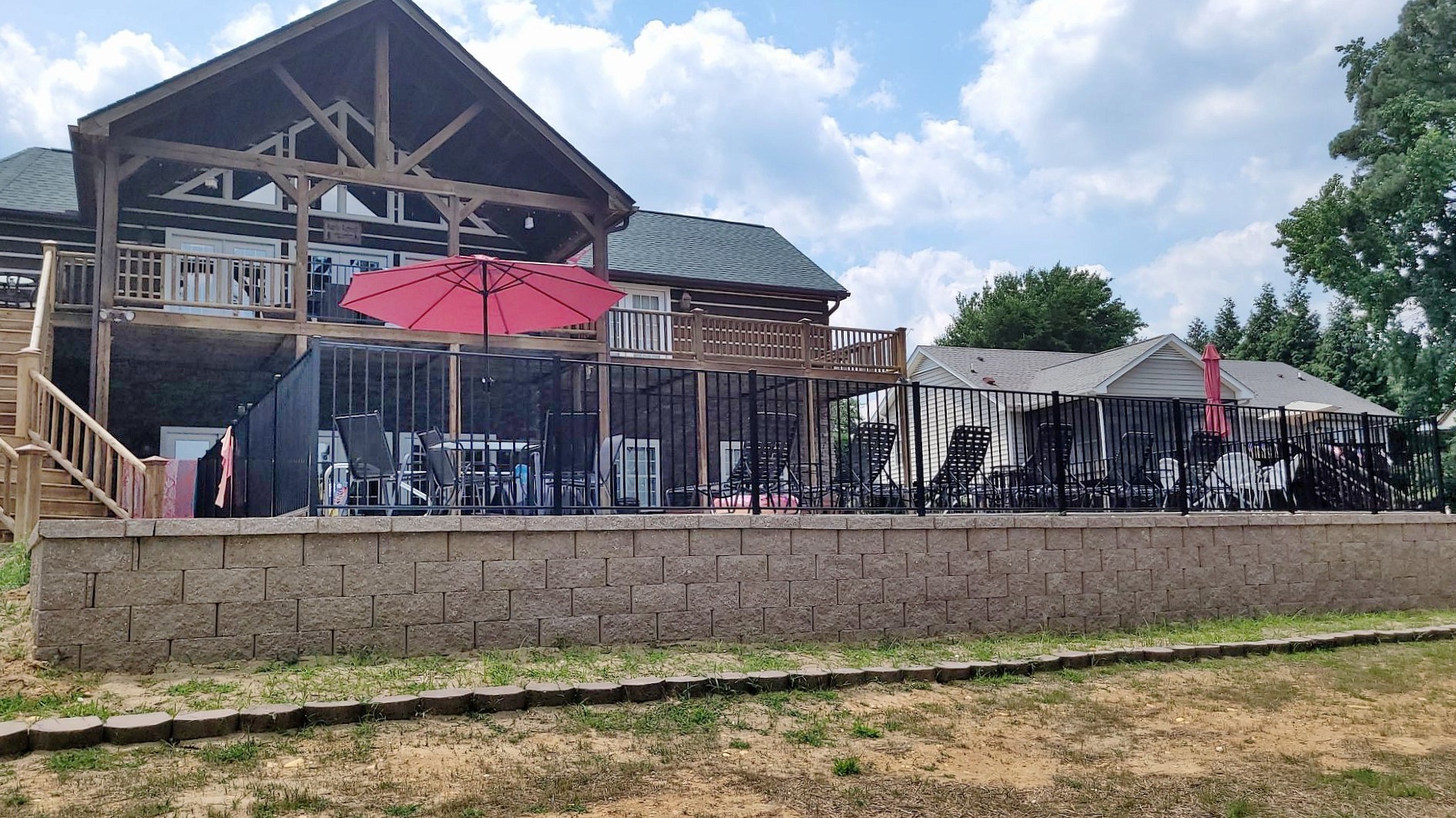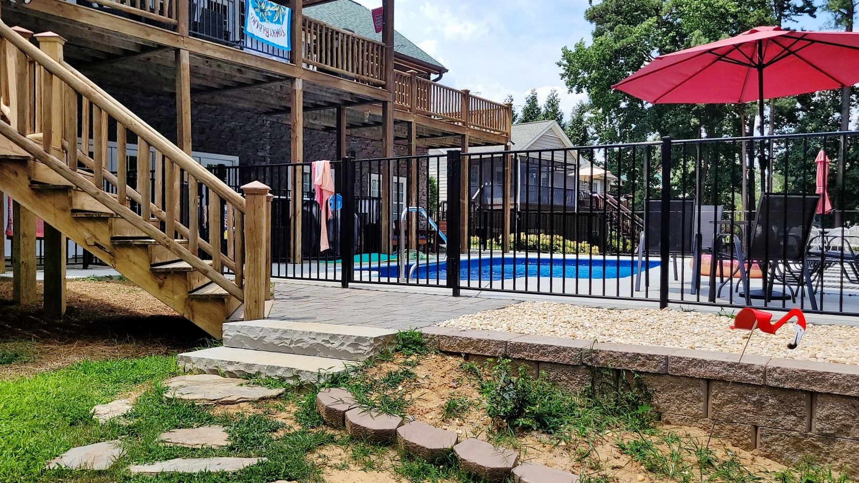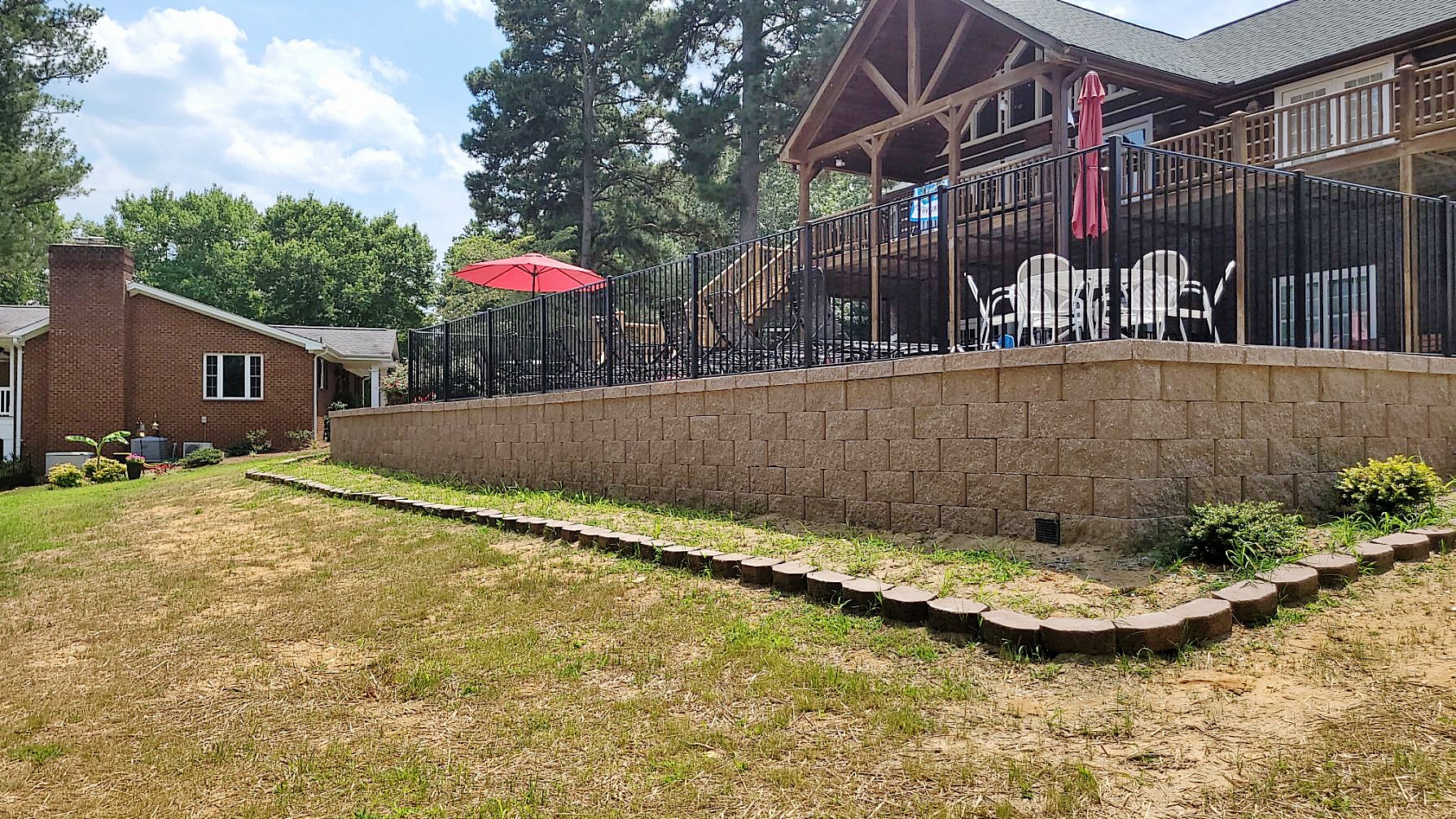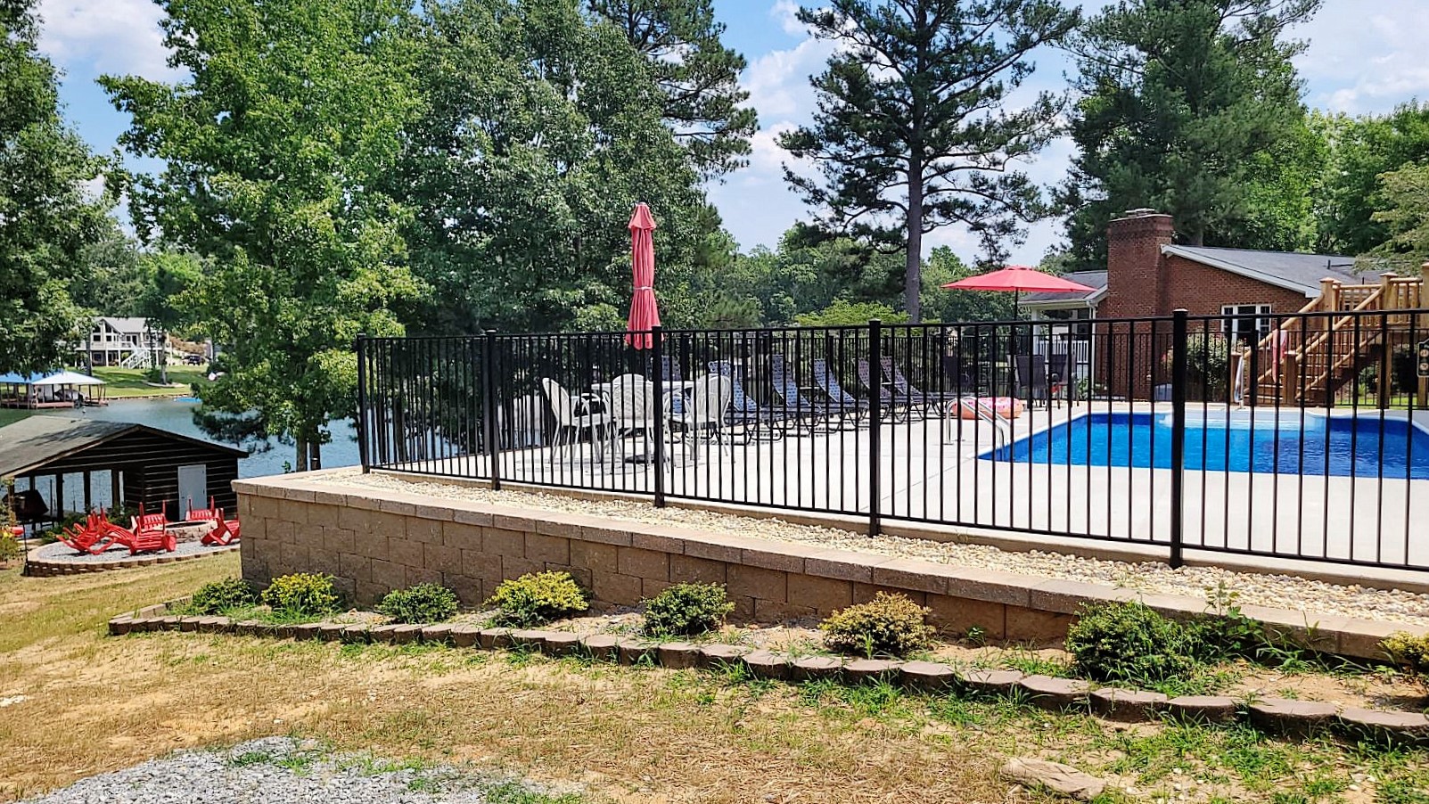 We’ve finished up the Sheffield Diamond Pro retaining wall around this customer’s pool, which we posted on here. Click on any photo to get a closer look.