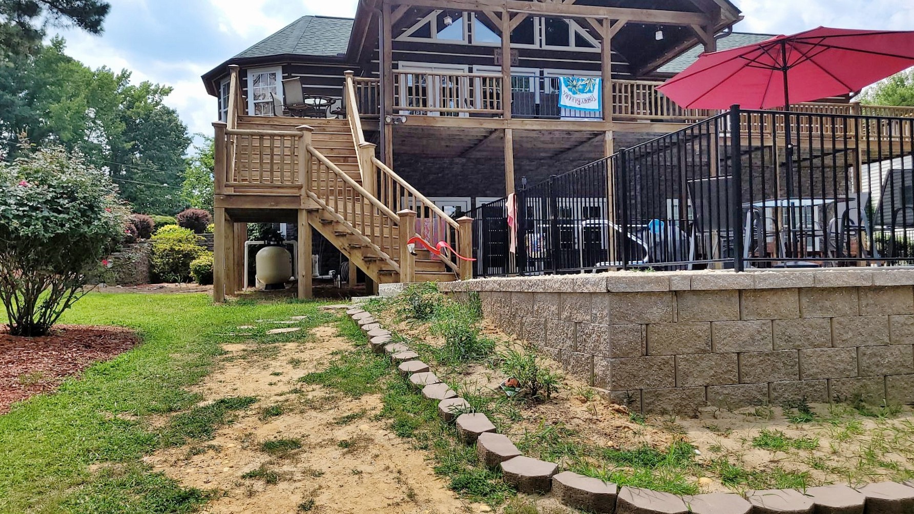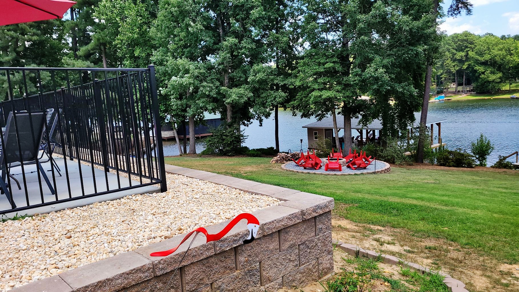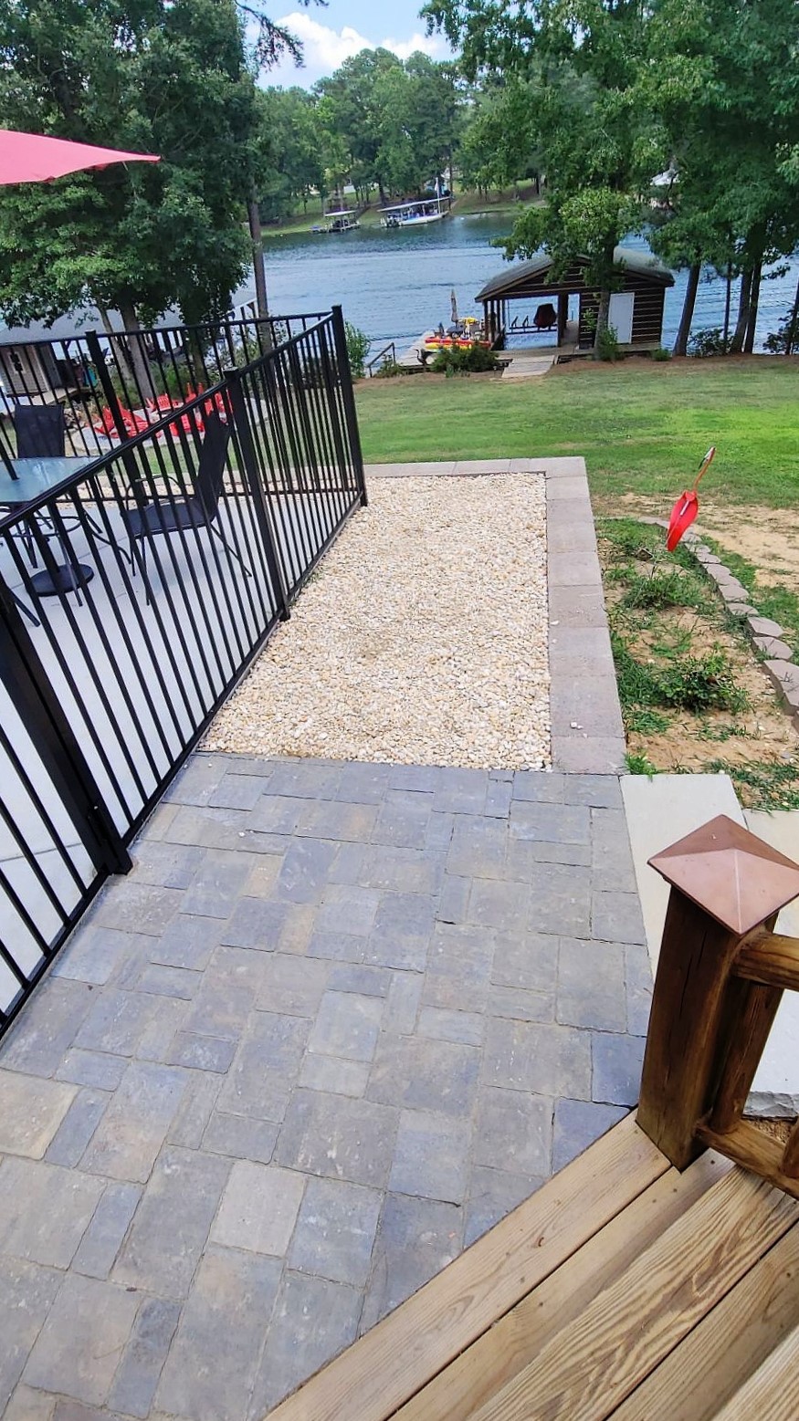 Just below the retaining wall, we installed this 16′ circular gravel patio.