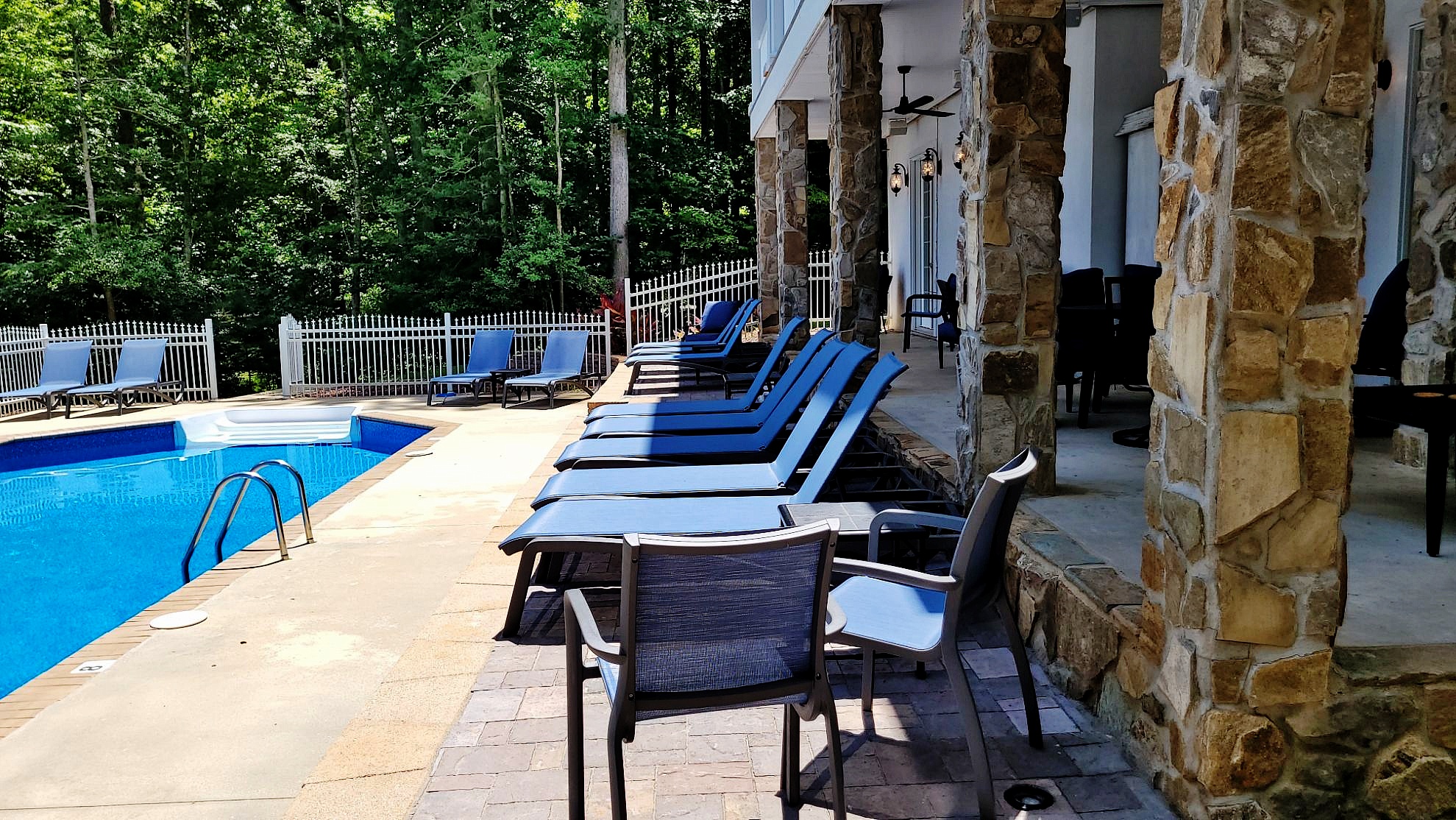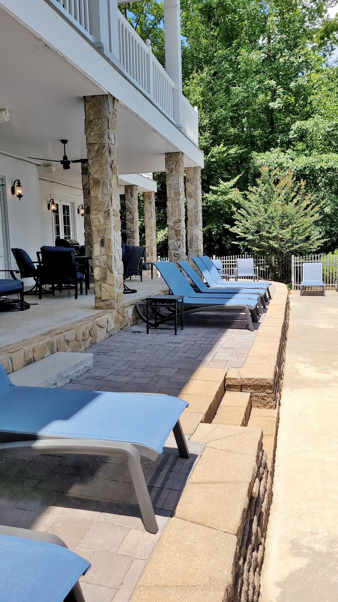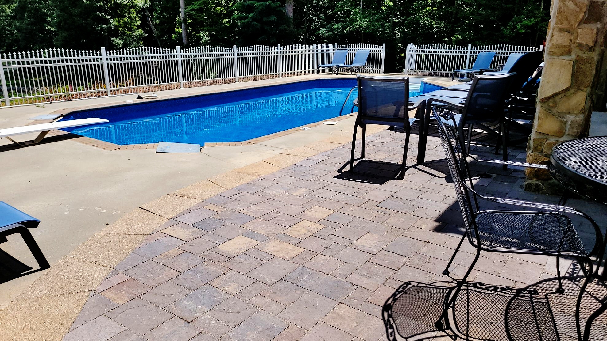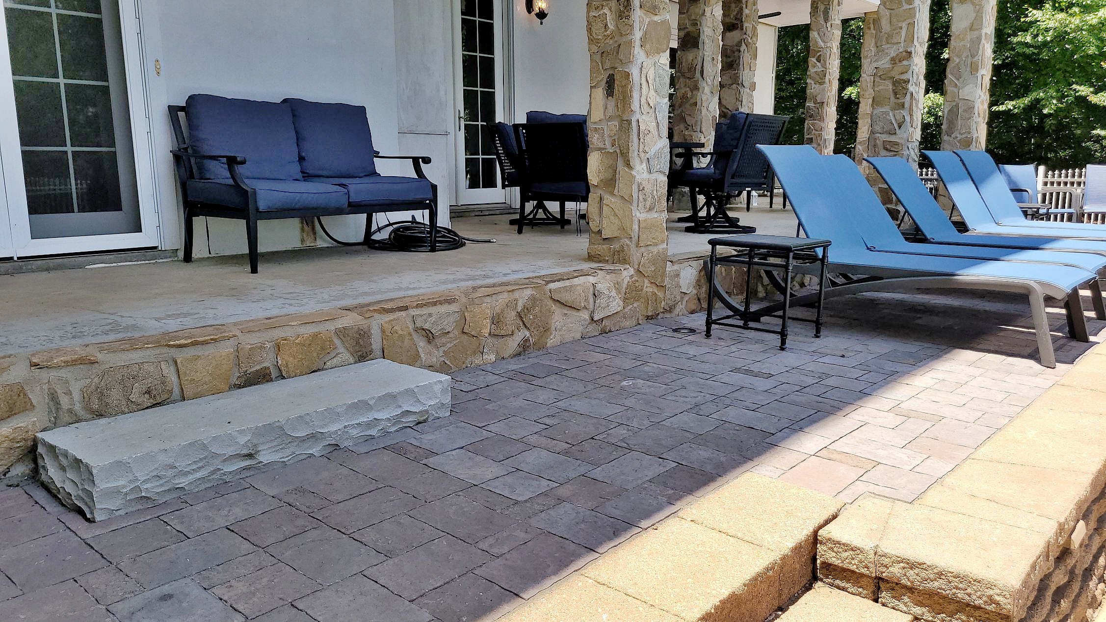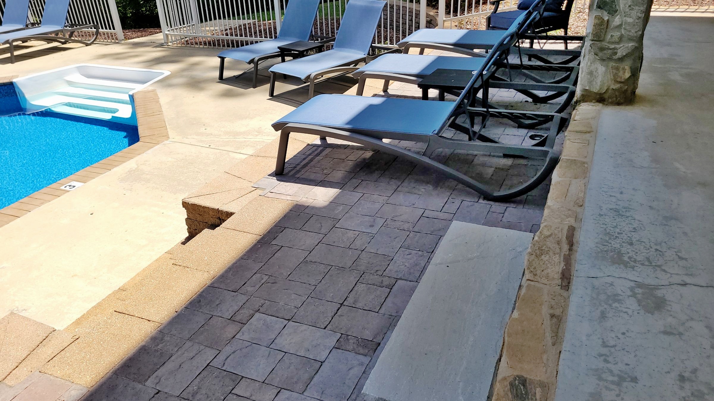 The pool area originally had a planting bed at the base of the step-down from the back patio. We converted this to a River Street Lafitt paver sun and lounge area, together with a 13.5′ x 15′ River Street Lafitt paver patio at the end.