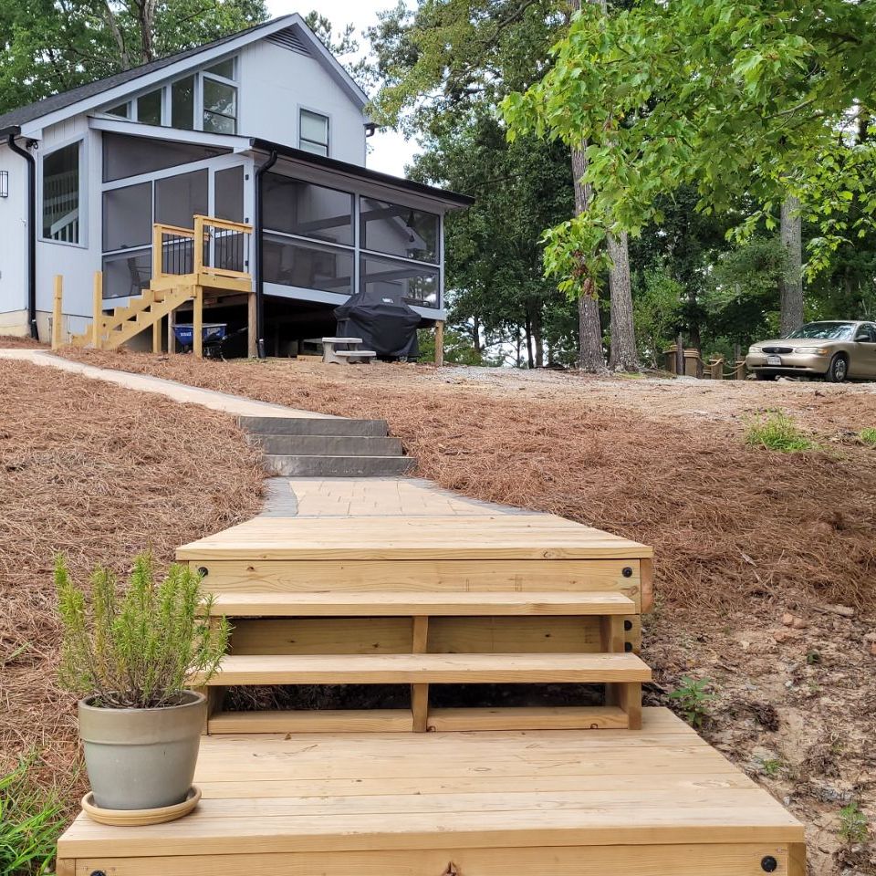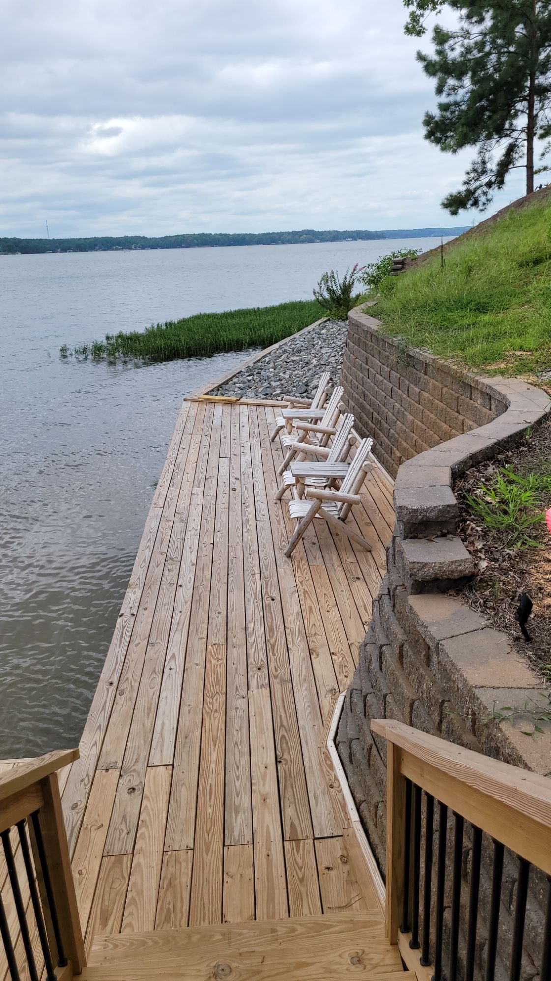 This year, the customer upgraded the boathouse and wooden deck and steps, and our guys completed a patio walkway combination to tie the house to the lake.