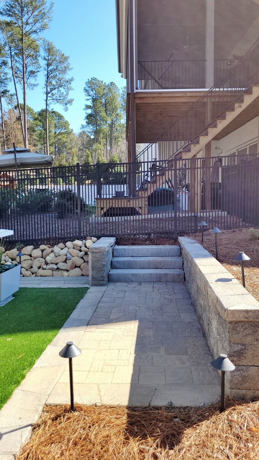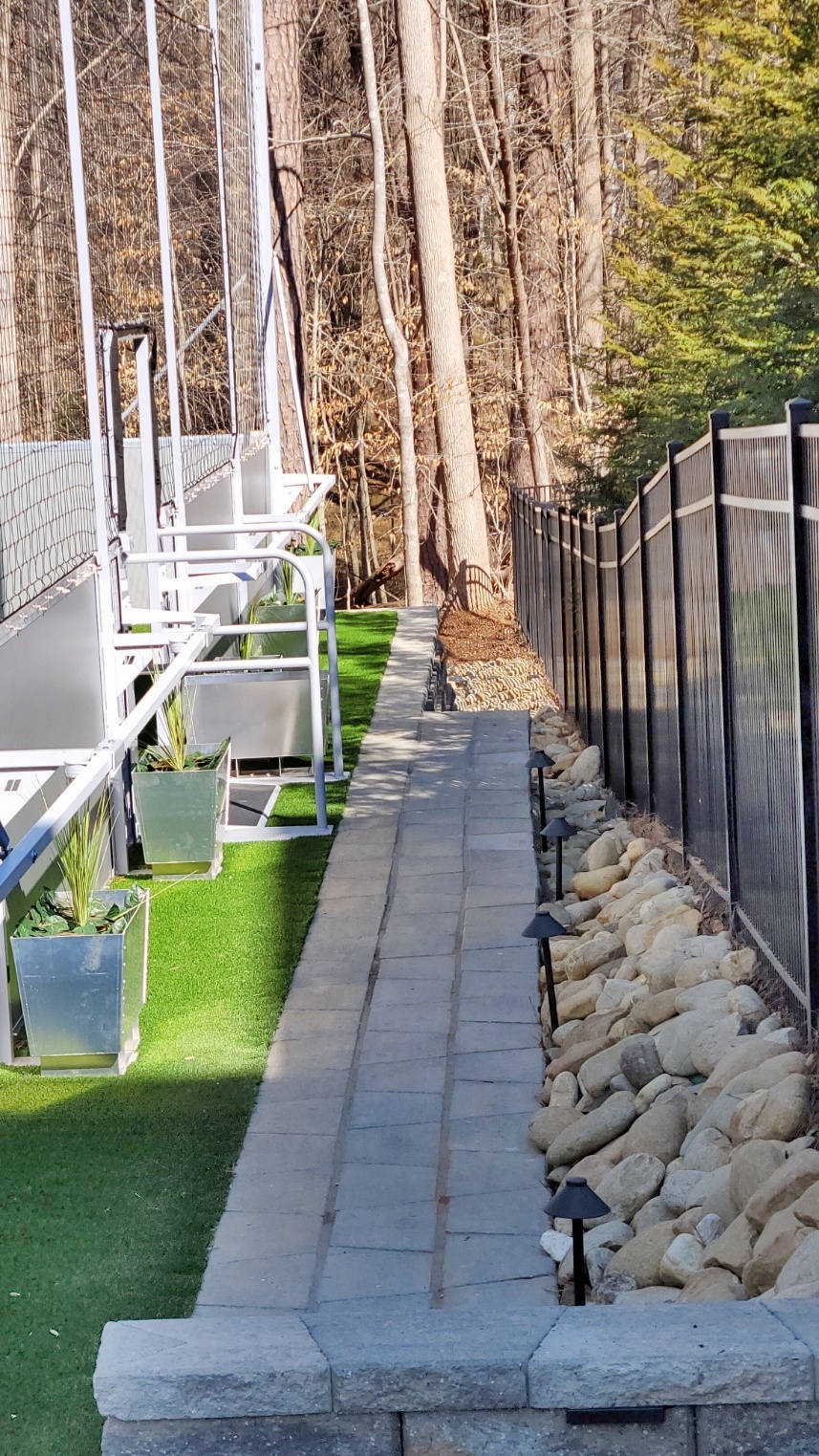 This is a 30′ long Hatteras Lafitt paver sidewalk, with 6 grey solid slab steps to connect the sports court to the existing fence gate and the rest of the property. The lights are hat style, part of an LED low voltage lighting system around the walkway and court, providing night time safety and accent lighting.
