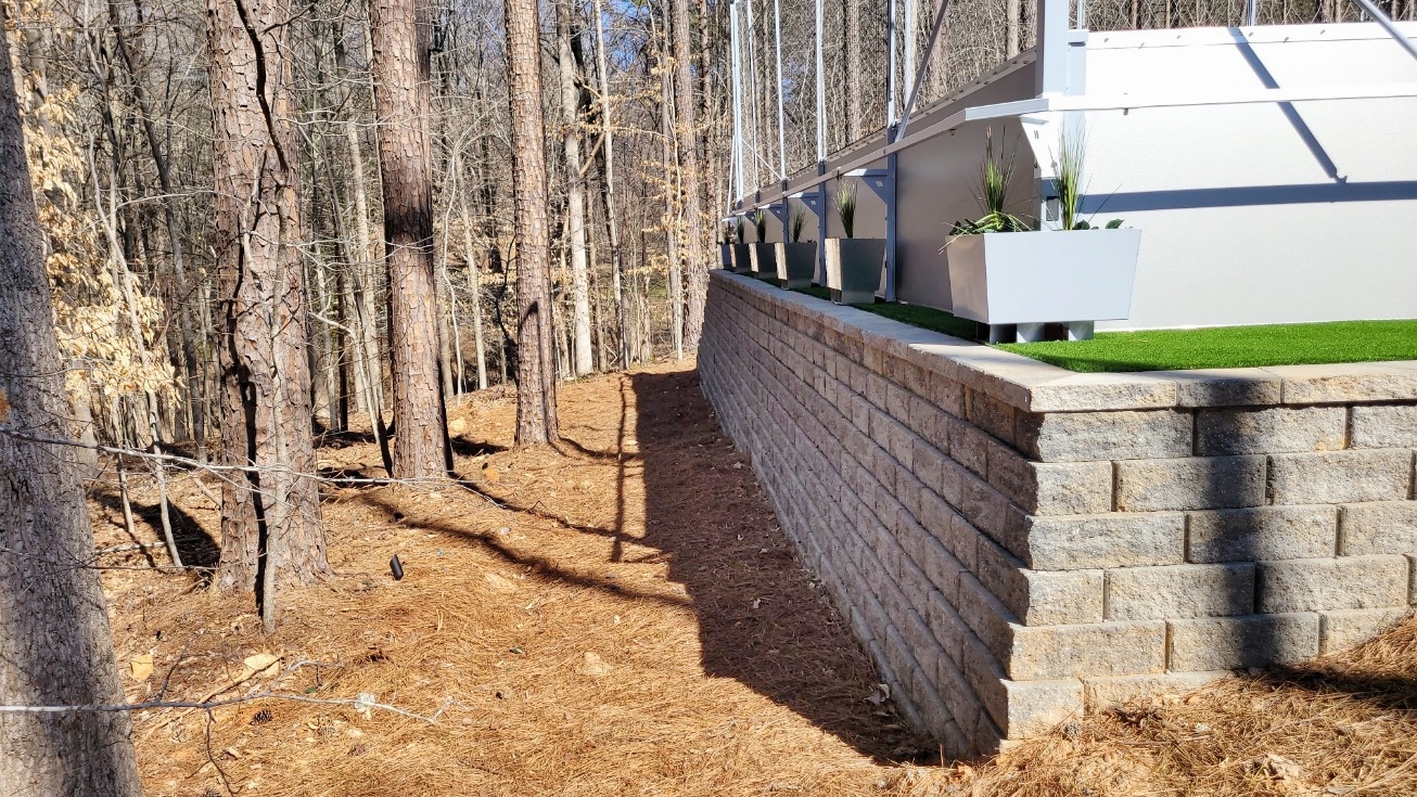The court is on a graded backfill of crush and run, held together by a sturdy Oxford Grey Diamond 9 D retaining wall for maximum durability and stability of the playing field.