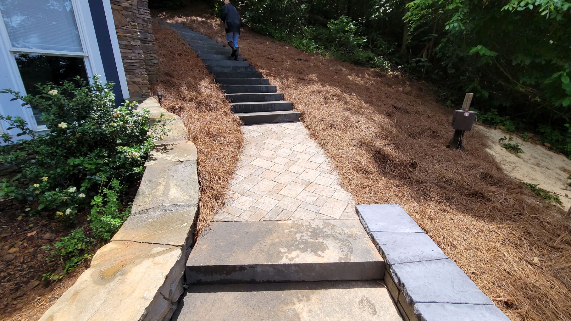 Going up the hill on the side of the house to the driveway, our crews installed a 66′ long Summit Lafitt paver sidewalk, including 20 more Blue Iron solid slab steps to mitigate the gradient.