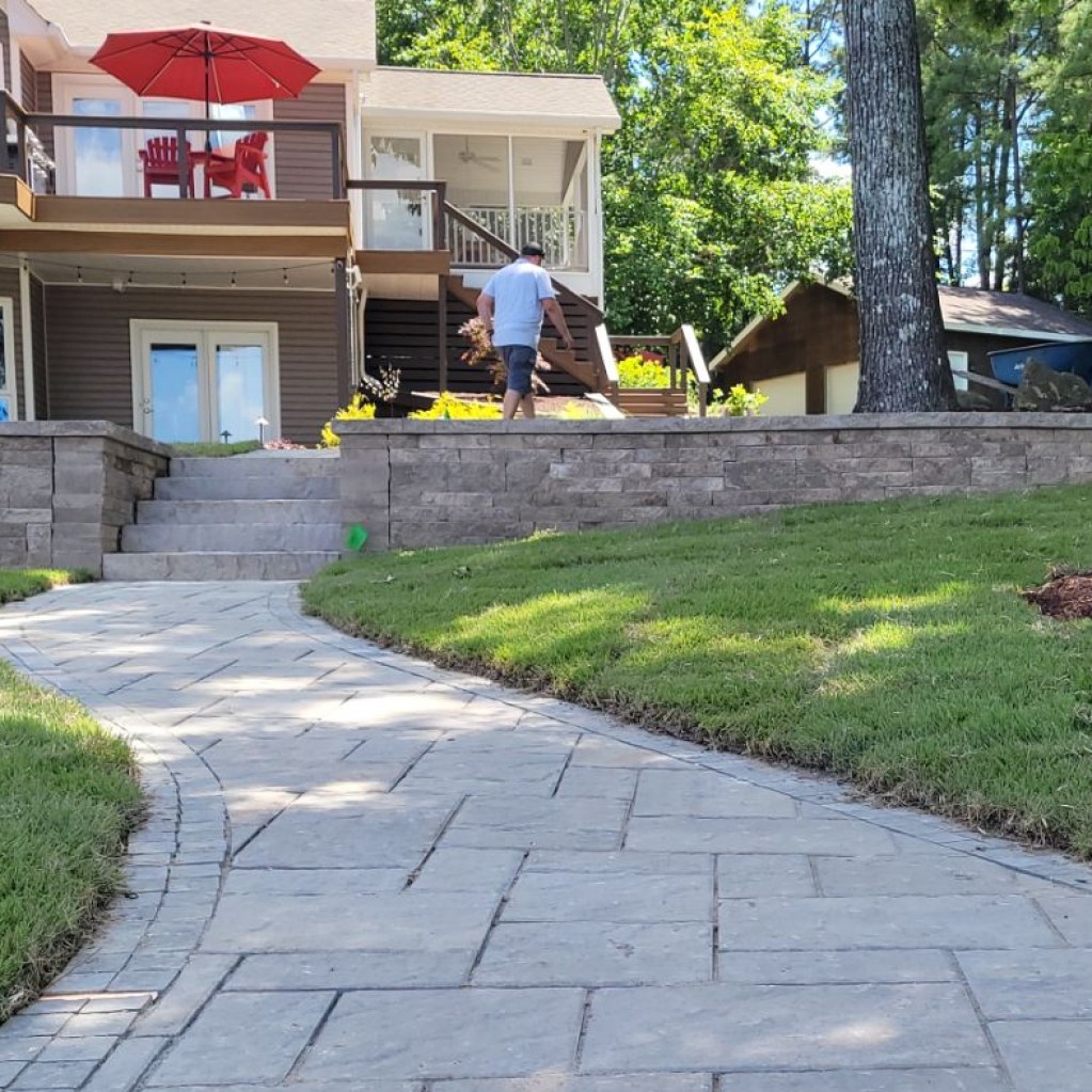 Here is the Techo Bloc Champlain Grey Blu paver sidewalk we built, connecting the retaining wall and steps with the dock.