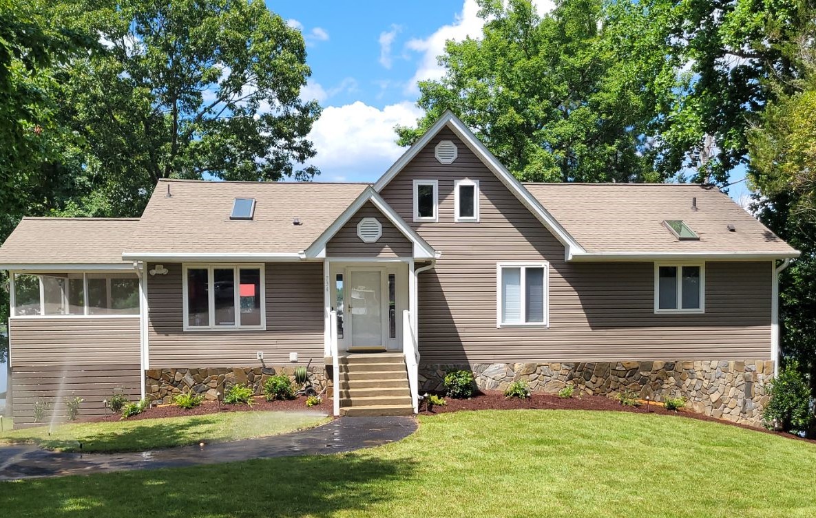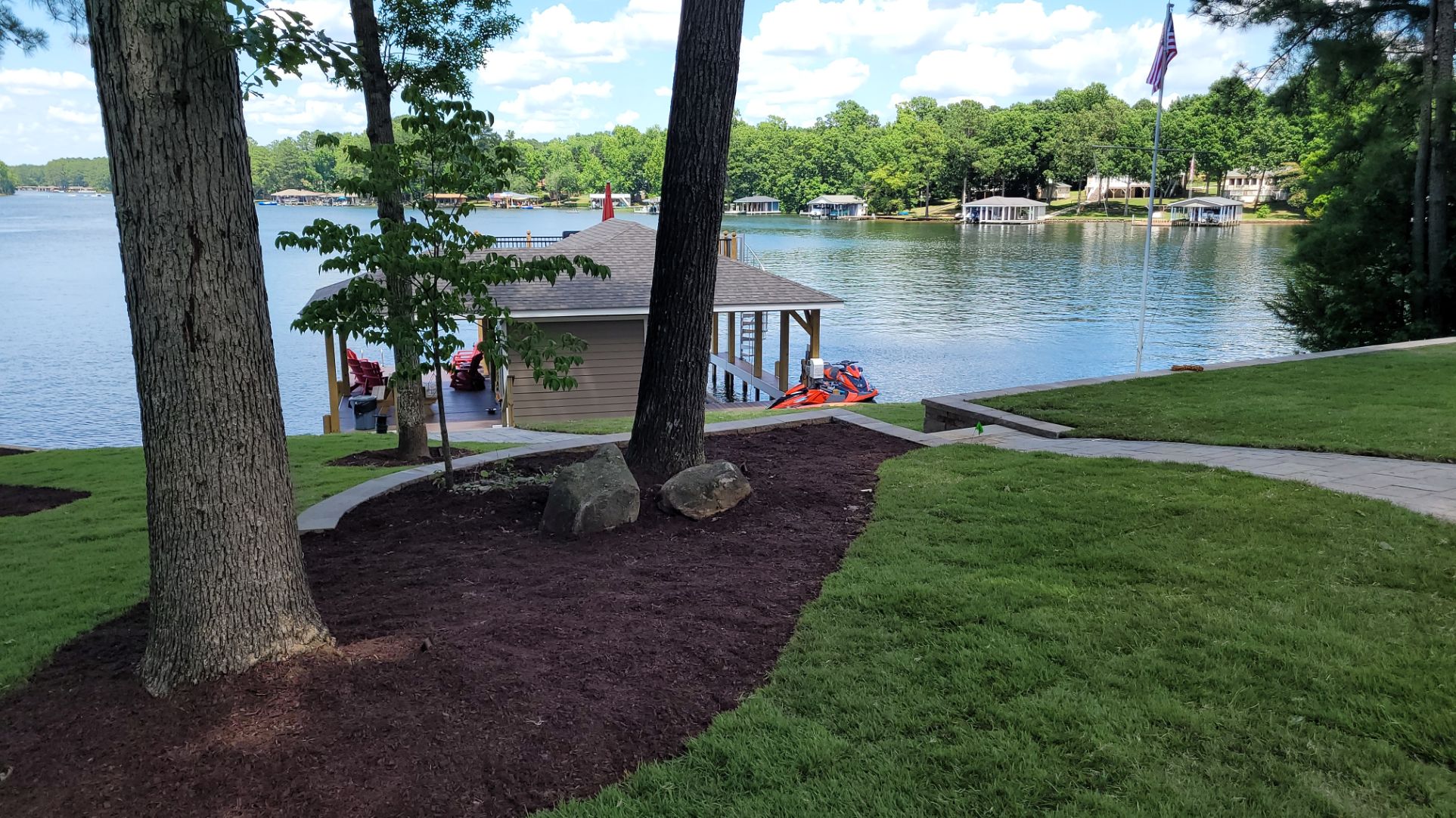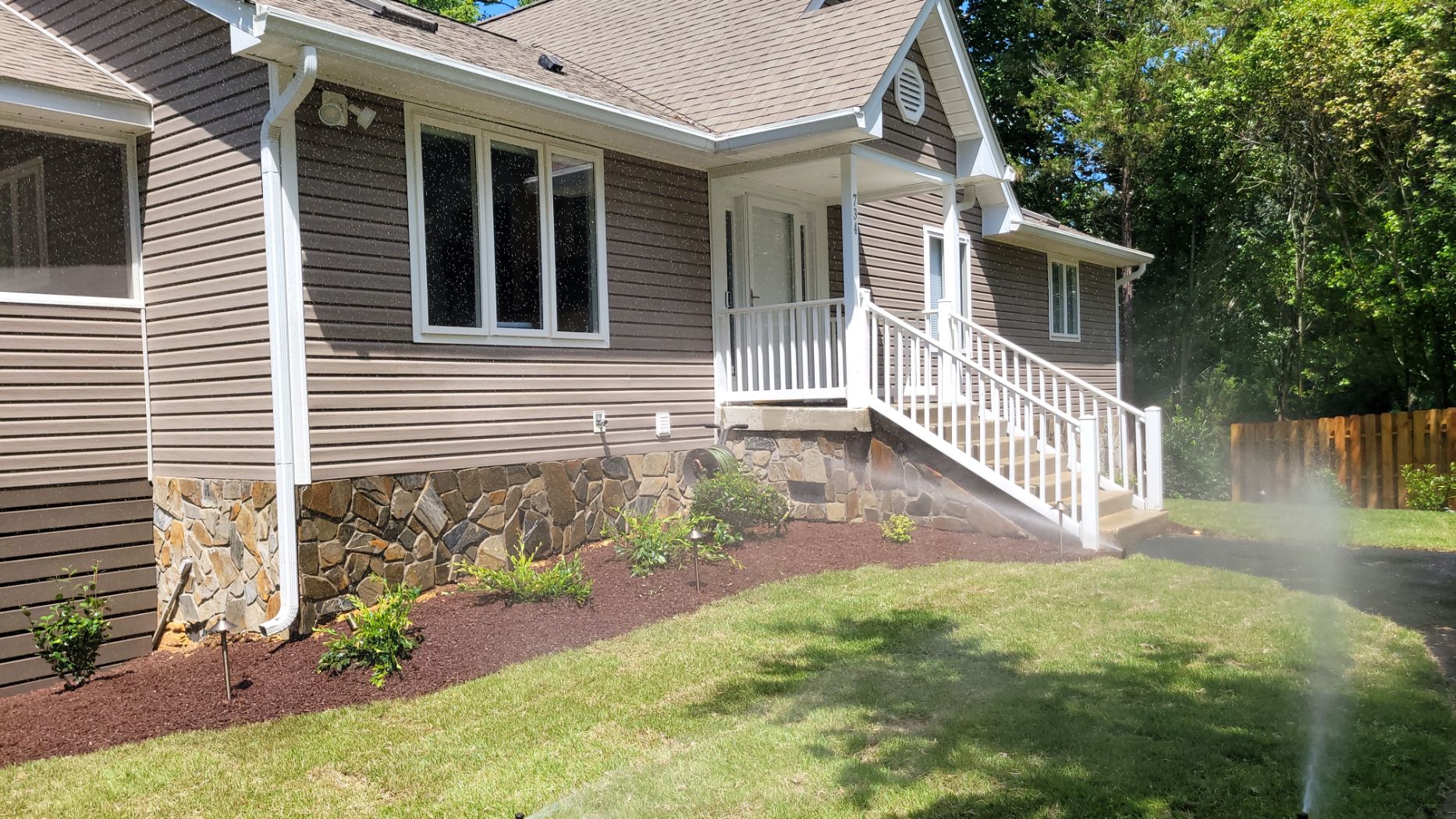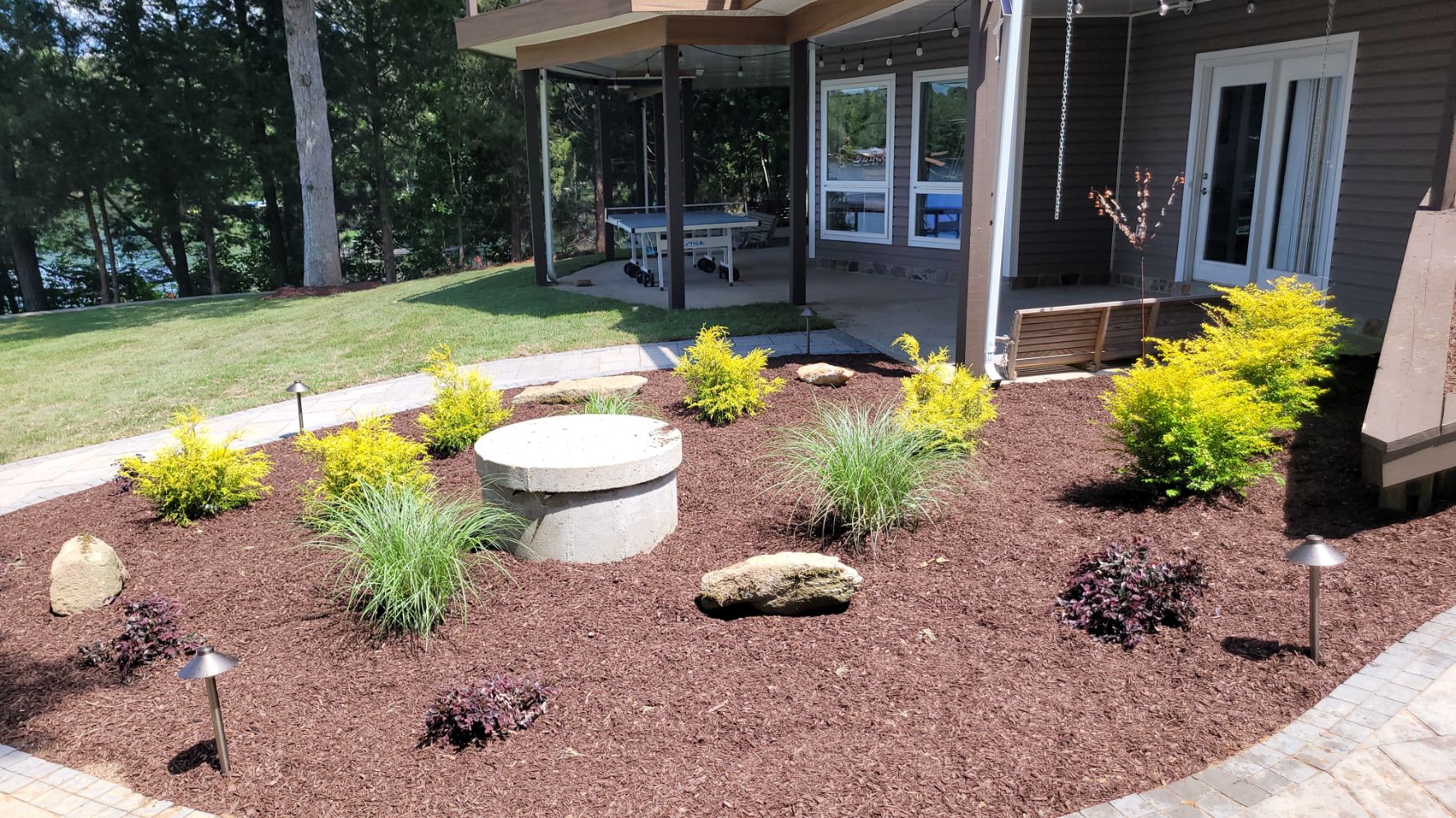 Some of the plants you see here are Miscanthus, Sunshine Ligustrum, Wintergem Viburnum, and Dwarf Burgundy Lorepetalum. We also installed a Weeping Japanese Maple, and along the front foundation Vintage Jade Distyllium, Gold Mound Spirea, and a Nellie Stevens Holly, among others. All beds were freshened up with Dark Walnut Shredded mulch.