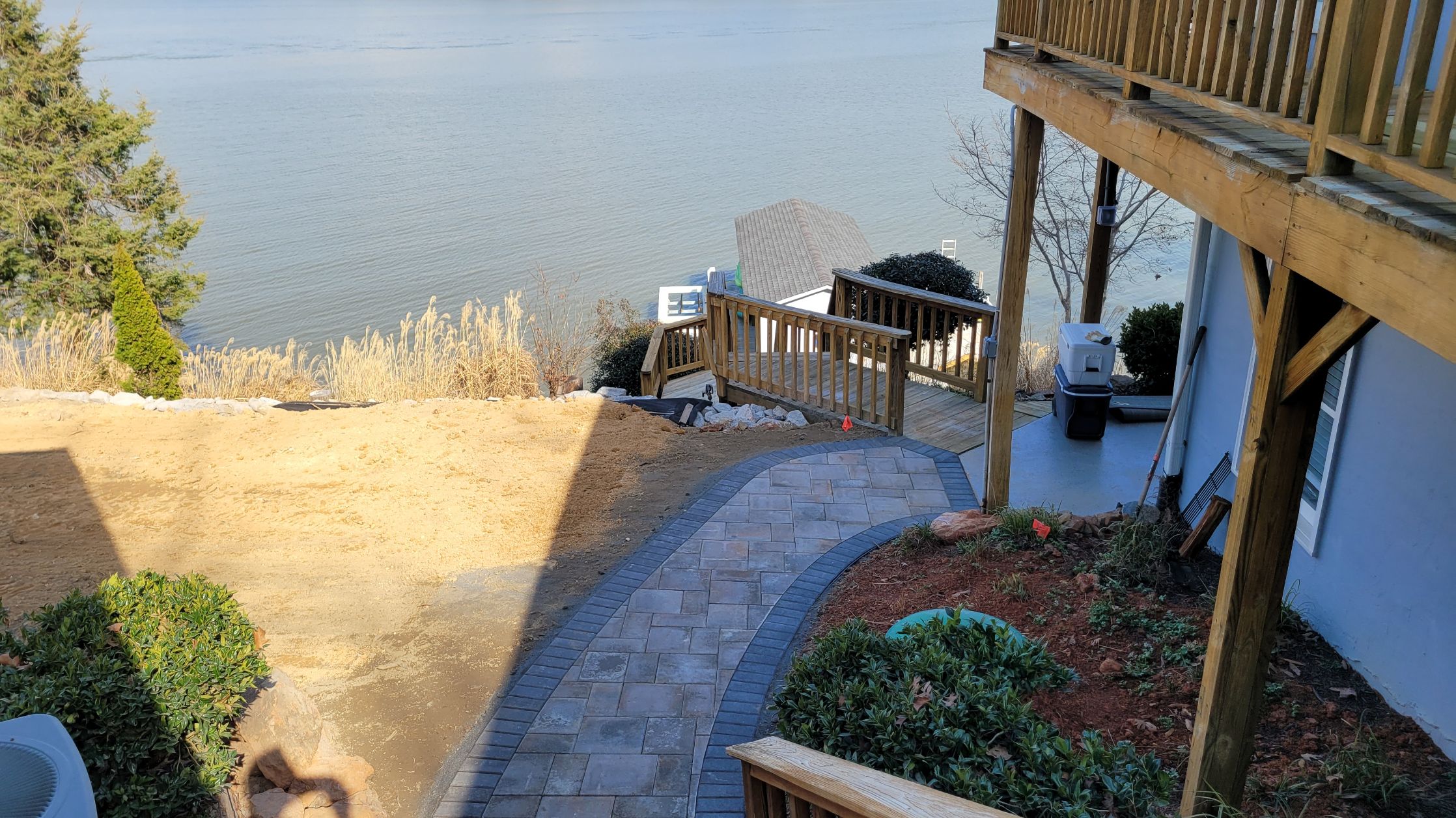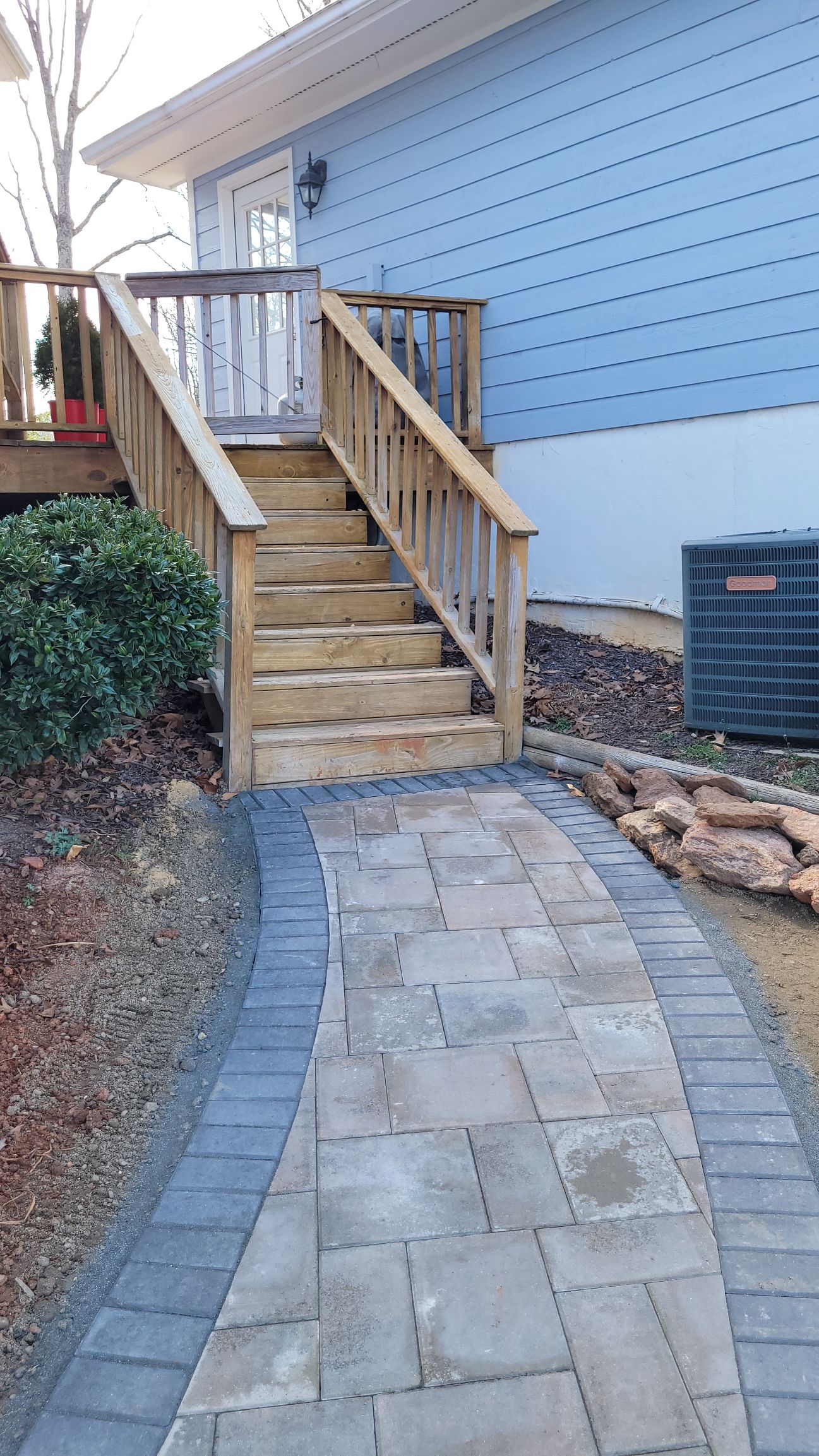 We can do the big project – complete design & installation of lawns and gardens, walkways and patios – but we can also go small, like for this customer where we only supplemented his contemplated lawn and garden work with this stone paver sidewalk and a dark grey accent border.