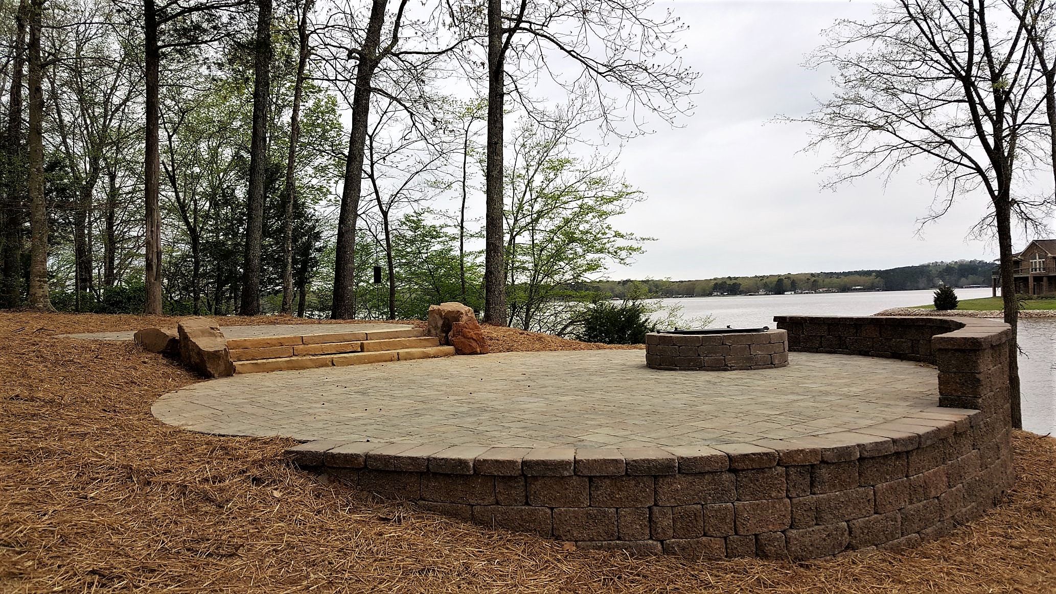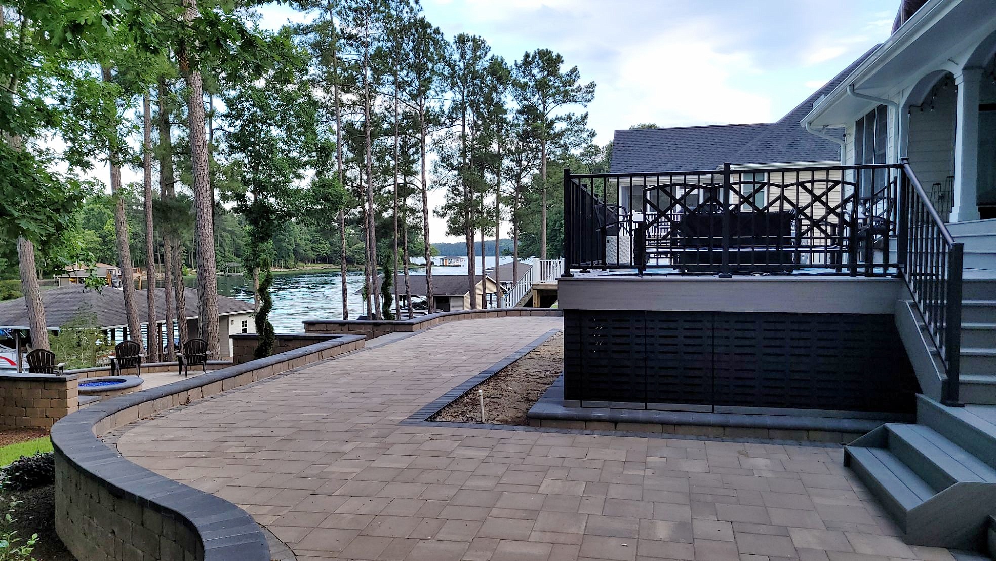 A Fire Pit patio composed of River Street Lafitt pavers and a Slate Grey Holland Stone accent border, surrounding an existing hot tub – with a view of the lake, posted in Finish in Style and Maintenance Plus Patio.