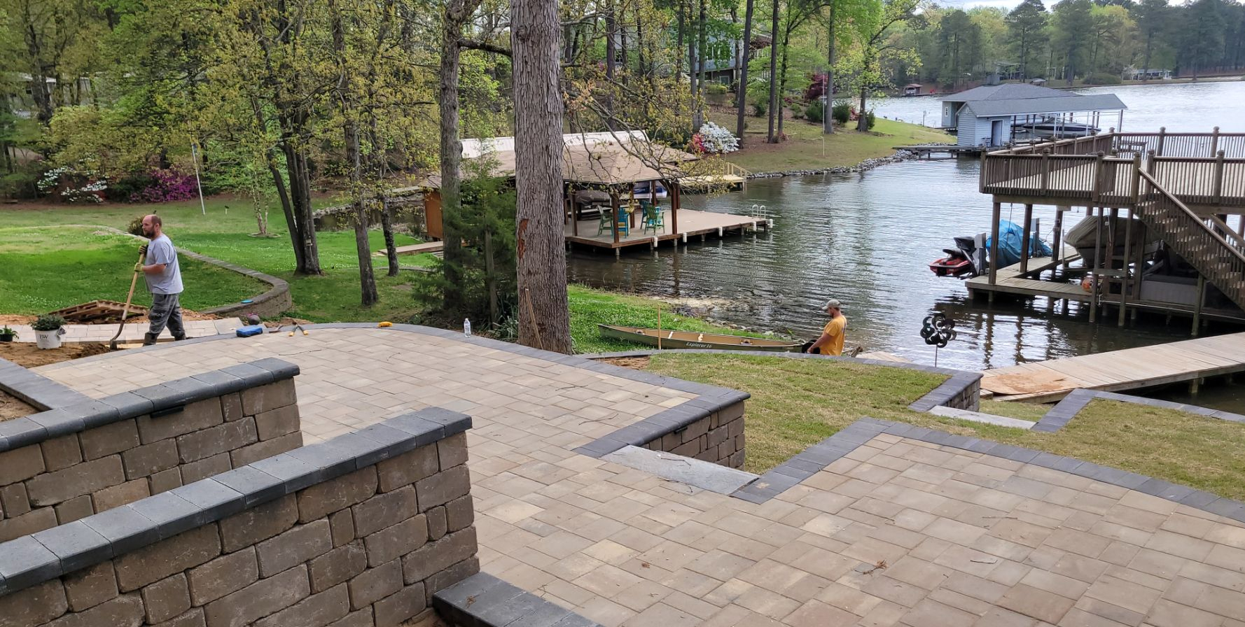 Lake access walkways? Here’s one we did, longer than a football field. This is a River Street Laffit paver walkway with Lincoln Creek stone slab steps augmenting it at three places along the way, posted in A Long Walk, A Walk to the Lake Continued, and Walkway to the Lake.