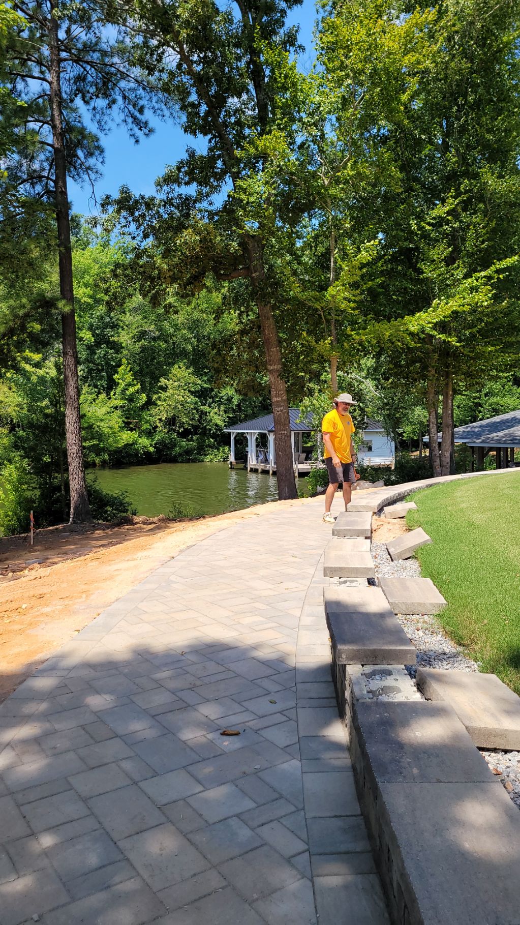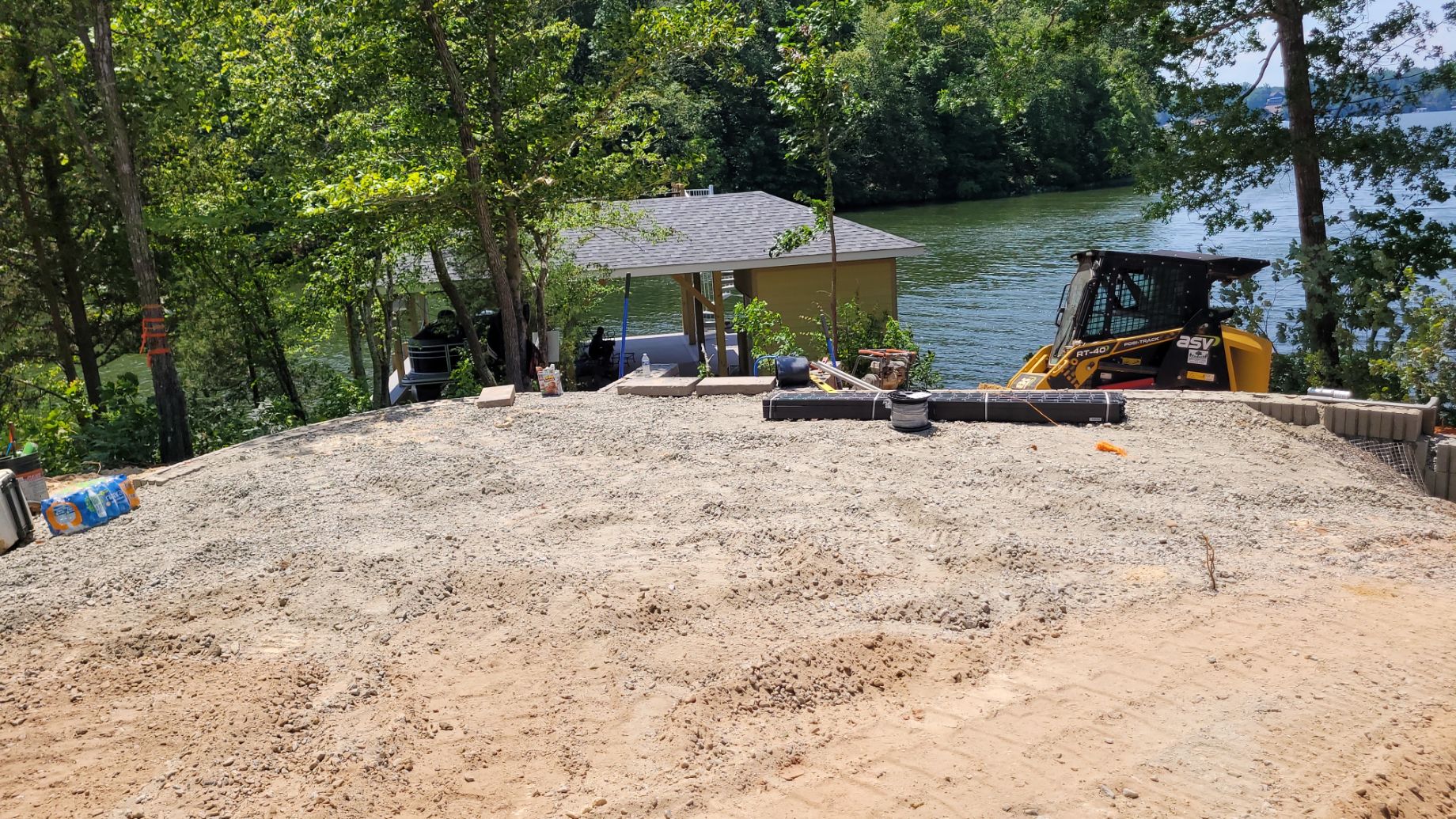 This entails at least three retaining walls supporting the stone structures. Two parallel the golf cart path on the upper and lower sides; and then a third wall will support the patio at the secondary boathouse.