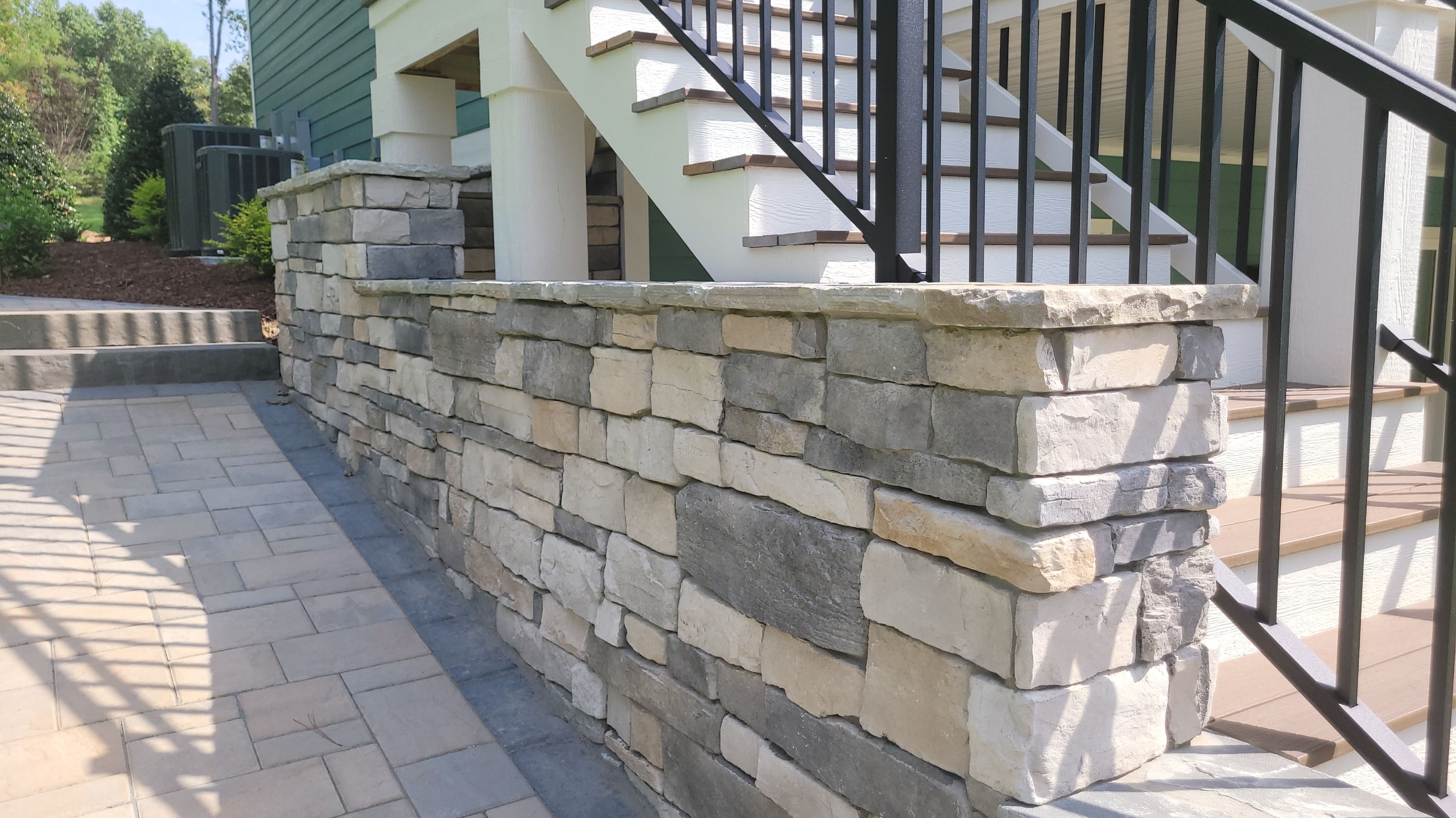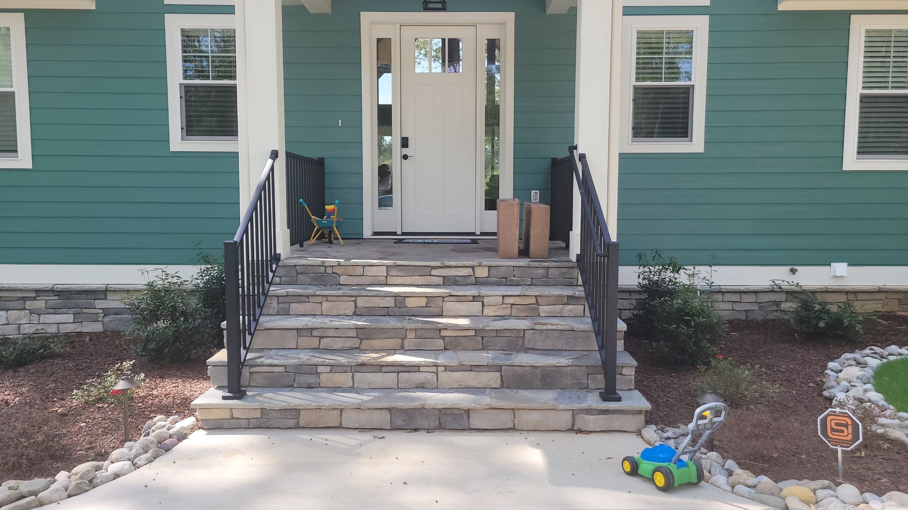 All walkways and patios are Techo Bloc Eva Champlain Grey pavers with Slate Grey borders. Along the foundation you see Vintage Jade Distyllium, Cleyera, Drift Rose, Dwarf Burgundy Loropetalum; and at each corner of the front we installed specimen Nellie R. Stevens Hollies.