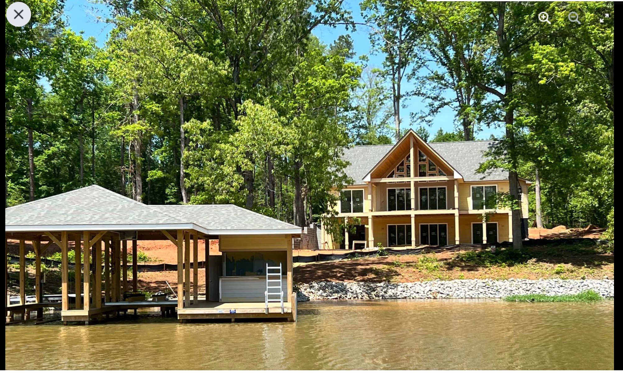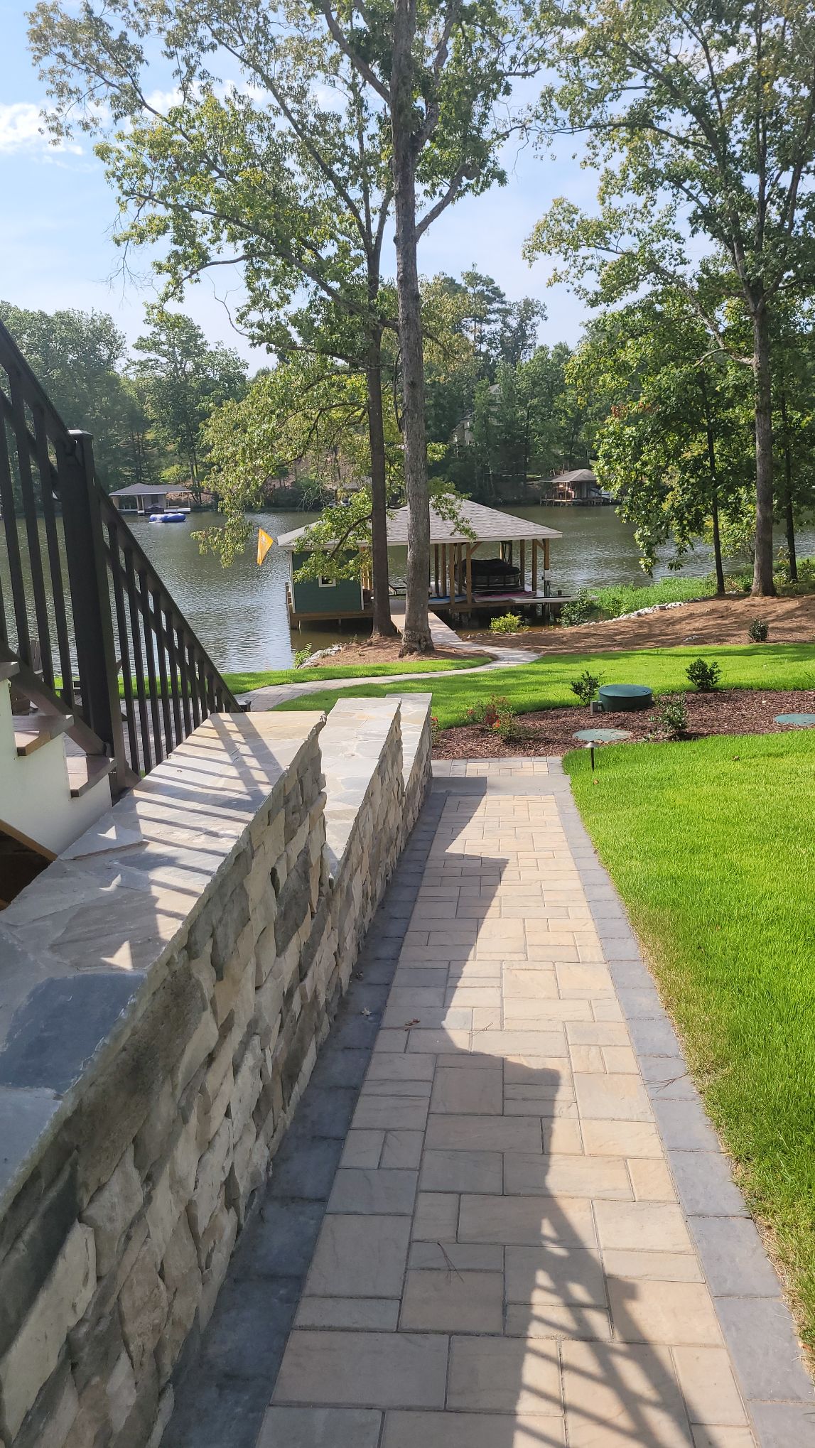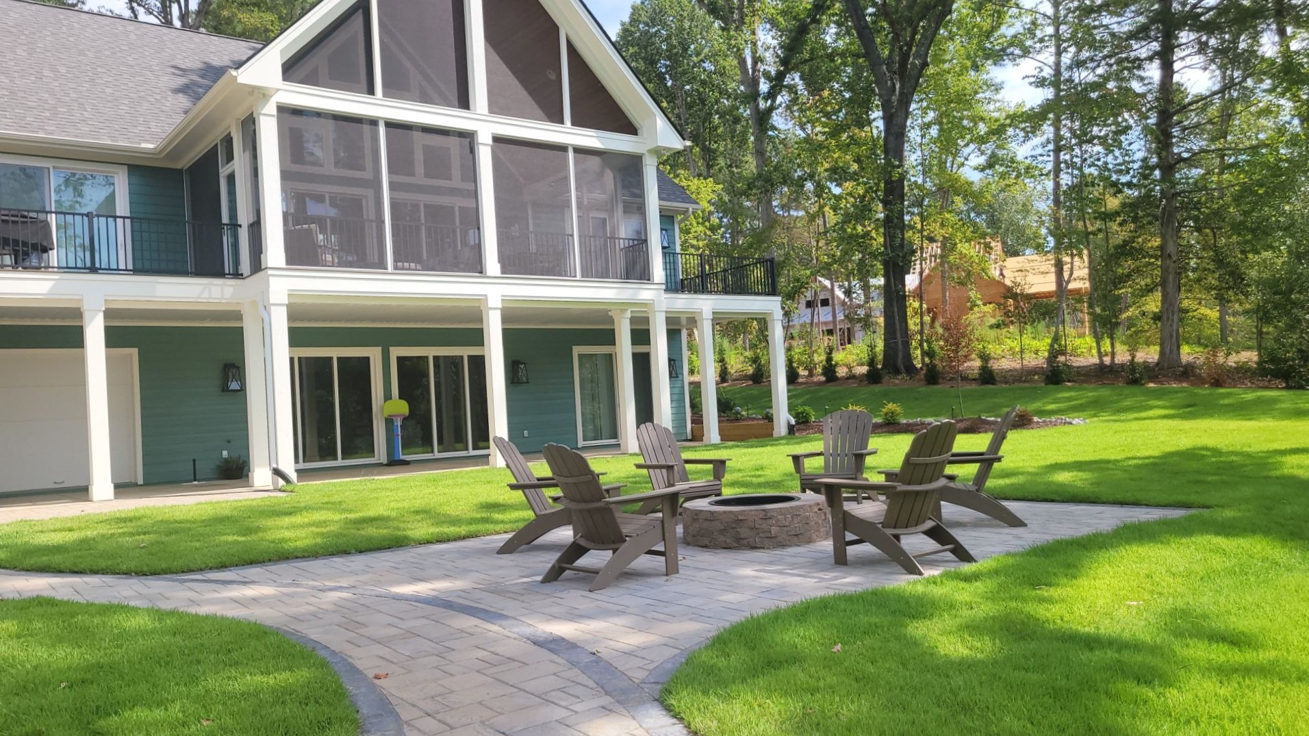 The Lakefront features a small grilling patio off the lower porch, a firepit patio, and a connecting walkway to the boathouse.