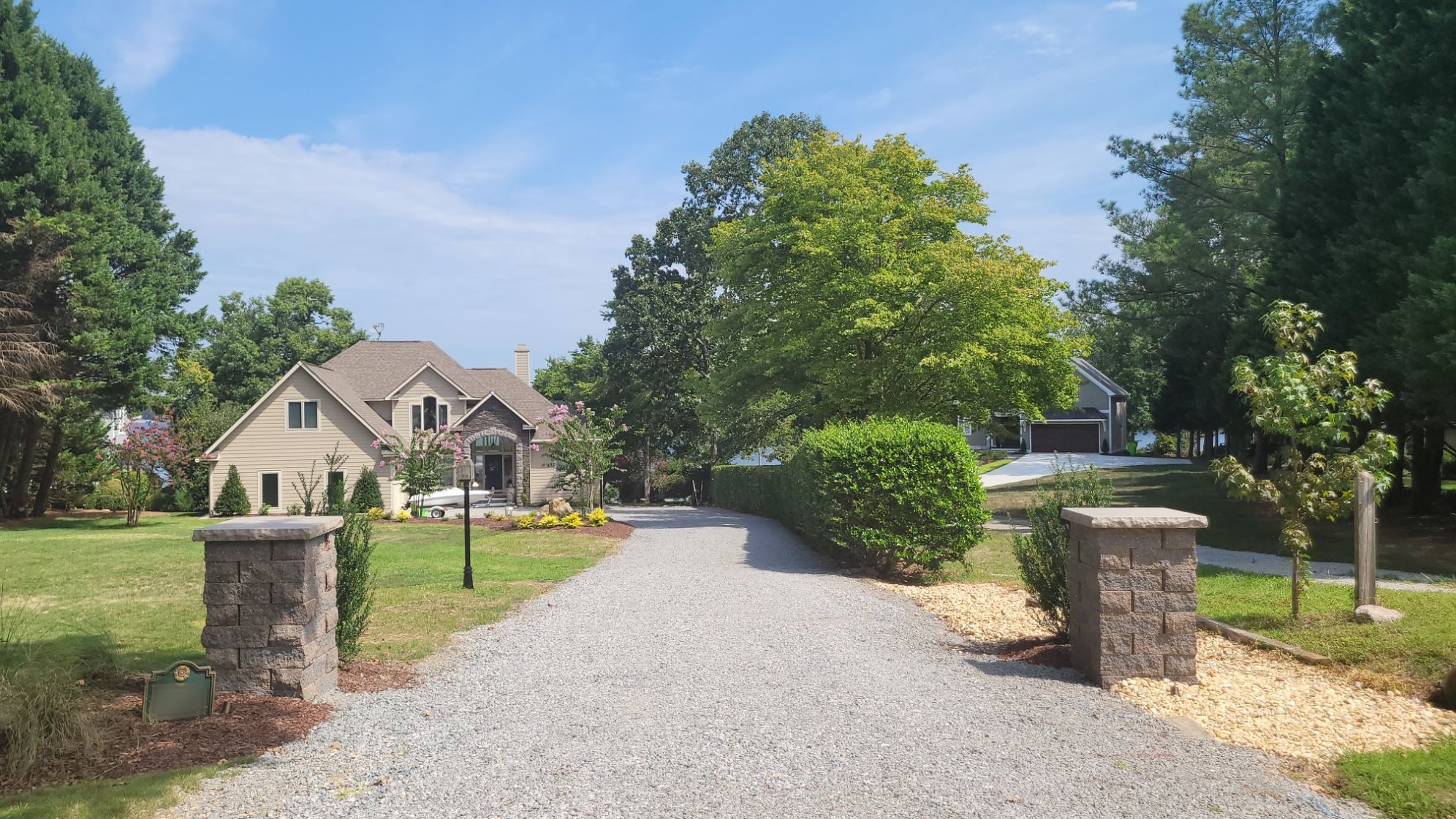 Our first order of business was two stone entrance columns, guarding the drive. These columns are Timberline Highland stone with dark grey caps. We also cleaned out the area up to the hedge and covered it with washed river rock.