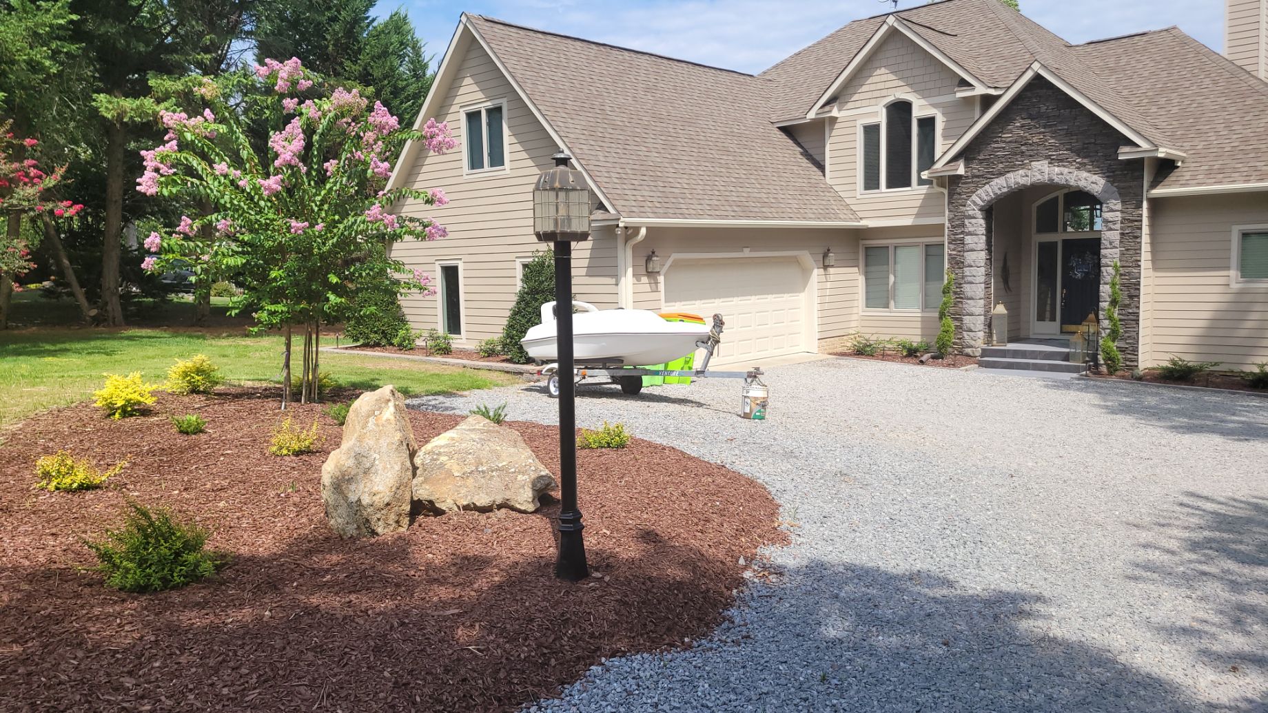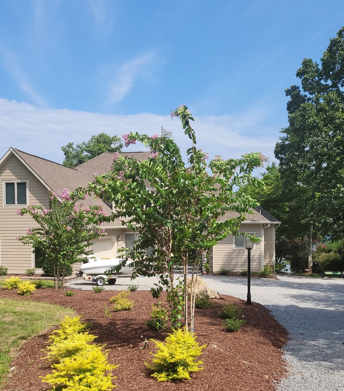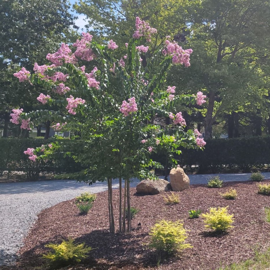 In this new garden bed, we installed two pink Crape Myrtles, Sunshine Ligustrum, Duke Garden Yews, Kaleidoscope Abelias, and the ever-popular decorative rocks, all set in Dark Walnut Shredded mulch.