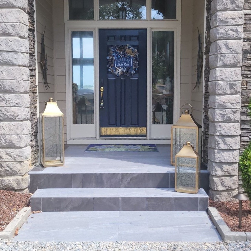 We edged these foundation beds with some 64 feet linear feet of Champlain Grey Pietra stone and installed two striking Spiral Topiary, Vintage Jade Distyllium, Cleyera, and Hydrangea.