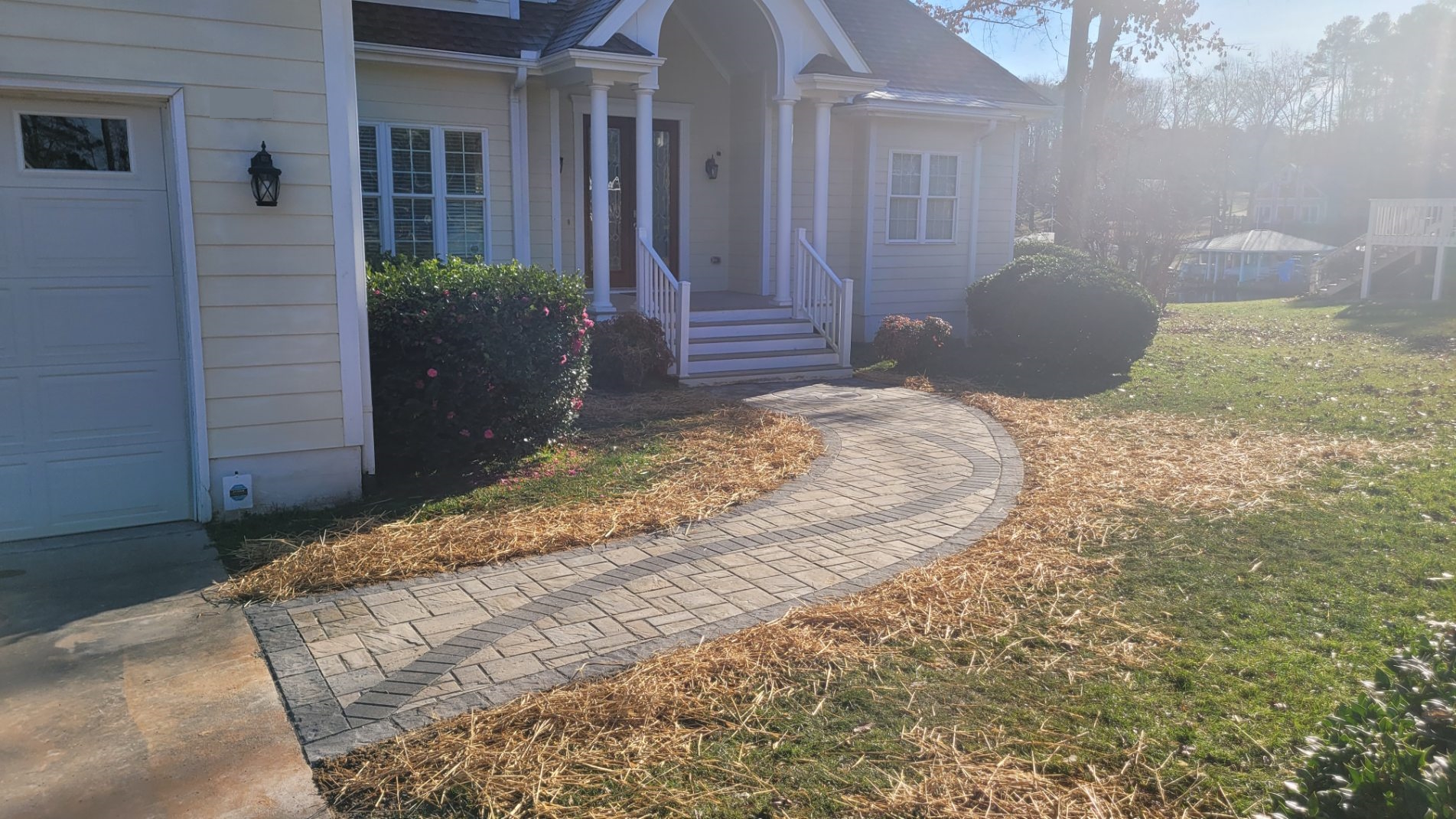 It is a Techo-Bloc Champlain Grey Eva paver with a 6×13 Blue 60 Onix Black border, which is elegant enough as it is. But our artists in residence customized it further for this customer with an eye-catching swoosh of Belgard Holland Slate Grey pavers and a Compass Rose inset at the front steps.