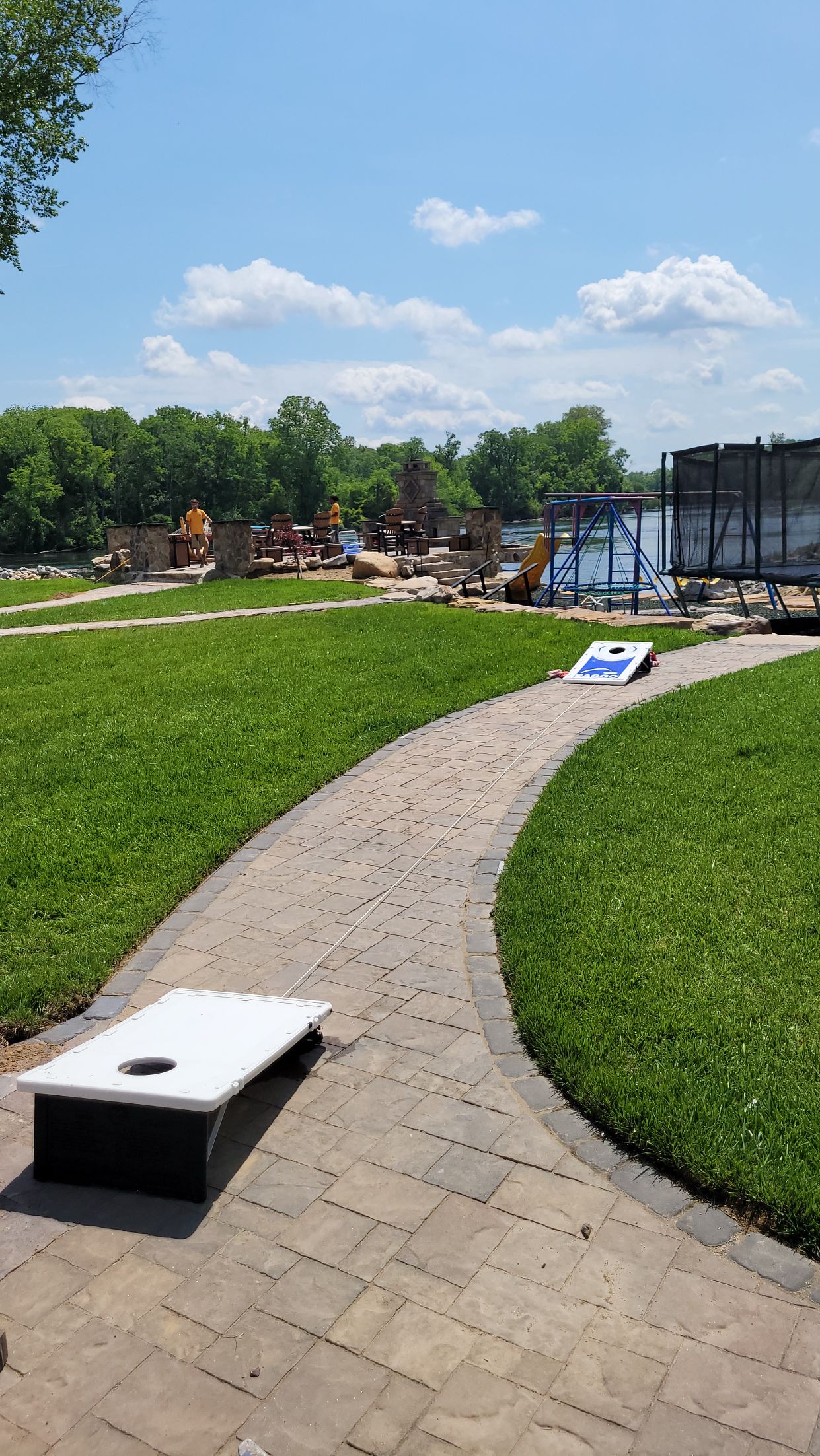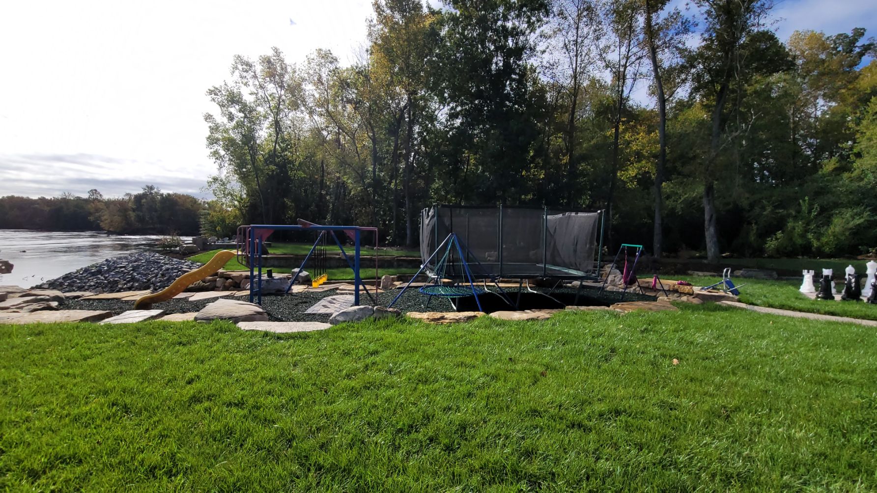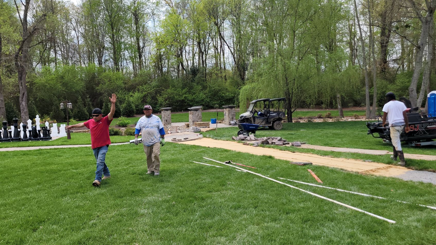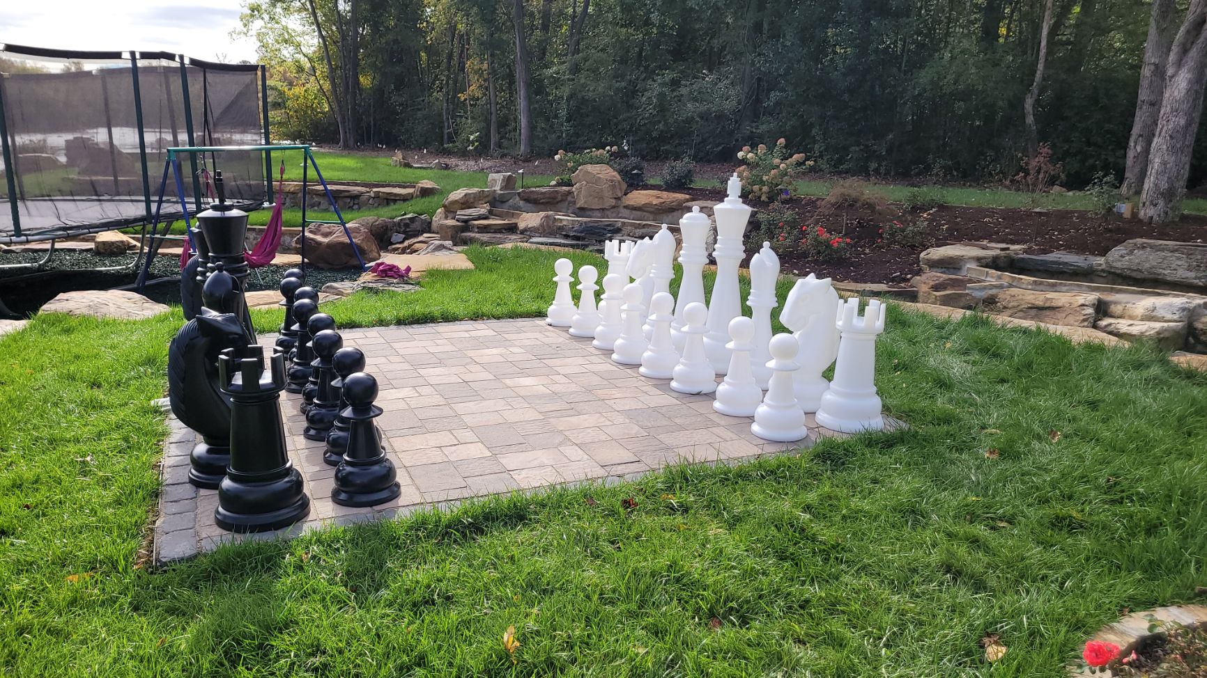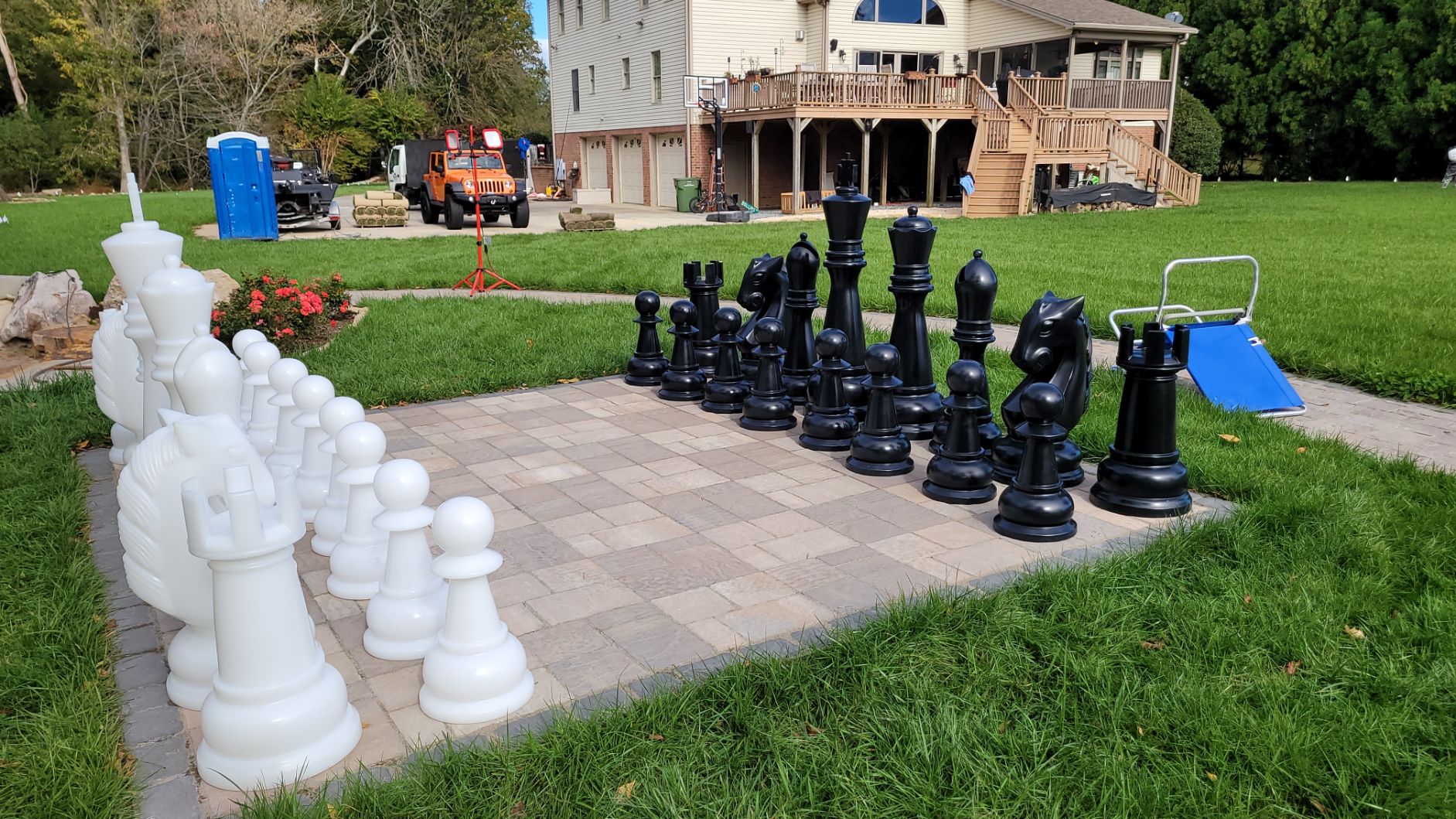 The scale of this project is such that we can only approach it in two posts. This first post will present our work on the front and back yards, which mainly involved the installation of sod and an irrigation system, along with some accessory paver work, pruning, and other maintenance work. As you will see, the backyard also included work on a playground with innovative additions by our crews of a life-sized chess board and hopscotch game made entirely of stone pavers.