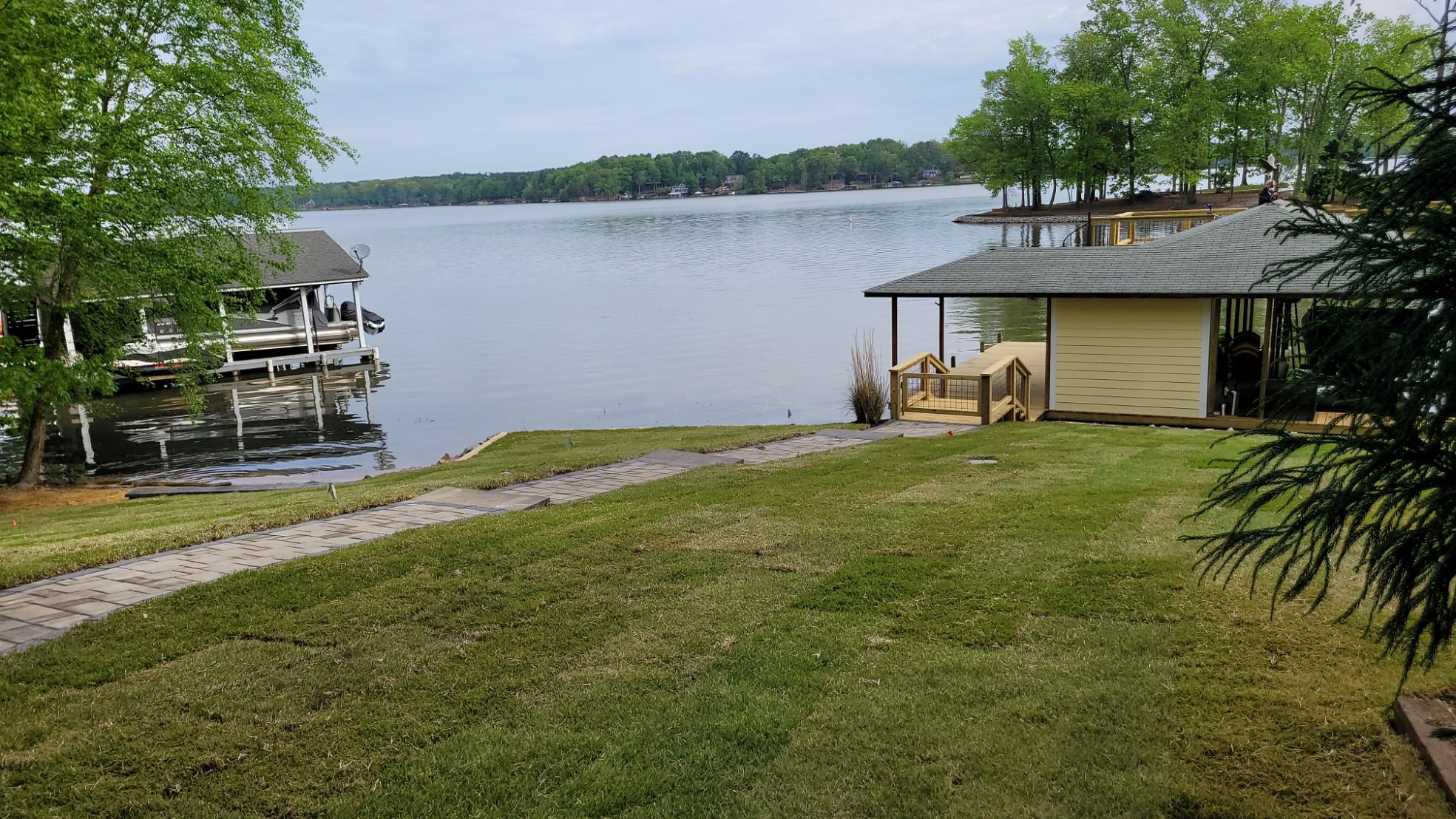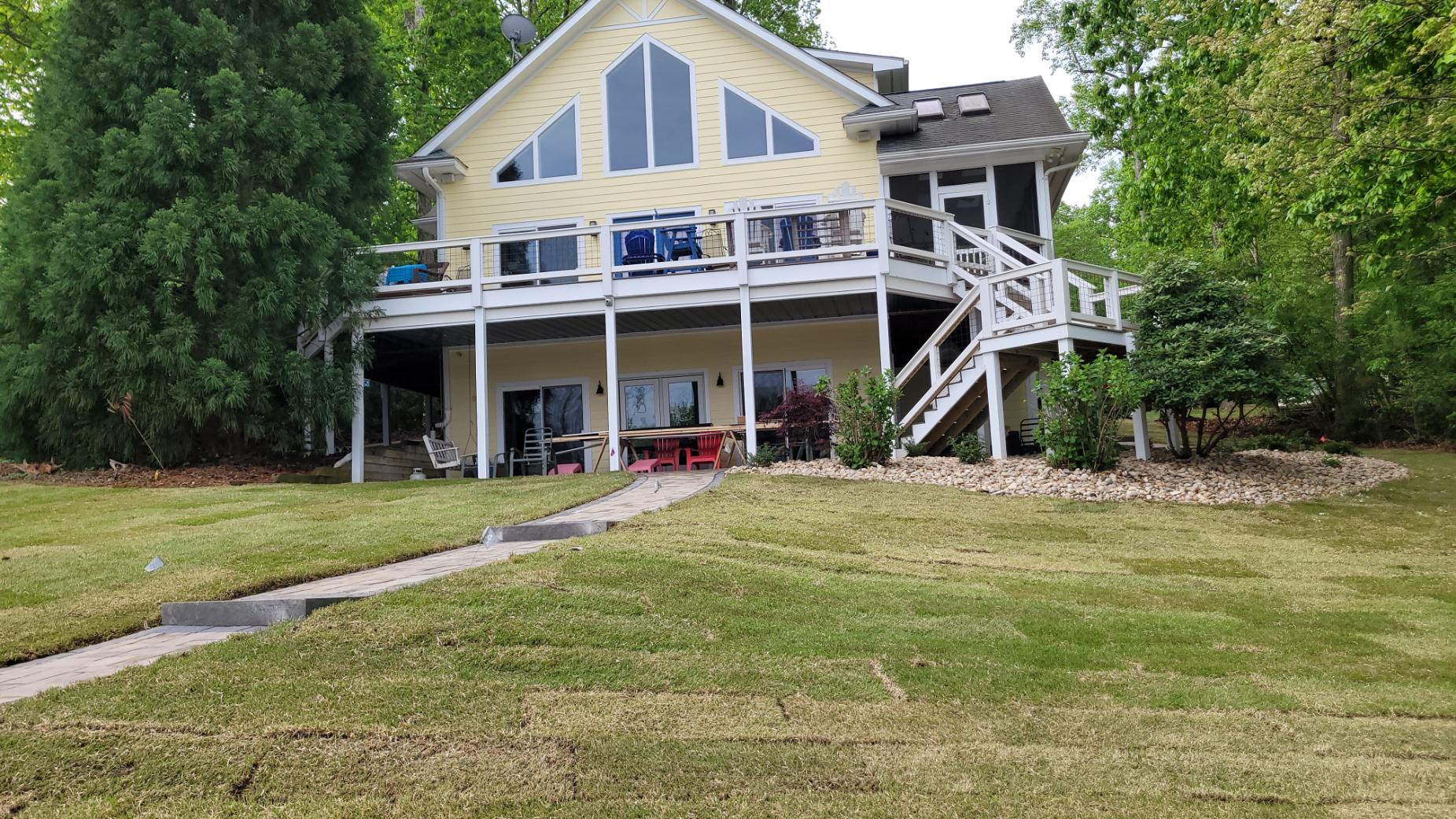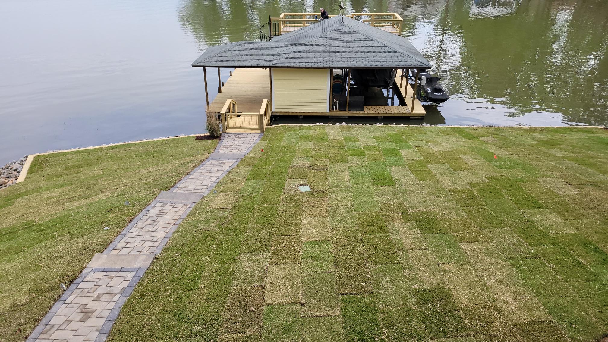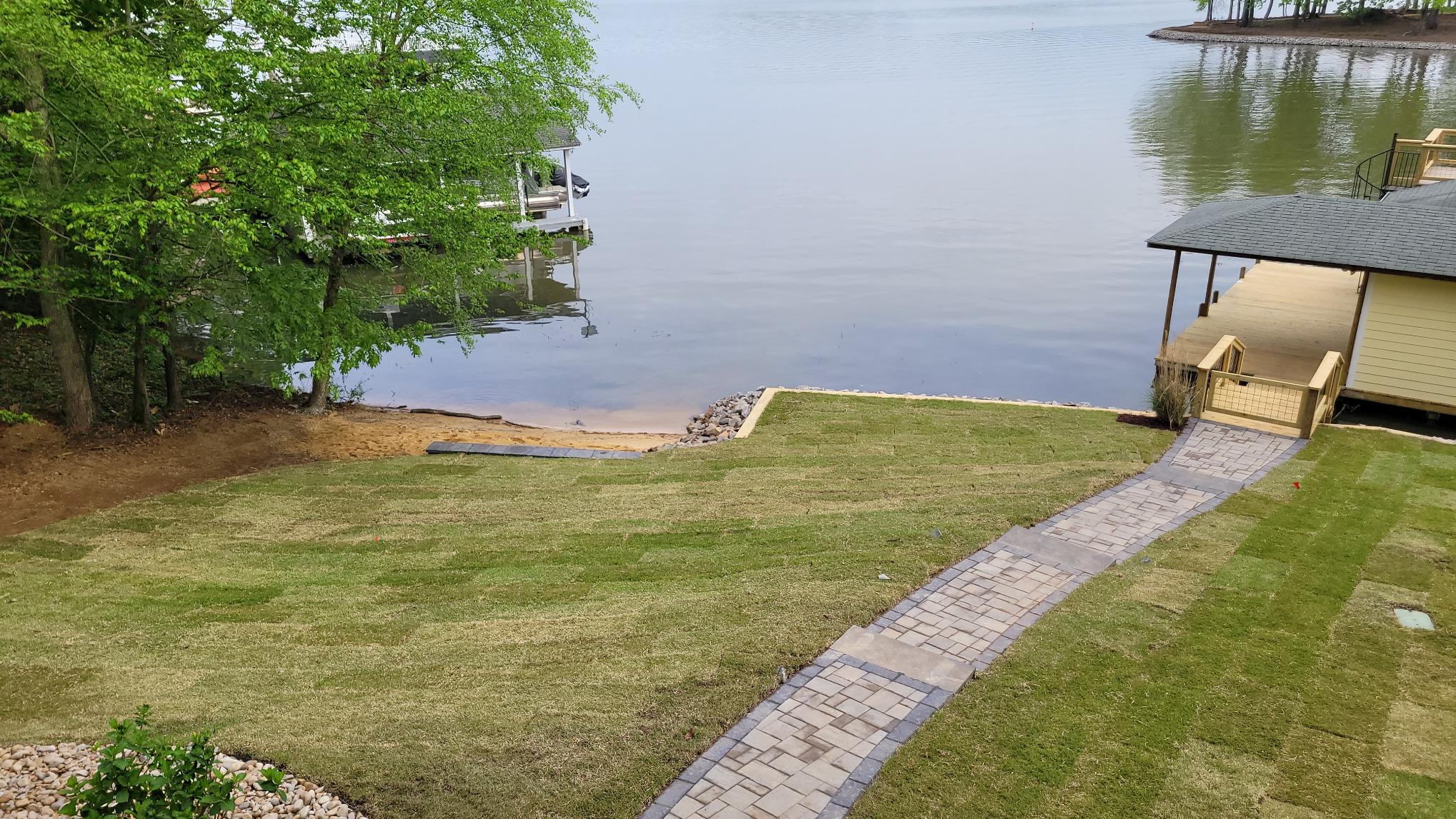 This is about 9,000 sf of Compadre Zoysia sod. The walkway is a 90′ long Champlain Grey Eva paver with a dark grey accent border. We inserted four dark grey solid slab steps to mitigate the slope down to the boathouse.