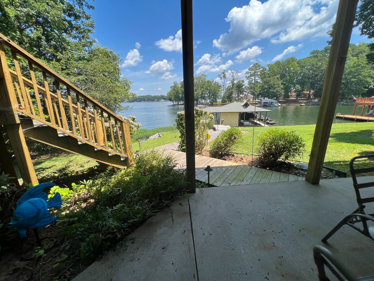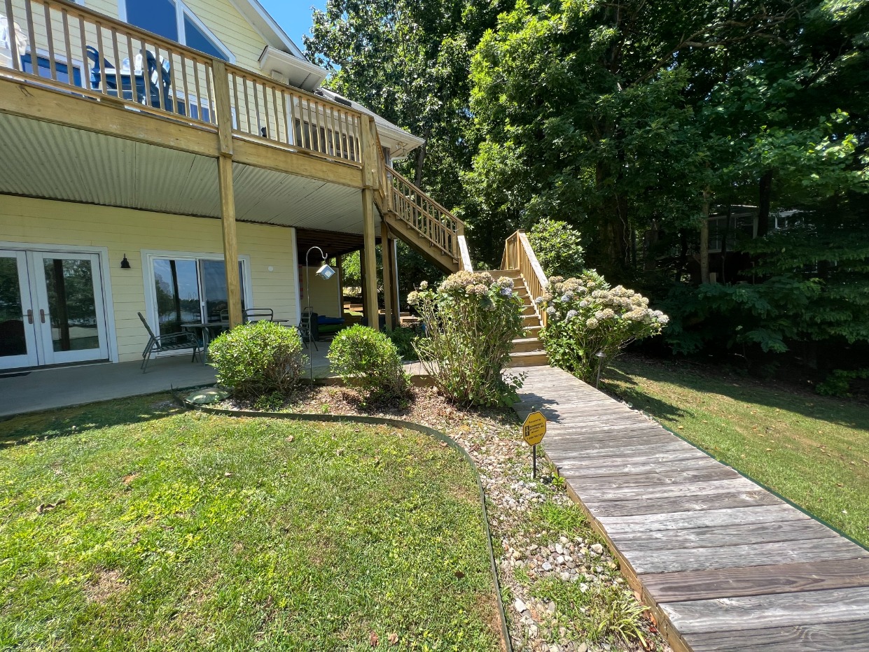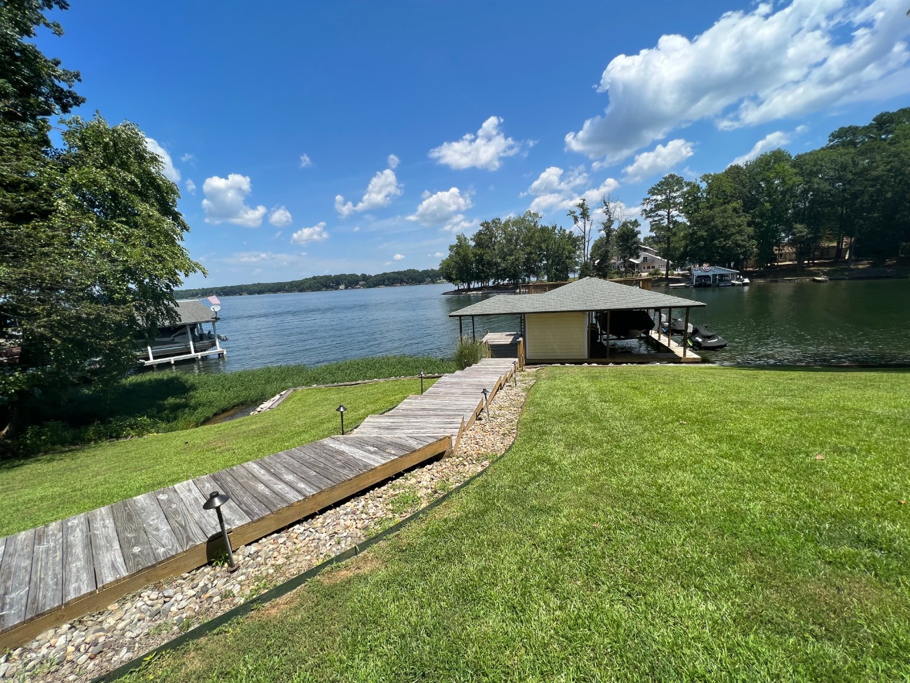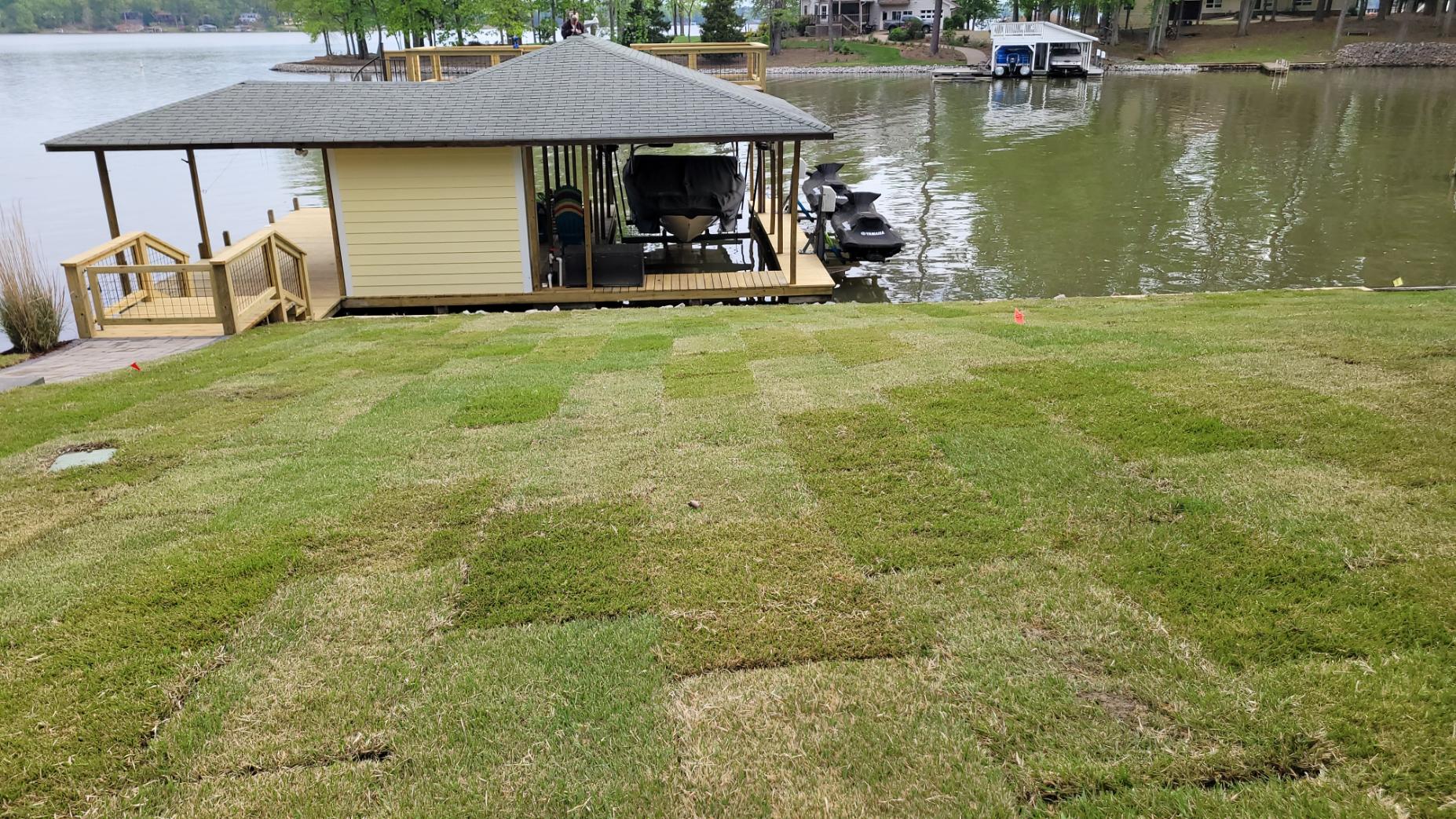This is about 9,000 sf of Compadre Zoysia sod. The walkway is a 90′ long Champlain Grey Eva paver with a dark grey accent border. We inserted four dark grey solid slab steps to mitigate the slope down to the boathouse.